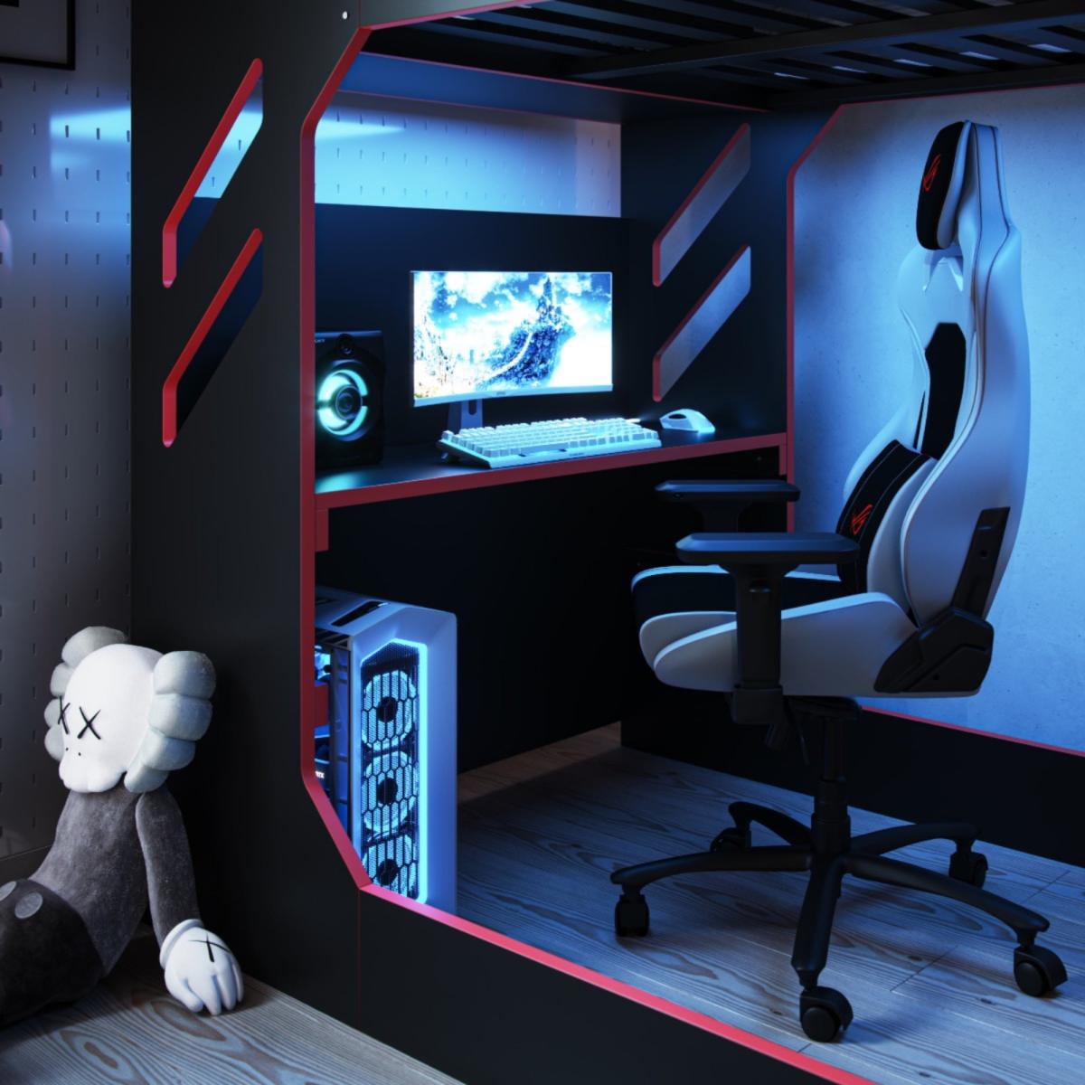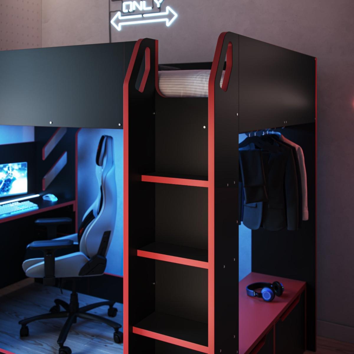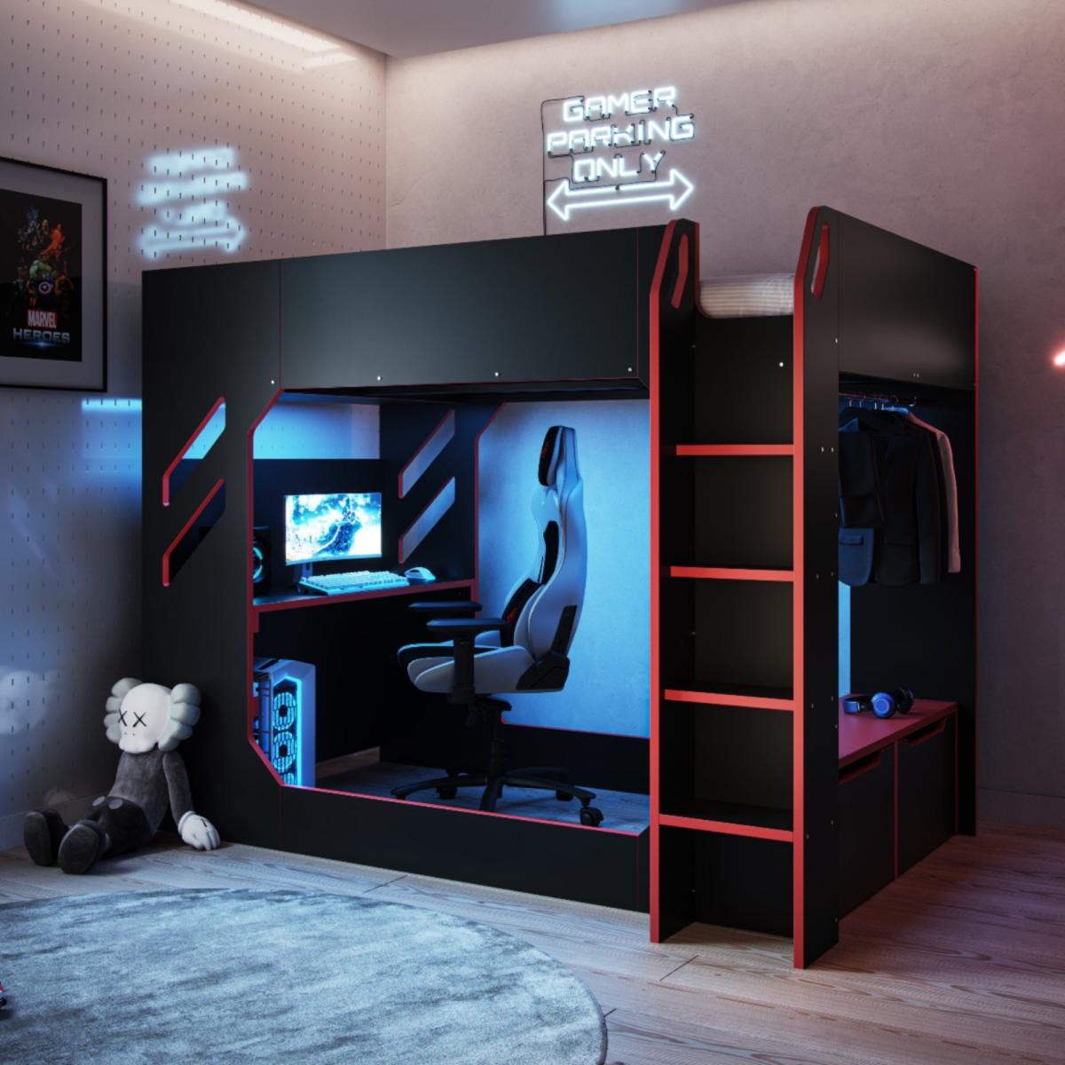 * Gaming bed* Built in desk* Left or Right placement* RGB LE Ds This sleek and stylish bed is designed with serious gamers in mind, featuring a versatile desk area that can be adjusted for a laid-back gaming session or raised to standard height for those intense gaming marathons. The entire frame is crafted from thick wooden particleboard, making it resistant to scuffs and marks, ensuring durability over time. For flexibility in fitting your room's layout, the ladder can be assembled on either the left or right side. The Recoil Shuttle doesn't just stop at a functional design—it also includes a vibrant RGB LED desk area that supports a TV or monitor, ample underbed space for a chair or beanbag, and two large pullout drawers perfect for storing clothes or electronics. Additional features include a hanging clothes rail, a spacious hydraulic-hinged storage box at the top, and large, easy-to-climb steps leading up to the cosy sleeping area above.