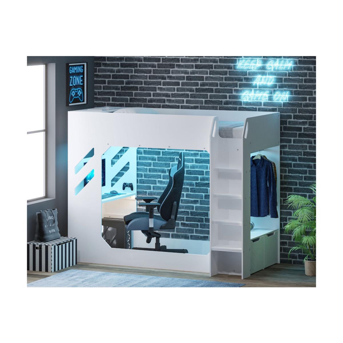 Calling all gamers!Do you have a child or teen that loves playing online games Why not introduce them to the Recoil Shuttle High Sleeper in White The sleek and stylish colour scheme is sure to be a smash hit for any serious gamer as the whole frame has been intricately designed to fit the needs by including a desk area that can be placed lower for a more laid-back gaming experience, or can be placed at its normal height for more intense gaming sessions!The Shuttle bed is made from durable, scuff and mark-resistant particleboard. It's easy to assemble and can be constructed with the ladder on either the left or right side, depending on your room layout, making it a perfect choice for any space. But that's not all! Our bed also includes a large desk area that supports a TV or monitor, two large pullout storage drawers for clothes and electronics, and a hanging clothes rail. With a spacious under-bed area, your child can easily store a chair or beanbag for extra comfort. A 32-inch TV is best matched with the Single option, and up to a 50-inch TV is best for the Small Double. The comfortable sleeping space has two options to choose from a single bed or a slightly bigger bed called a small double bed. The choice depends on what your child needs. To make sure the bed is safe for your child, we suggest using a mattress that is no thicker than 16 centimetres. Make bedtime enjoyable and convenient for your child with our impressive and practical children's bed!