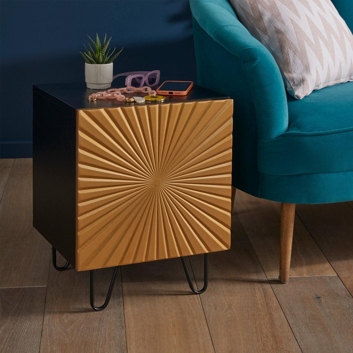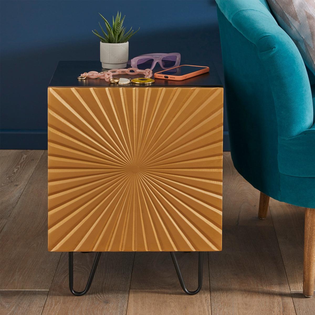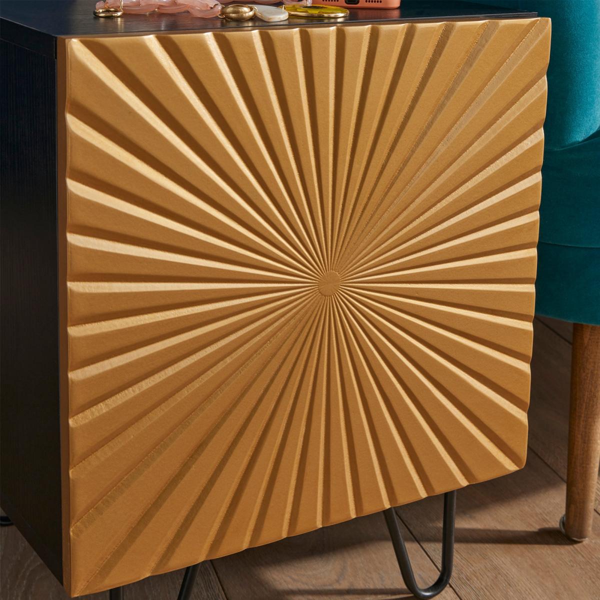 Featuring a black and gold colour scheme and stunning radial sunbeam design, this side table is the perfect mix of sophistication and fun. And with one spacious cupboard with internal storage, you'll have plenty of room to store all of your favourite things.
