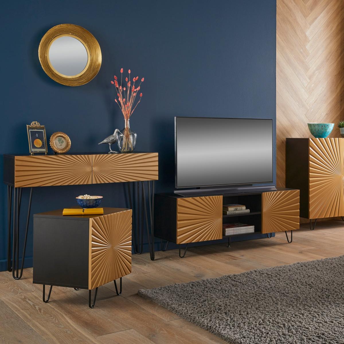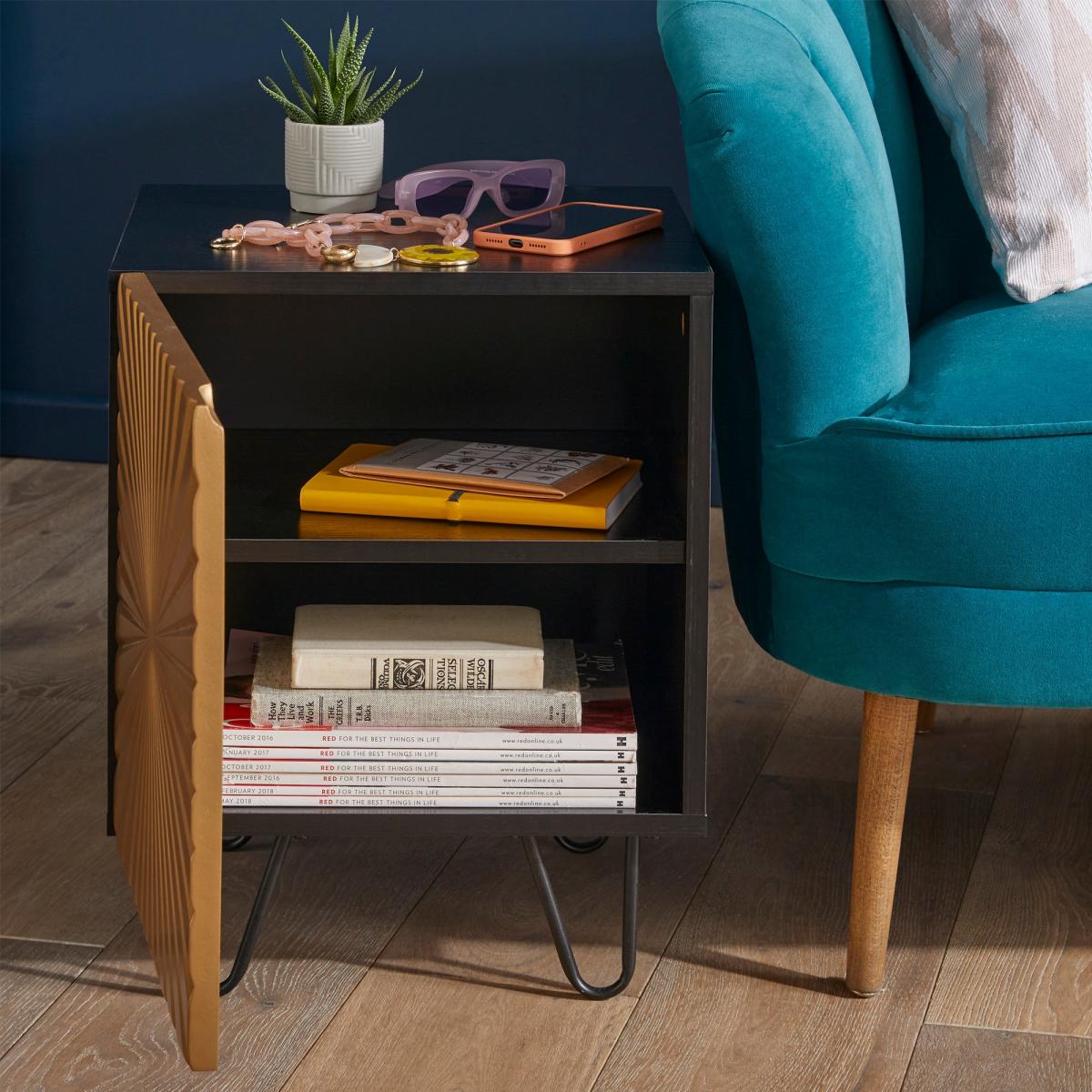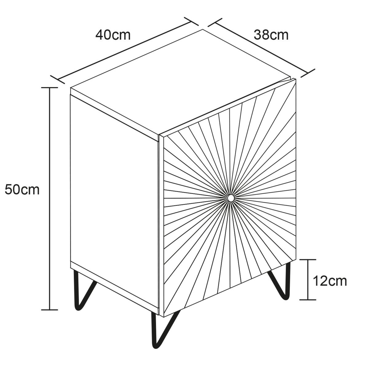 Featuring a black and gold colour scheme and stunning radial sunbeam design, this side table is the perfect mix of sophistication and fun. And with one spacious cupboard with internal storage, you'll have plenty of room to store all of your favourite things.