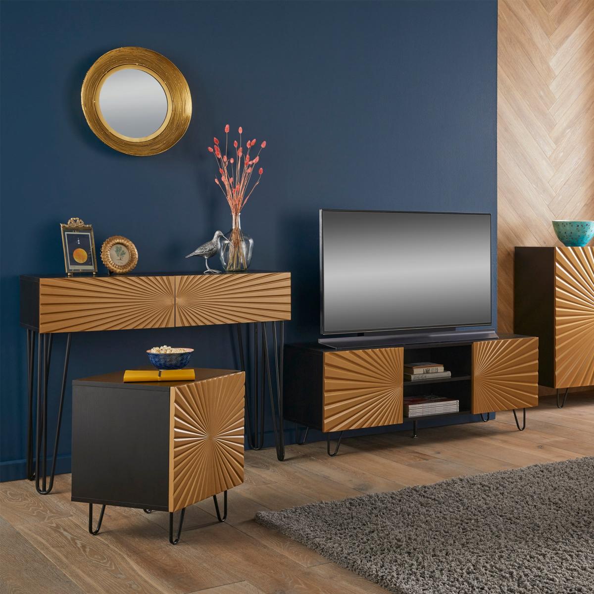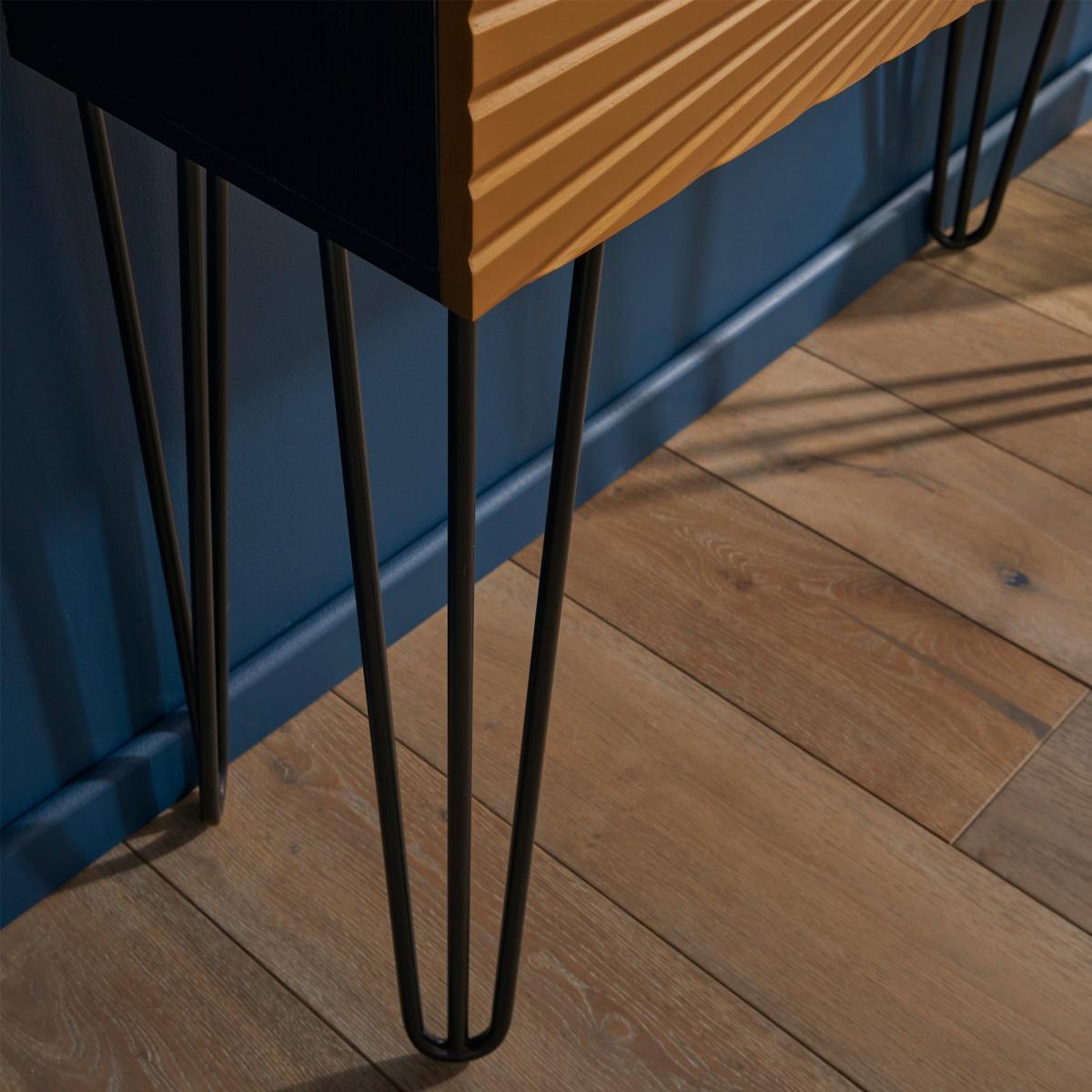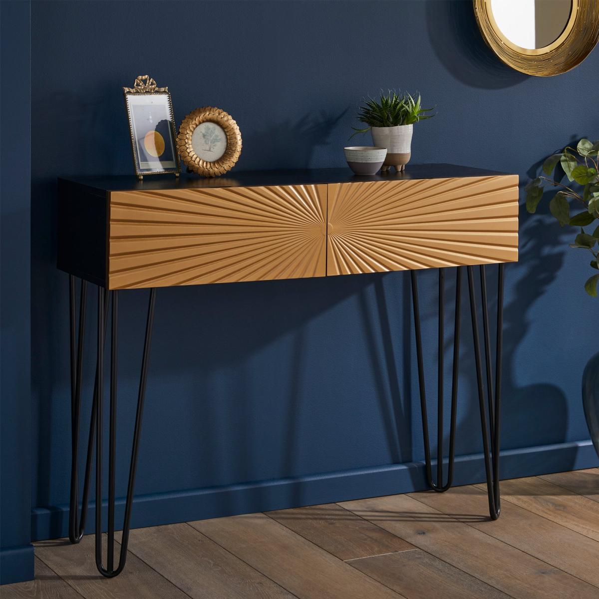 I love this four-drawer console because of its sleek yet striking design, which makes it a versatile piece for various interiors. The gold finish adds a touch of glamour, ideal for both contemporary and modern spaces, and it pairs beautifully with bold colour schemes or neutral palettes. Stylistically, it works well in hallway entrances, living rooms, or even as a functional feature in a bedroom. To keep the look balanced, consider styling it with minimal decorative items like small vases or artwork, and ensure the items don’t overcrowd the surface to maintain its chic, organised appearance. Its slim profile with long legs also helps to create the illusion of more space, making it a practical and stylish addition to any home.