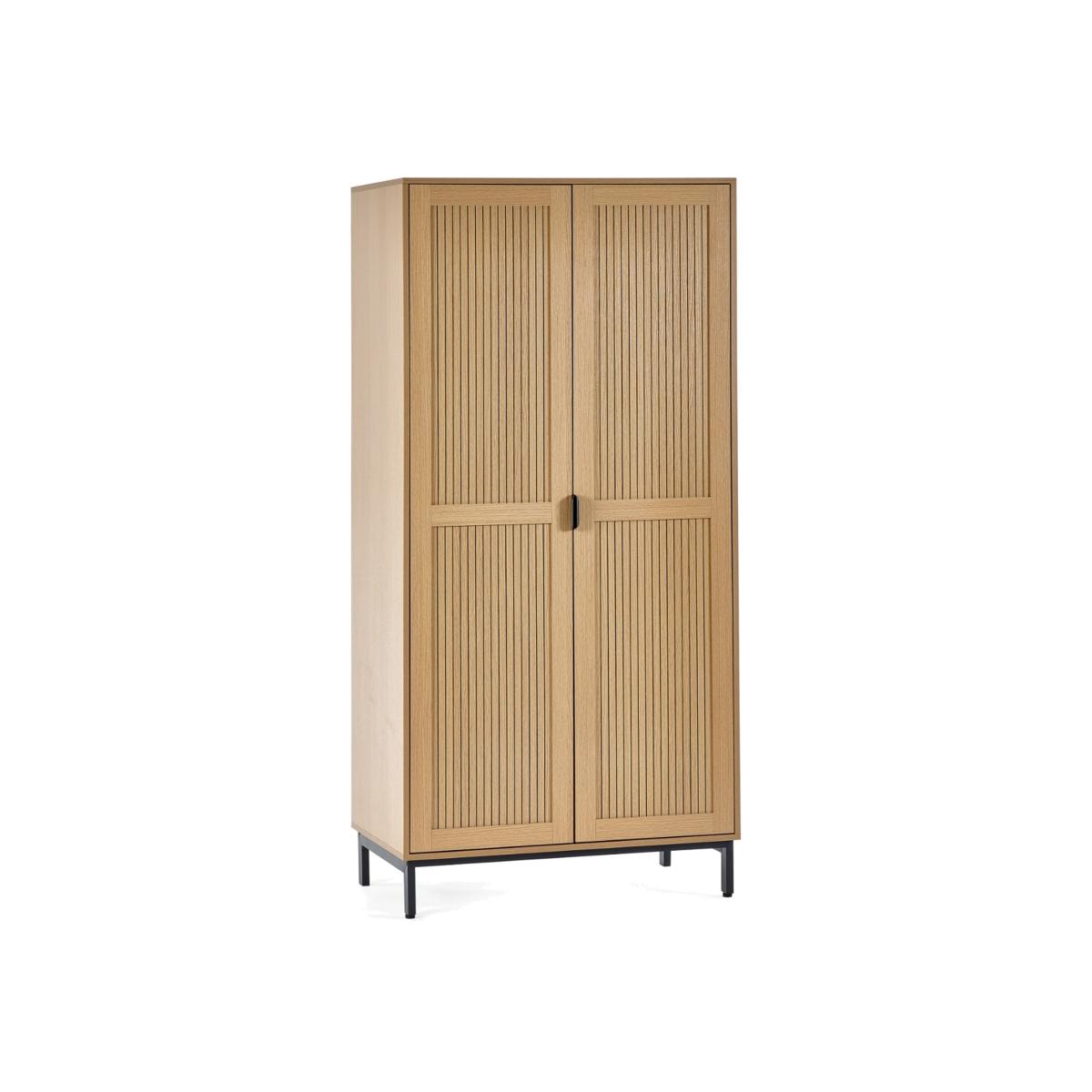 Elevate your storage experience with the Sia 2 Door Wardrobe. Featuring beautiful vertical slatted effect doors and a spacious interior, this wardrobe seamlessly blends style and functionality. Designed to keep your clothing and accessories organised, it offers ample hanging space along with two shelves to fulfill all your storage needs. The sleek black handles provide a refined touch, enhancing its modern appeal. The combination of warm wood tones and sleek black legs adds a contemporary twist to traditional design, making it a striking focal point in any bedroom. Easy assembly makes it a breeze to incorporate into your decor. Requires minimal assembly for your convenience.