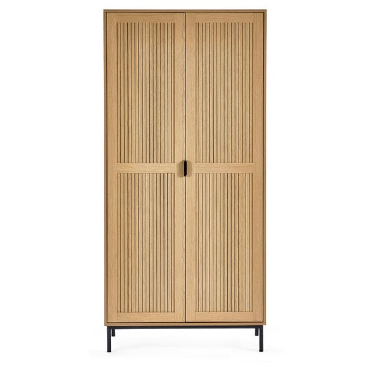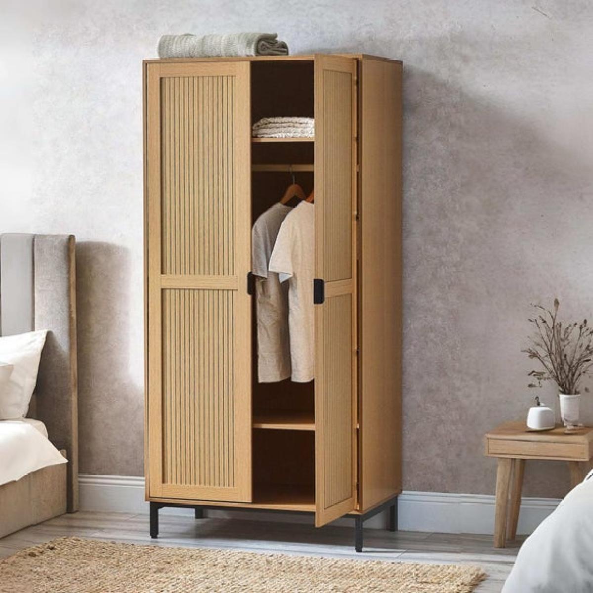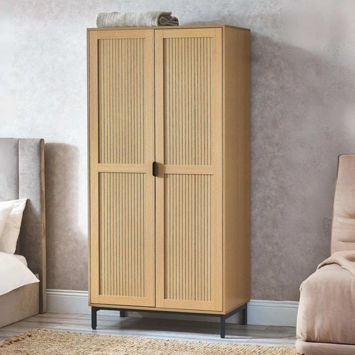 * Sleek wardrobe * Slat effect front * Metal handles and legs This wardrobe combines style and practicality to keep your bedroom organised. Inside, you’ll find a full-length hanging space and two shelves, giving you plenty of room for clothes and accessories. The exterior features a sleek design with subtle detailing that adds a modern touch to your space. Sturdy legs and refined handles complete the look, making this piece both functional and attractive.