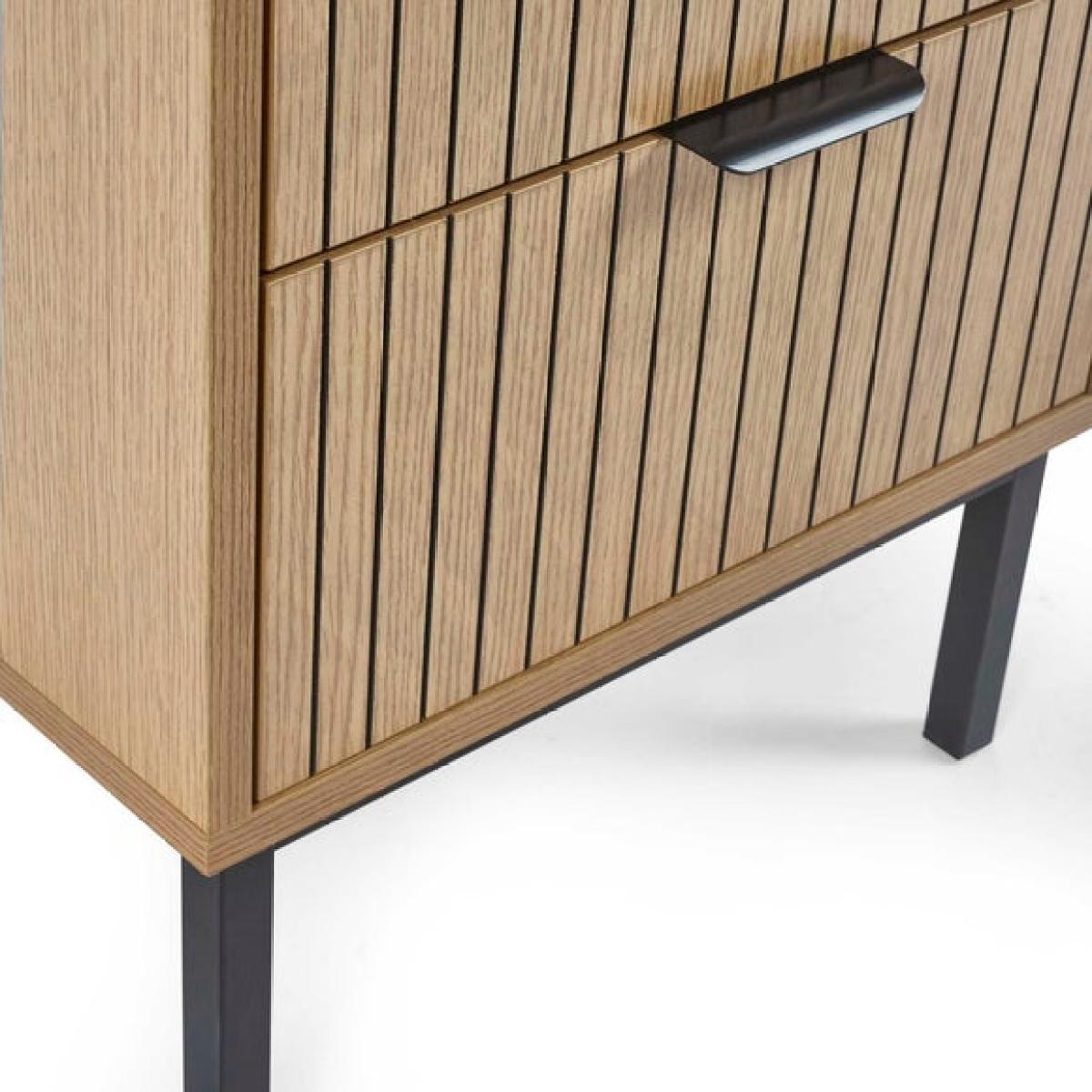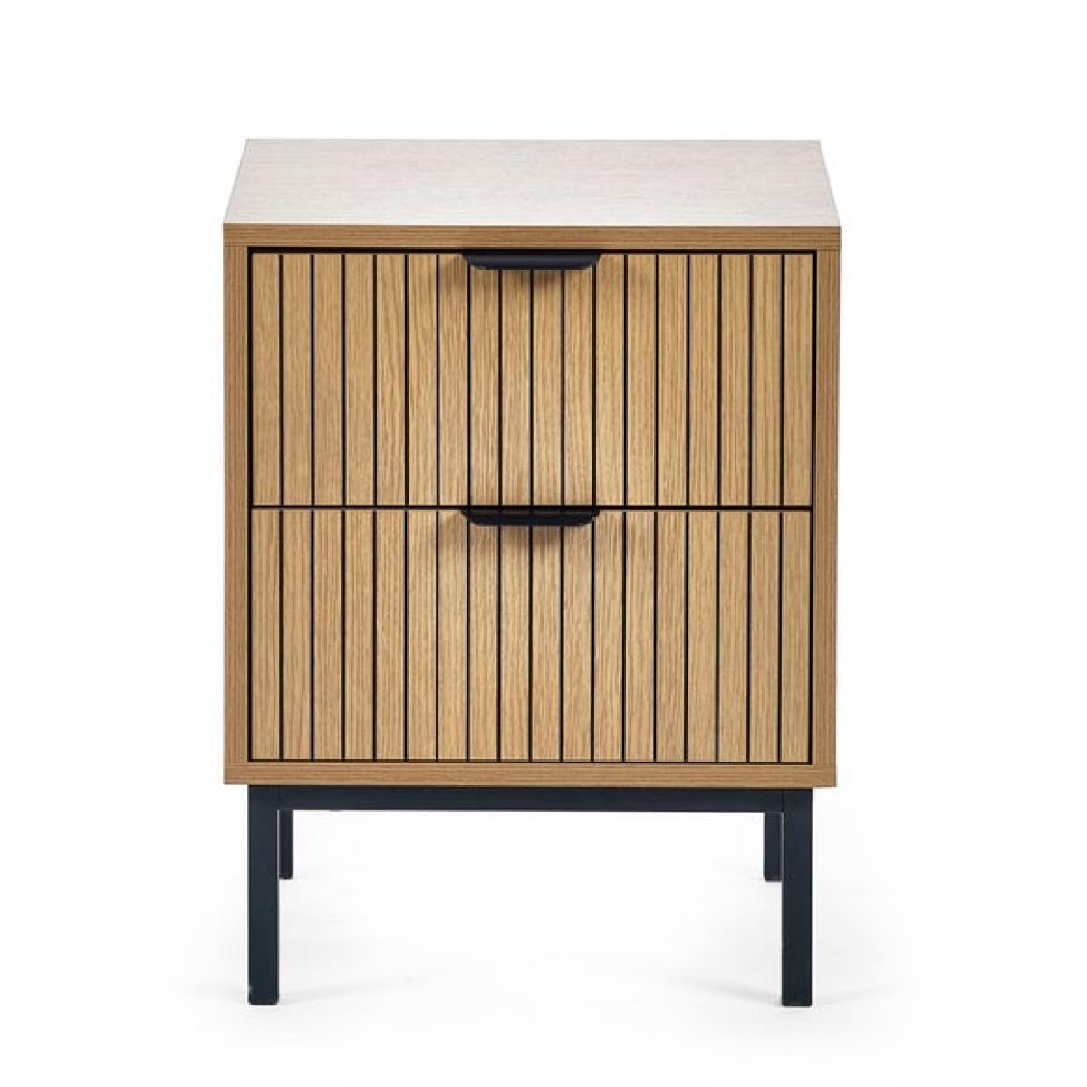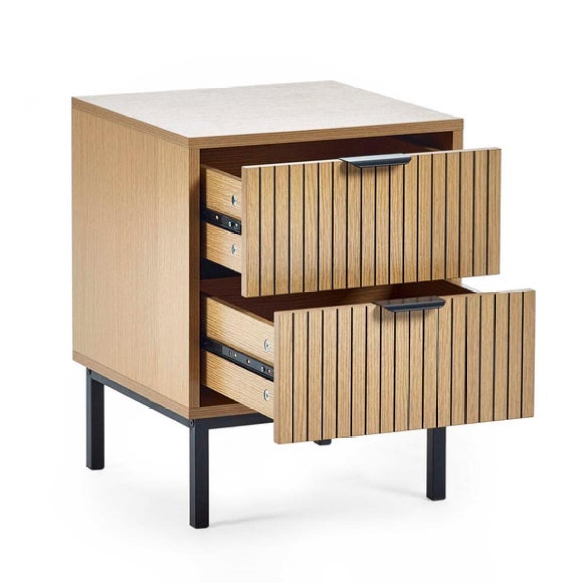 * Sleek bedside table * Slat effect front * Metal handles and legs A bedside table that offers both convenience and style, it includes two drawers for storing your nighttime essentials, helping you keep everything close at hand and neatly arranged. The compact design fits perfectly beside your bed, while the textured finish and elegant details give it a contemporary feel.