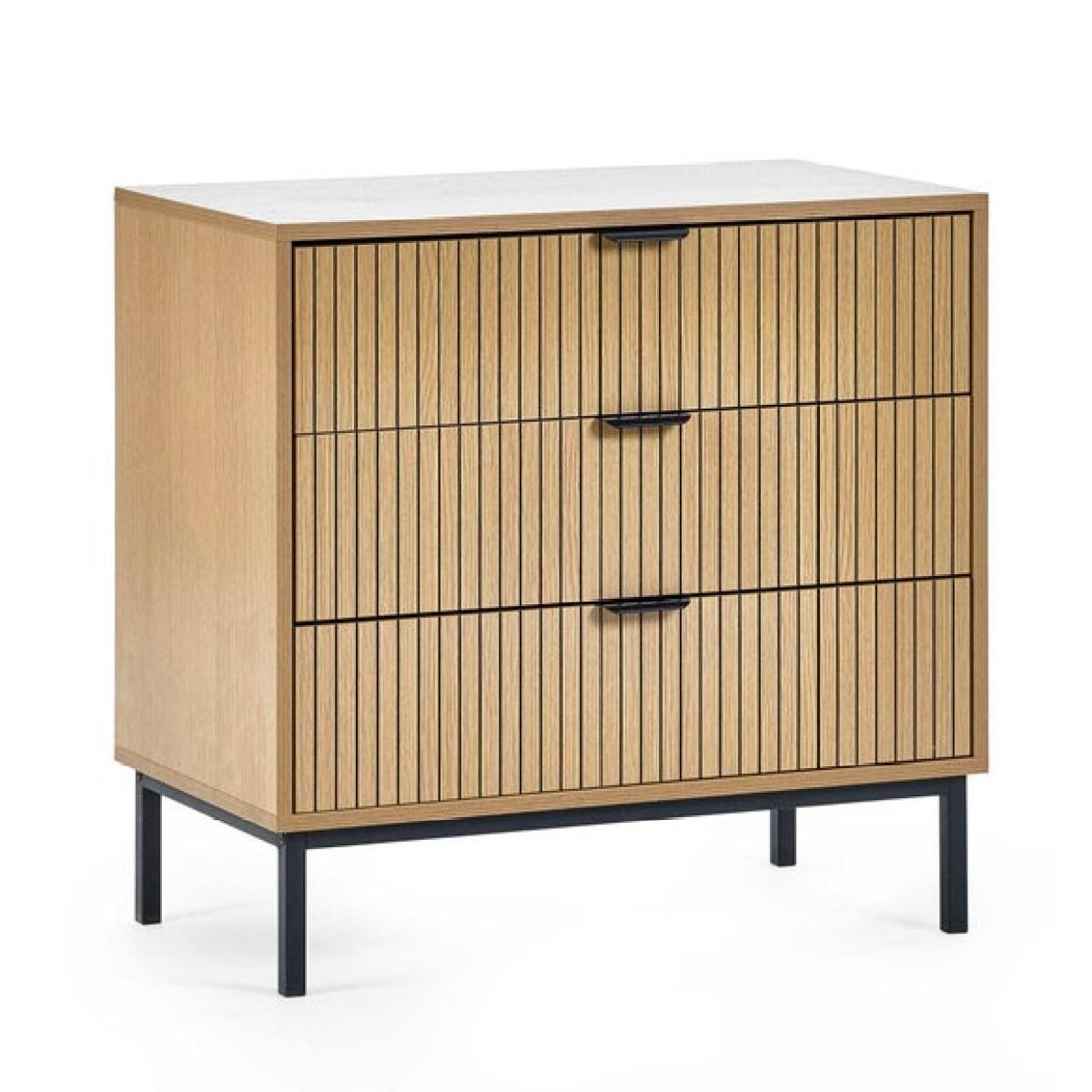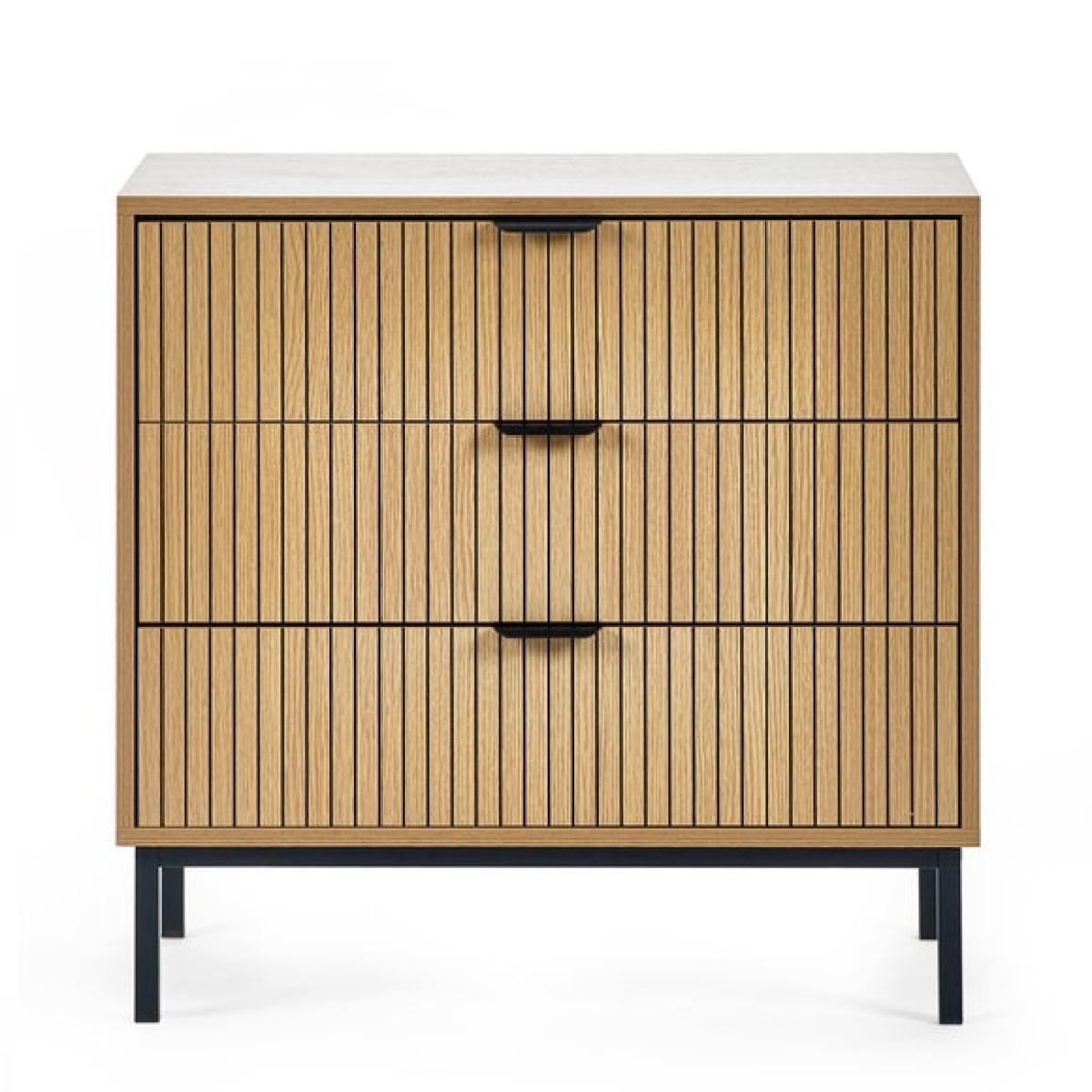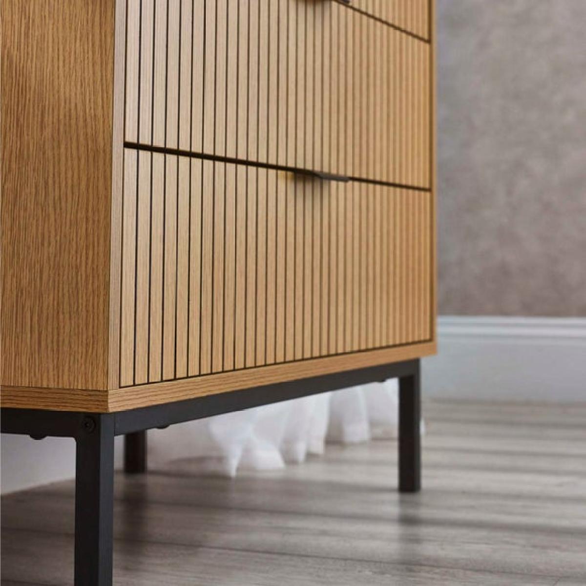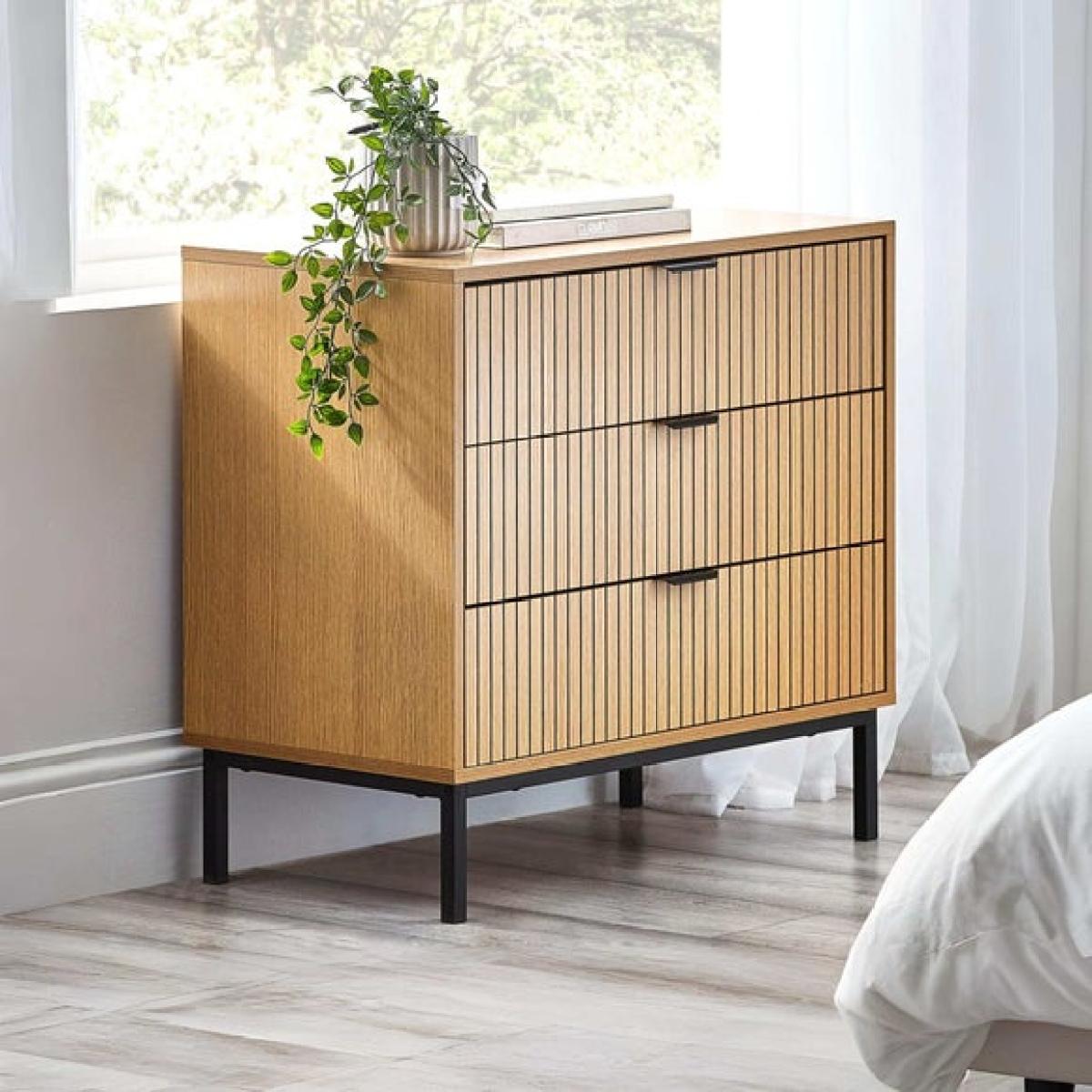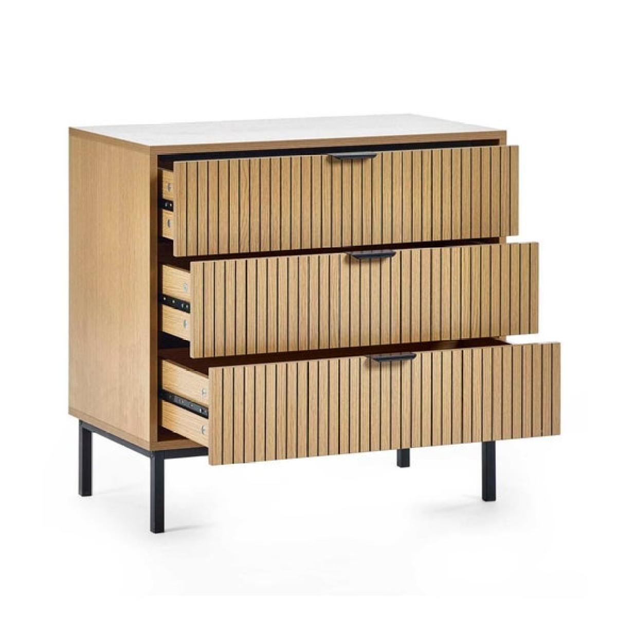 * Sleek chest of drawers * Slat effect front * Metal handles and legs This chest provides three spacious drawers for storing clothing, linens and accessories. Its clean design and subtle accents make it a versatile addition to any bedroom, while the sturdy frame ensures durability. The top surface offers space for a lamp or decorative items, helping you create a stylish and organised setting.