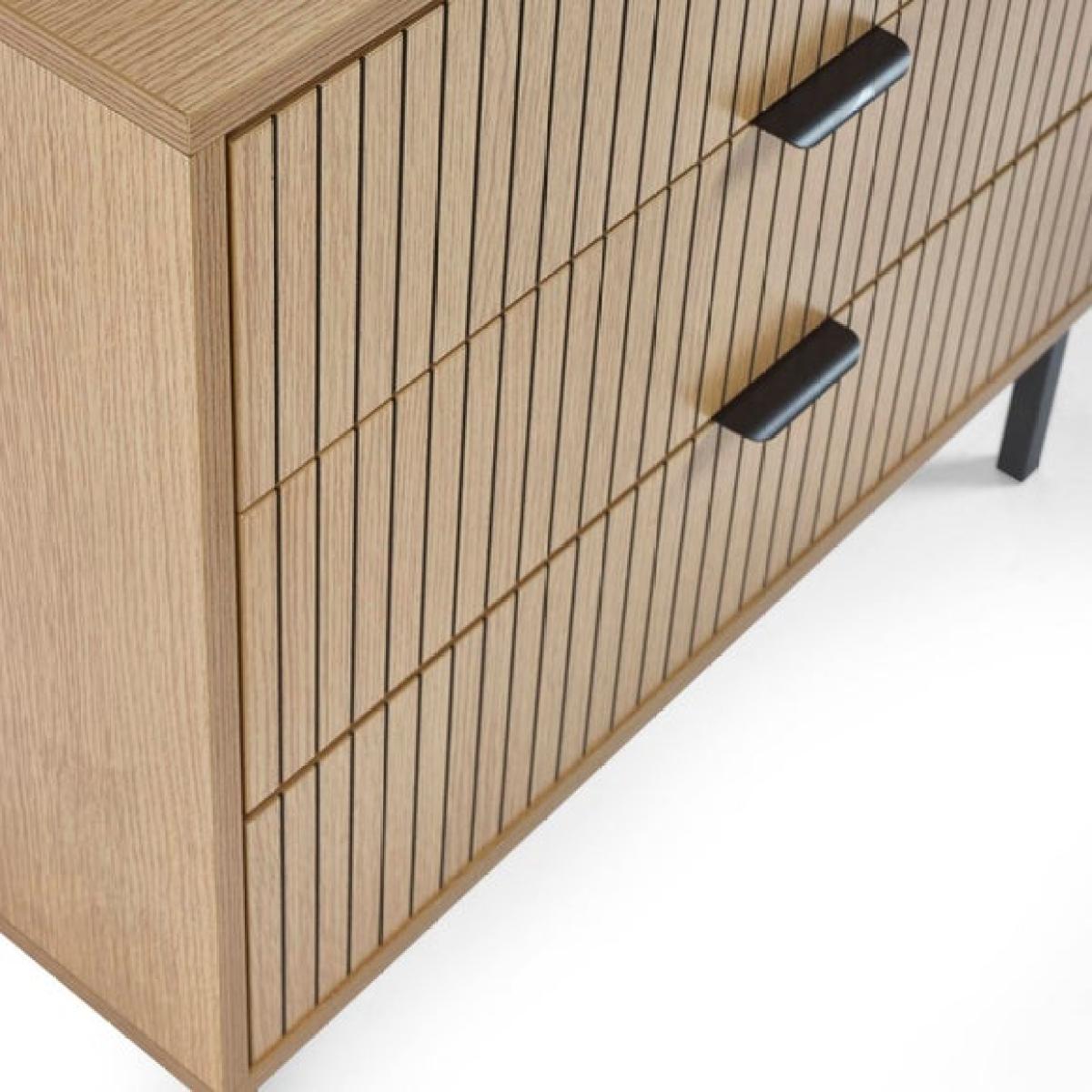 I love this little Sia chest for its sleek, modern look that works well in both contemporary and Scandi-inspired interiors. Its compact size makes it a versatile storage choice in bedrooms, living rooms, or even hallways, providing practical organisation without overwhelming the space. The slatted drawer fronts add a subtle texture and visual interest, while the black handles and legs offer an understated contrast. For styling tips, consider pairing it with neutral tones and natural materials to enhance its minimalist appeal, or add a pop of colour on top with decorative accessories or tableware to make it stand out. It’s a great option for anyone looking for functional storage that also brings a clean, modern aesthetic to the room.