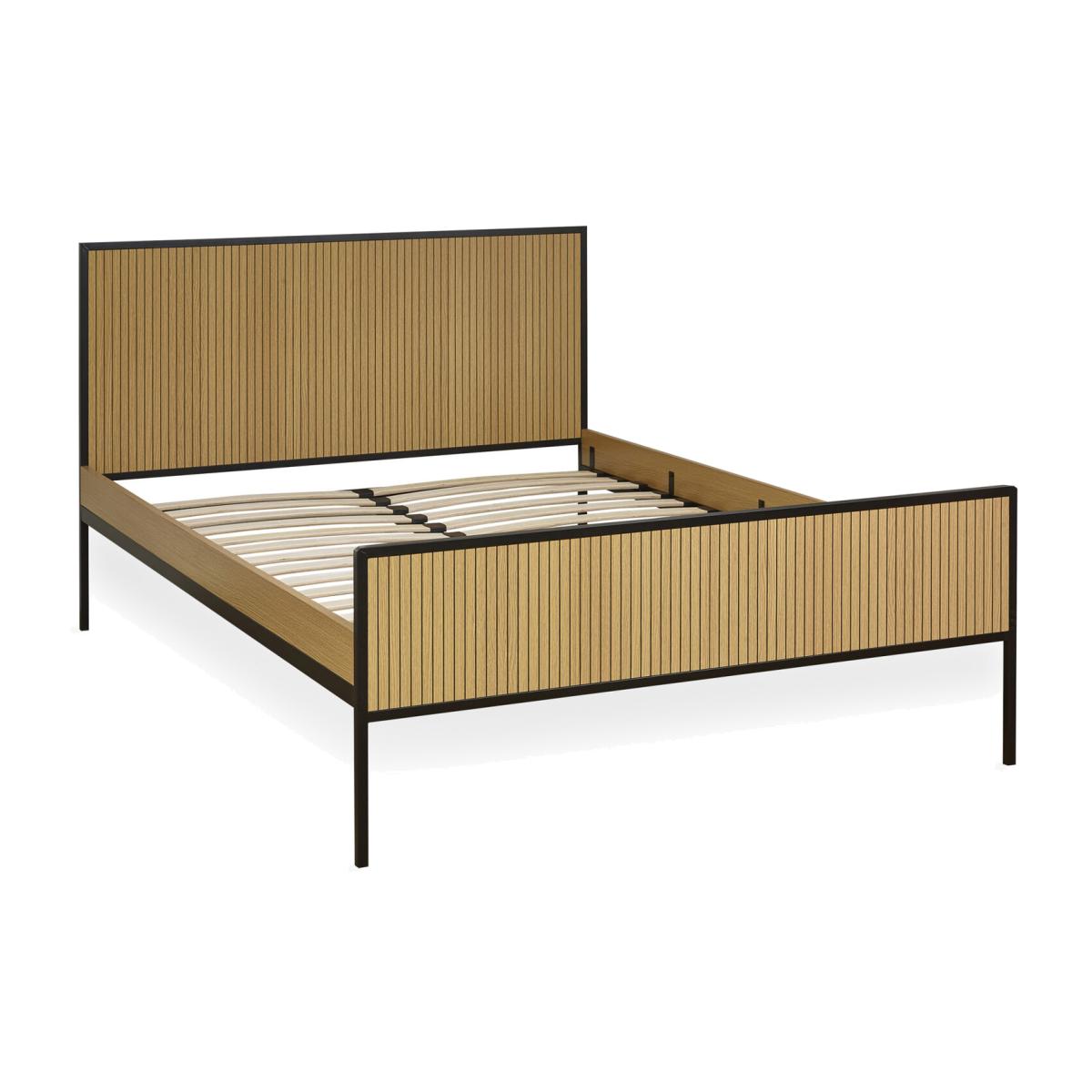 Give your bedroom a fresh, modern feel with this 150cm bed frame. The warm oak-effect finish is outlined with sleek black edges. A tall headboard and matching footboard are detailed with slim vertical grooves, giving the design texture and definition. Slim black legs lift the frame for a lighter look while keeping it sturdy and reliable. Mattress sold separately.
