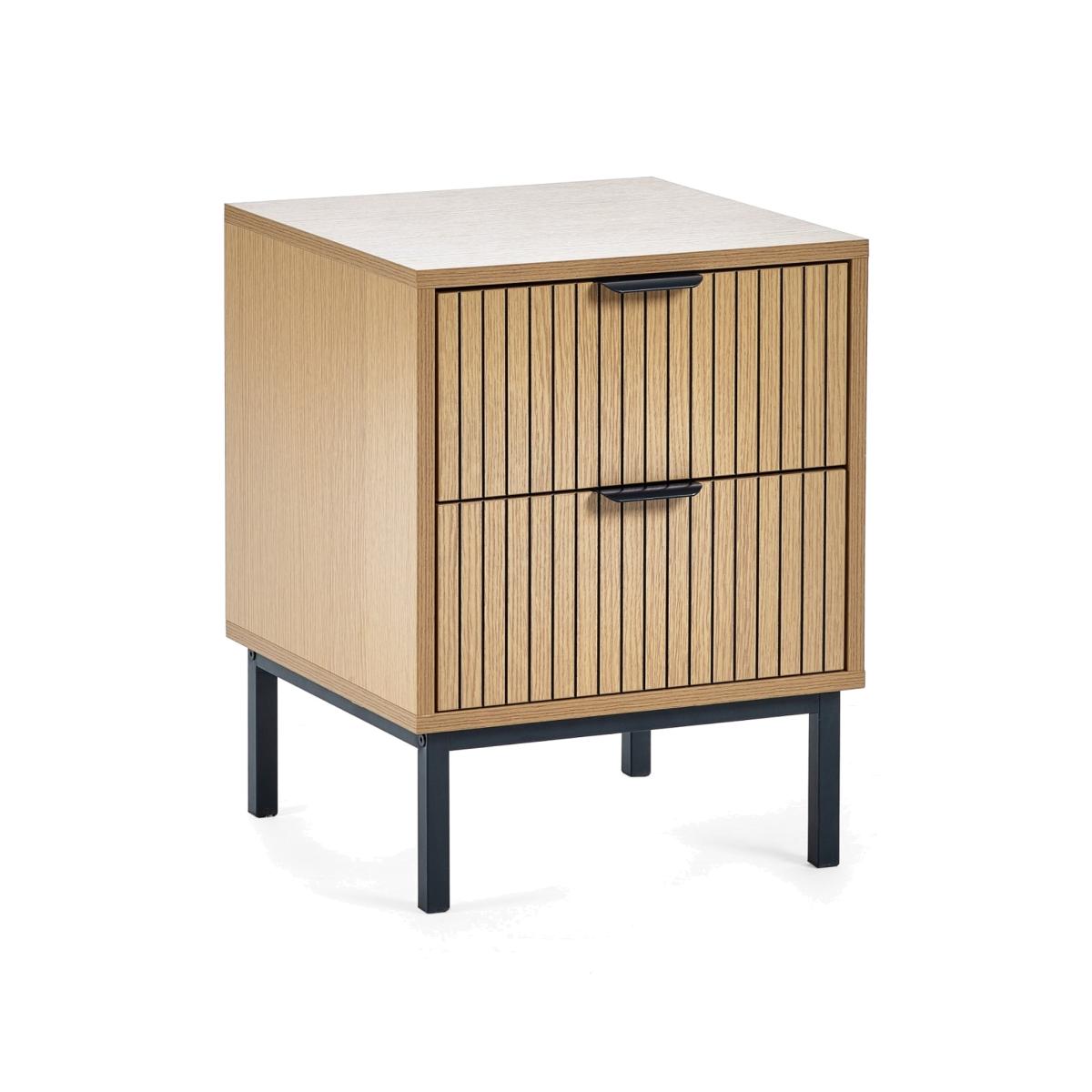 Elevate your bedroom with the Sia 2 Drawer Bedside, a perfect blend of style and functionality. This elegant piece features a vertical slat effect on the drawer fronts that add a sophisticated touch, while the compact design fits seamlessly beside your bed. With two spacious drawers, you'll have ample room to store nighttime essentials, books, or gadgets within easy reach. Enhanced by sleek black handles and sturdy black metal legs, this bedside table is a practical choice that beautifully complements your bedroom decor. Minimal assembly is required for easy setup.