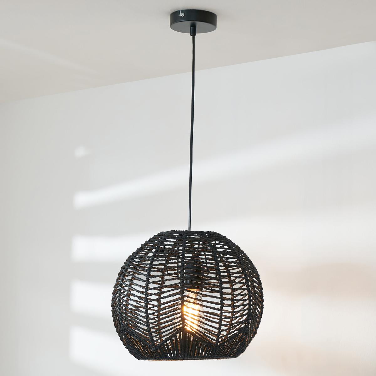 I really like this woven paper pendant; it offers a modern take on natural textures, making it a versatile choice for various interior styles. Its black finish adds a contemporary edge, perfect for pared-back Scandi, industrial, or boho interiors. I’d recommend hanging it in a living room or bedroom where a focal light is desired, pairing it with simple, neutral décor to make the pendant stand out. Practical styling tips include layering with other textured accessories or choosing a filament bulb for added warmth and visual interest. It's a practical yet stylish choice that can enhance both modern and casual spaces with ease.