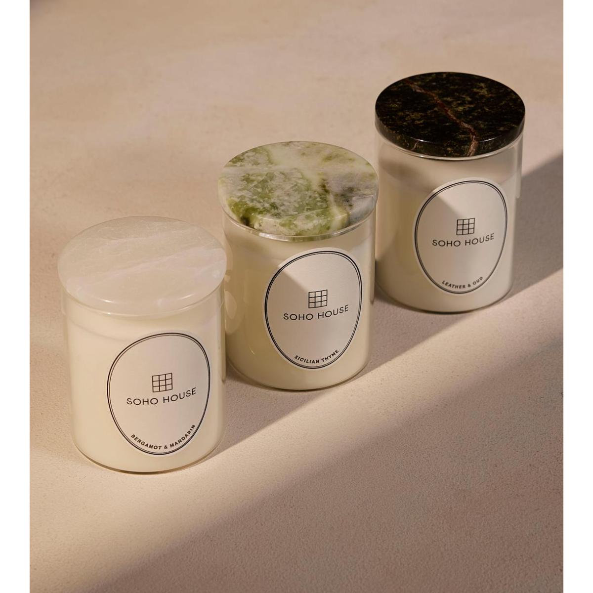 A glass candle with a fresh, herbal scent that gives way to a warm, woody base to take you from day to night. Green, zesty top notes of lemon and thyme give way to a sweet, woody heart and warm amber base for this home fragrance. The vegan-friendly wax is hand-poured into a borosilicate glass holder designed to slot perfectly into any of our marble candle vessels, or to be displayed alone with the marble top used as a coaster. Top notes: Lemon and thyme, Heart notes:Red fruits, fig and soft woods, Base notes: Amber. Burn time: Up to 80 hours.