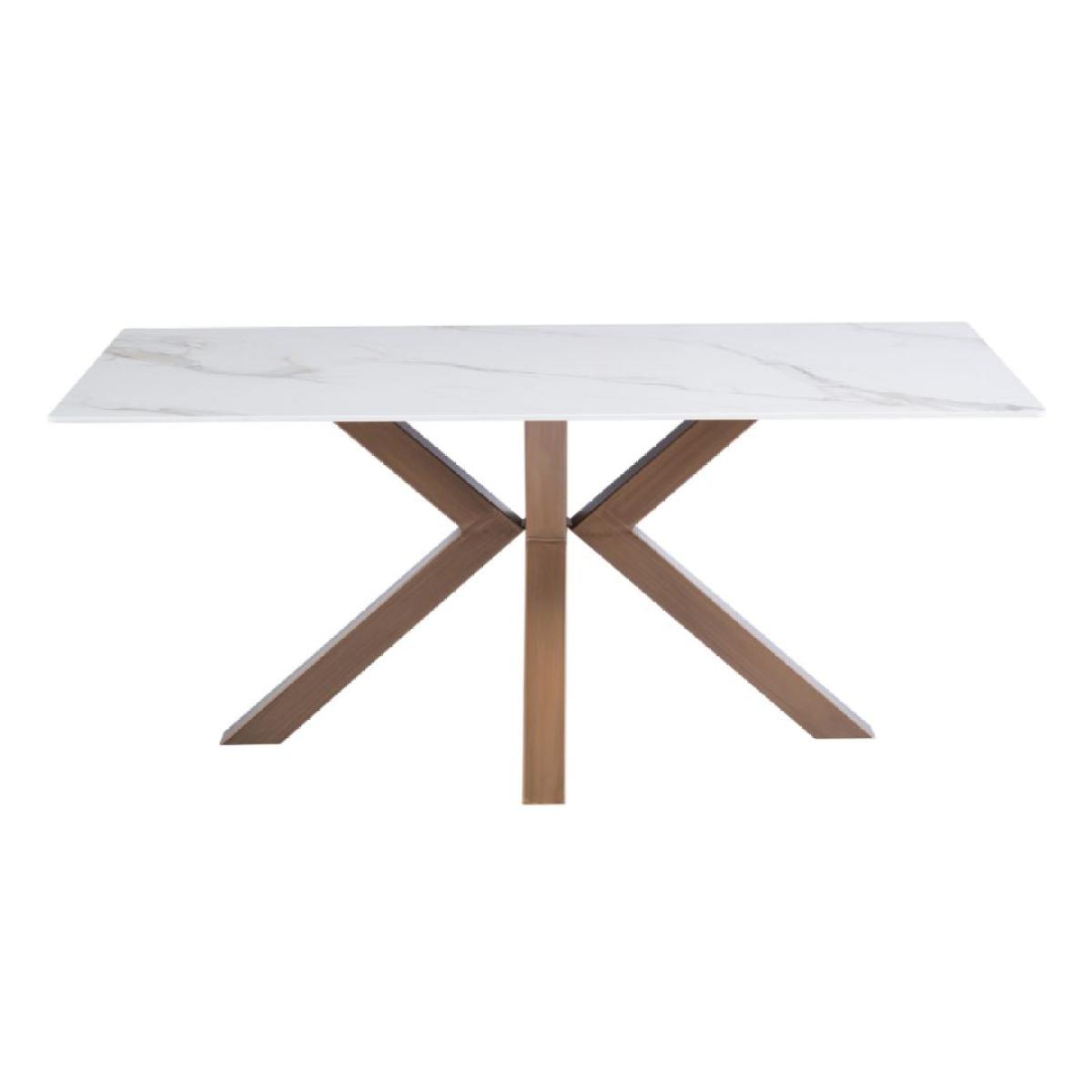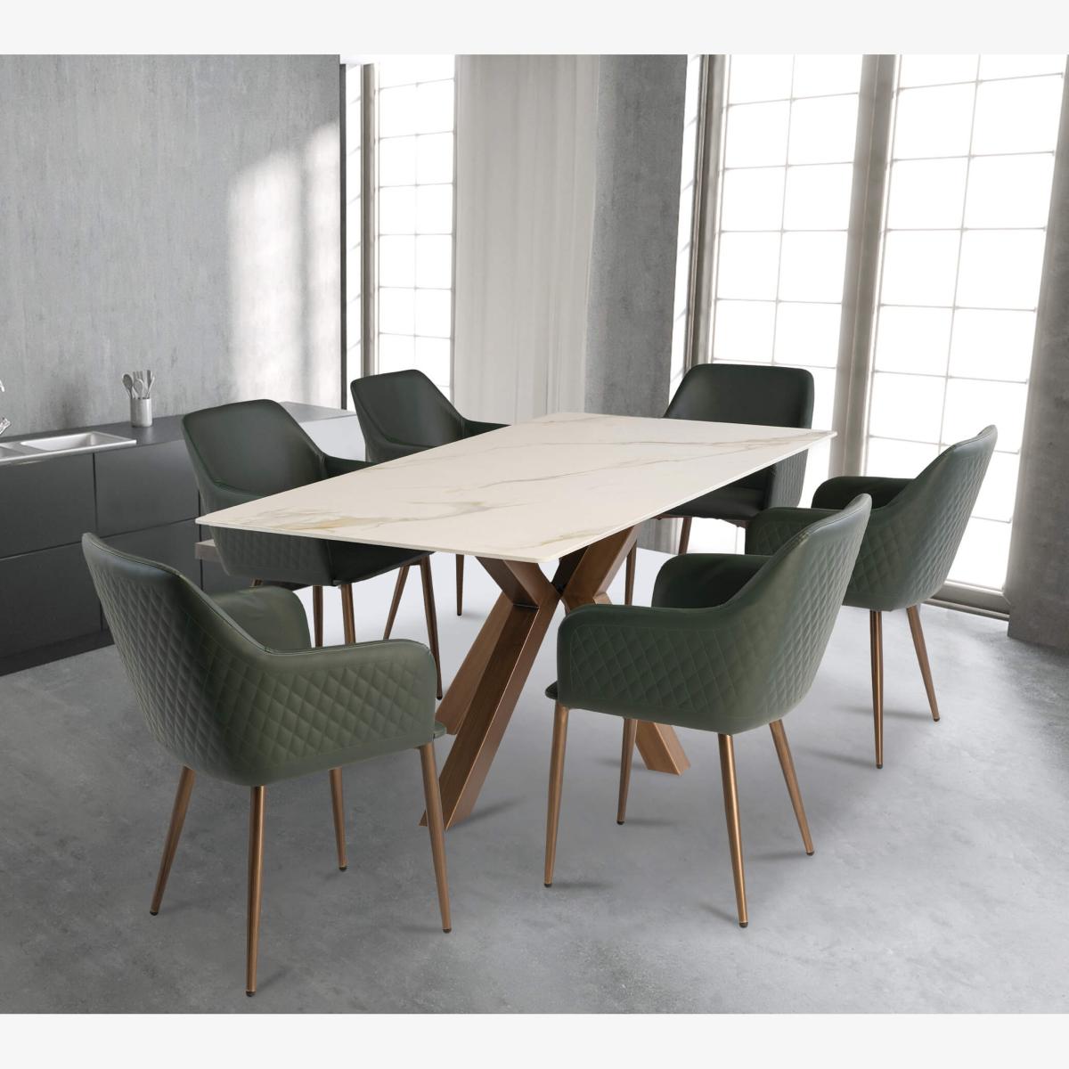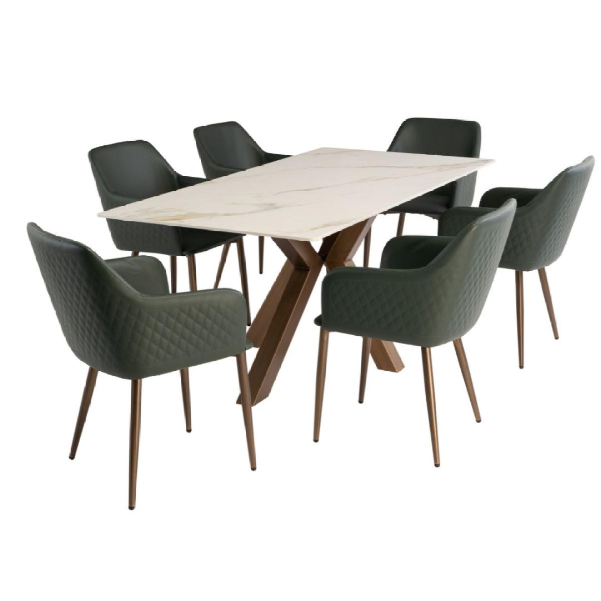 Everything about the Sicily dining set makes a statement. The contrasting smooth gold sintered stone top, with unique grey and gold veining, and the elegant brushed brass base create drama and distinction. Designed for everyday living, this dining set comfortably sits 6 people and is perfectly complimented by the Regency chairs. The chairs are beautifully tailored in a rich textured dark green pu. This dining chairs are further refined using a cross stitched pattern on the exterior and complimented with an antique brushed brass leg. Sintered stone is an engineered surface material composed of natural minerals, such as quartz, porcelain, and minerals. It undergoes a high-heat, high-pressure sintering process, resulting in a dense, durable, and versatile material used in countertops, flooring, and architectural applications. A dining table with a sintered stone top offers durability, resistance to heat, scratches, and stains. It's easy to clean, non-porous, for a stylish and low-maintenance dining experience. To clean a sintered stone table top, use a mild, p. H-neutral cleaner and warm water. Wipe gently with a soft cloth or sponge, avoiding abrasive or acidic cleaners. Routine cleaning maintains its appearance and durability. Everything about the Sicily dining set makes a statement. The contrasting smooth gold sintered stone top, with unique grey and gold veining, and the elegant brushed brass base create drama and distinction. Designed for everyday living, this dining set comfortably sits 6 people and is perfectly complimented by the Regency chairs. The chairs are beautifully tailored in a rich textured dark green pu. This dining chairs are further refined using a cross stitched pattern on the exterior and complimented with an antique brushed brass leg. Sintered stone is an engineered surface material composed of natural minerals, such as quartz, porcelain, and minerals. It undergoes a high-heat, high-pressure sintering process, resulting in a dense, durable, and versatile material used in countertops, flooring, and architectural applications. A dining table with a sintered stone top offers durability, resistance to heat, scratches, and stains. It's easy to clean, non-porous, for a stylish and low-maintenance dining experience. To clean a sintered stone table top, use a mild, p. H-neutral cleaner and warm water. Wipe gently with a soft cloth or sponge, avoiding abrasive or acidic cleaners. Routine cleaning maintains its appearance and durability.