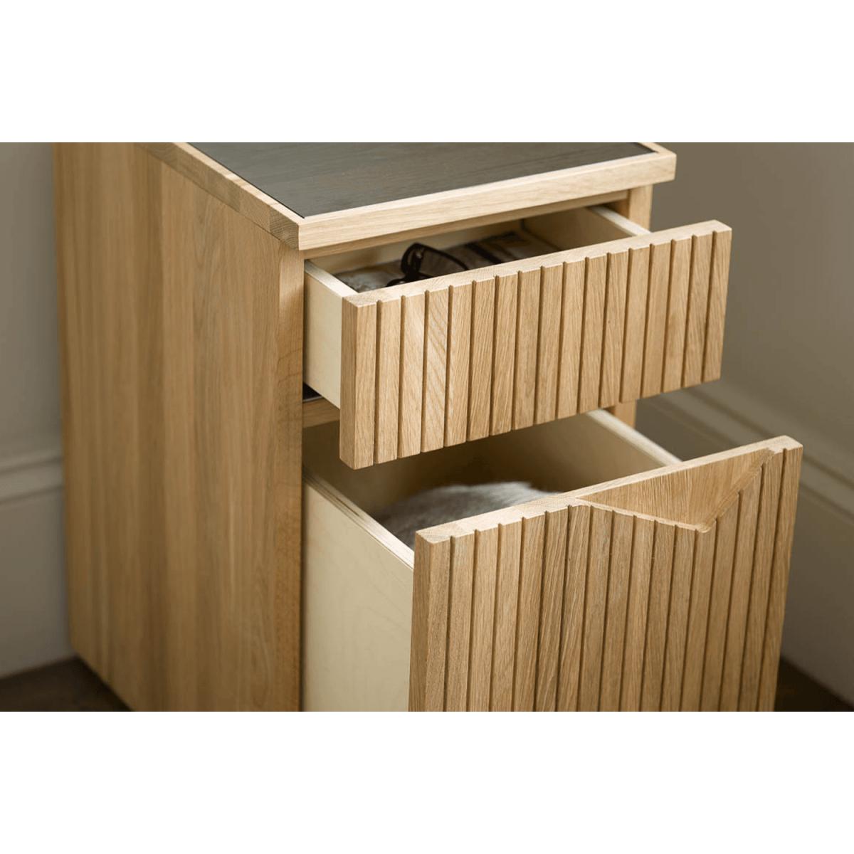 I love this bedside table for its clean, natural aesthetic and versatile design, making it a great addition to both contemporary and more traditional interiors. The warm oak finish adds a touch of Nordic simplicity, while the slatted detail offers subtle texture. It works well paired with neutral linens or layered with textured cushions and throws for a cosy yet modern bedroom. Practical styling tips include keeping surface items minimal-perhaps a small lamp and a book-to maintain its sleek silhouette. Additionally, it can easily be styled with a small tray or decorative objects on top, and the drawer space is perfect for storing essentials out of sight, keeping the bedside tidy.