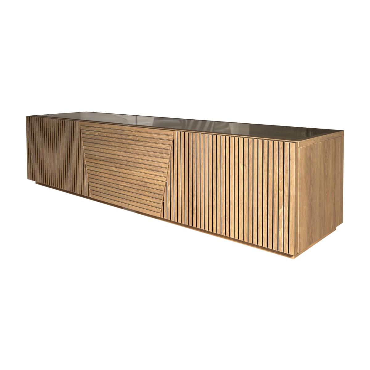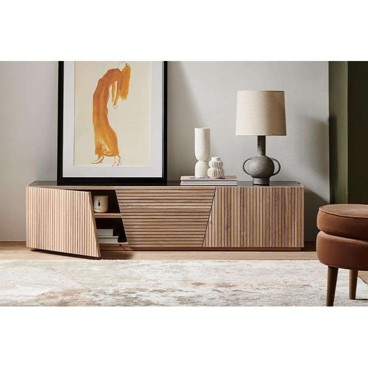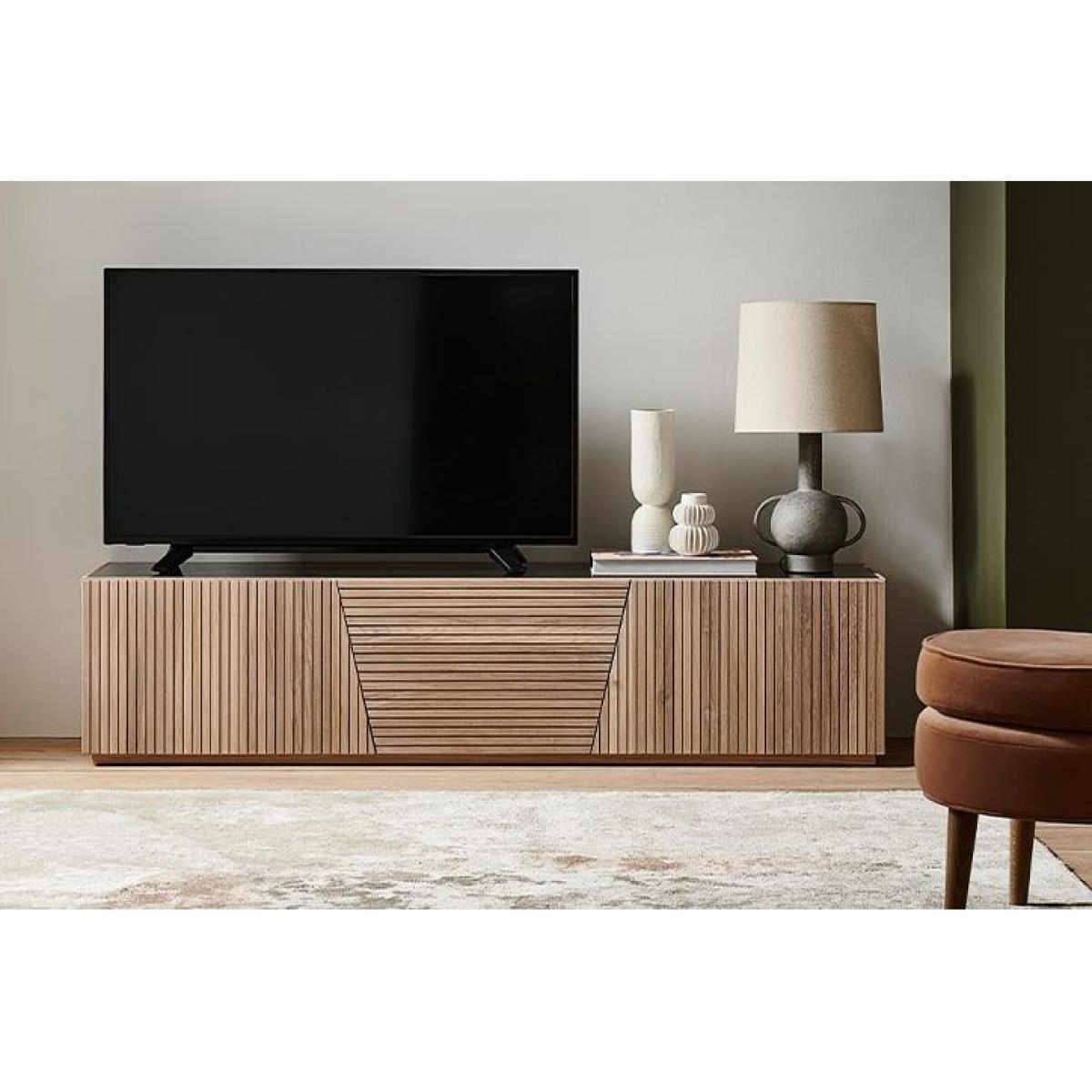 I love this media unit for its clean, natural oak finish and contemporary slatted design, which adds subtle texture without overwhelming the space. It works particularly well in modern, Scandinavian, or even rustic interiors where warmth and simplicity are key. To style it effectively, consider keeping the top surface uncluttered with a few carefully chosen decorative pieces, such as a statement lamp or a couple of curated books. Inside, utilise organisers or baskets to keep cords and accessories tidy, maintaining that sleek aesthetic. Overall, it's a versatile piece that can ground a living room with a touch of understated elegance while providing practical storage for media essentials.