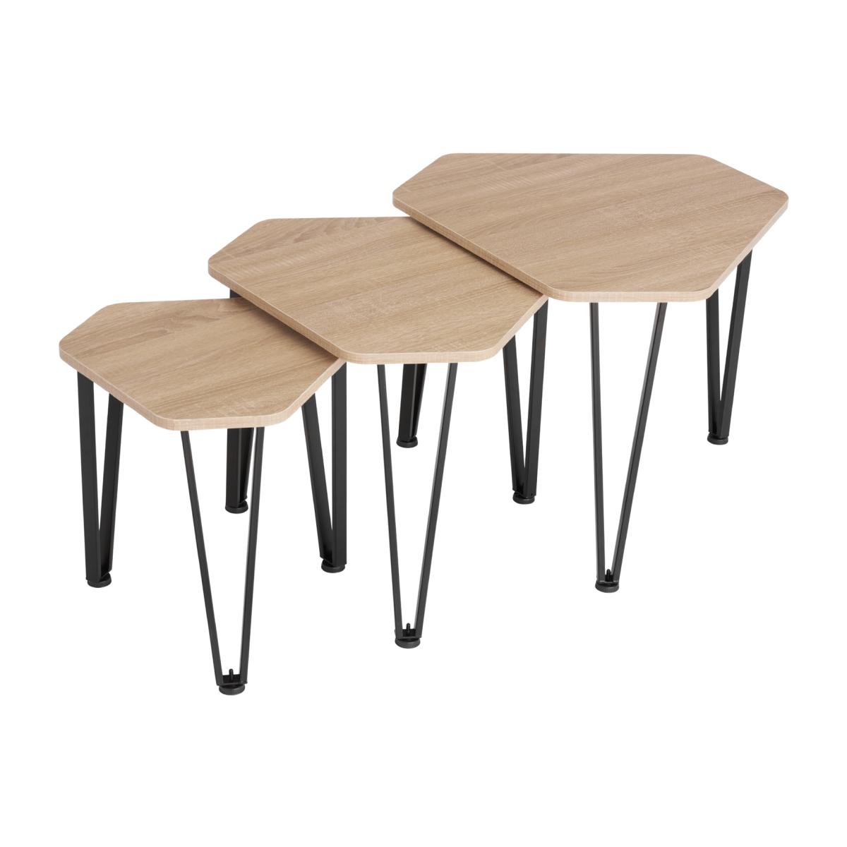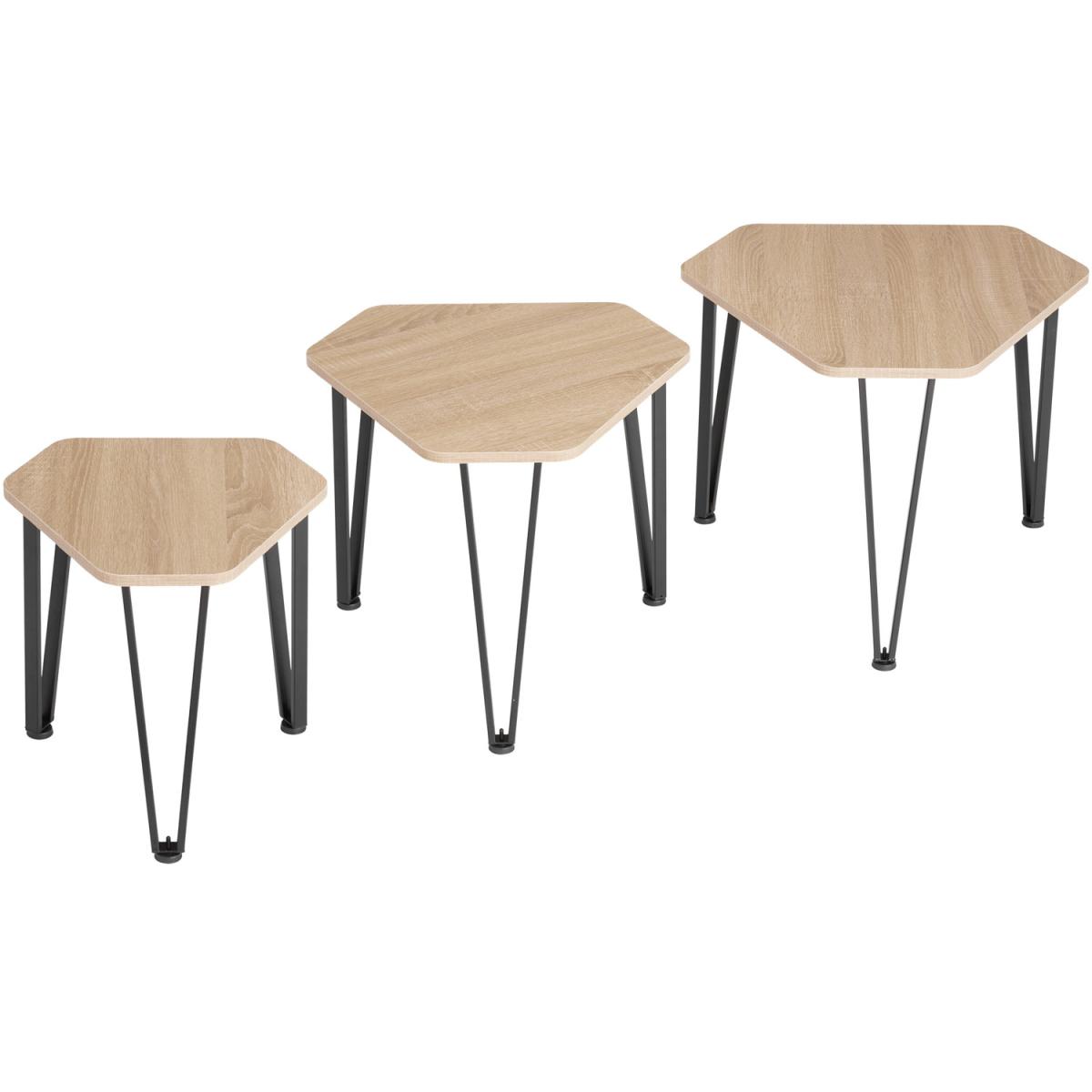 Create a statement in your home with the new three-piece side table set Torquay from tectake. The trio of hexagonal tables, come in three complimentary sizes, provide charming storage areas for drinks, reading material, or a delicate lamp next to the sofa, armchair, or bed. They can be nestled together to create a single focal point or arranged throughout a room for a versatile effect. The chic material mix of cool steel and warm oak wood creates an inviting ambiance in any living room, while you listen to music or shop online. Despite their elegant frames, these charming all-rounders are also highly durable and resilient, making them the perfect trio for social occasions. This nesting table set is a great addition to any home and a perfect gift for your loved ones.
