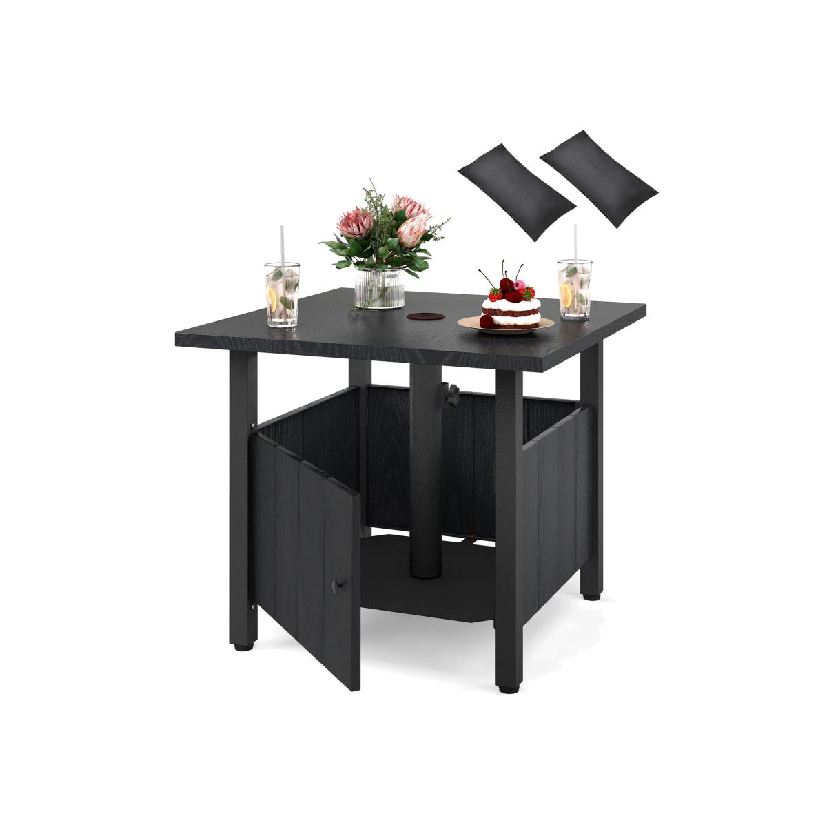 Enhance your outdoor space with our versatile pool side table. This umbrella base table boasts a sturdy zinc-iron alloy structure with adjustable foot pads, ensuring stability on uneven terrains. Equipped with a practical 4.8cm umbrella hole and an adjustable fixing screw, this small patio end table accommodates most standard patio umbrellas (not included). Furthermore, the integrated umbrella stand table comes with 2 sand bags that each hold up to 10kg, offering extra stability and additional inner storage space through a cleverly designed front door, making it an ideal addition to your garden, deck or poolside lounging area.
