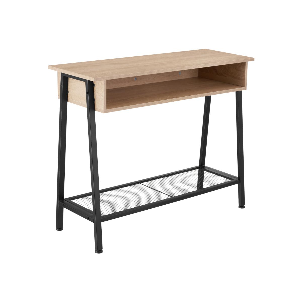 The new Tralee sideboard table from tectake is the perfect addition to any home, bringing a trendy industrial style to your living room or dining room. The simple oak look top and bottom mesh shelf provide a large amount of storage space for you to place accessories in your hallway or living room, while still occupying a small amount of floor space. The sideboard surfaces are made with an oak grain look that gives a natural charm to the room. The trapezoidal legs are made of powder-coated steel, and the height-adjustable feet are made of floor-friendly plastic. This slim side table is perfect for those looking to add a touch of industrial chic to their home. A great complement to any furniture set it's a must-have for those who shop for new sideboards and tables.
