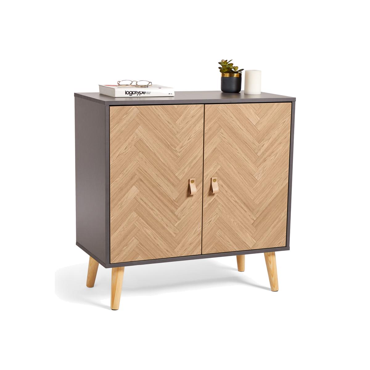 Add contemporary style to your space with our compact Herringbone Cabinet, featuring a smooth paper veneer, a distinctive herringbone pattern, sleek, tapered pine legs, and elegant faux leather pull tabs. With a versatile yet subtle natural wood and dark grey colourway, our cabinet will blend effortlessly with any decor. Use the sideboards 2 door compartments with 2 shelves to neatly organise your space, and place decorations on the cupboards smooth, large top surface. Ensure your cabinet stays securely in place by screwing into your wall with our included anti-tip hardware. Why not shop more living room and bedroom pieces from our Herringbone range to refresh your decor?