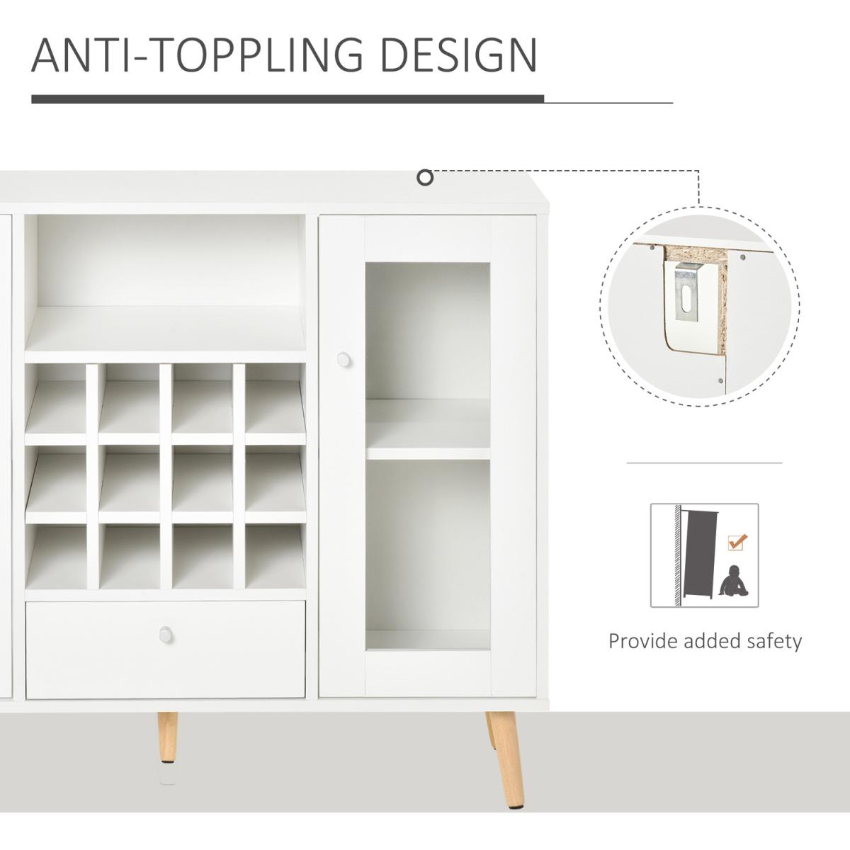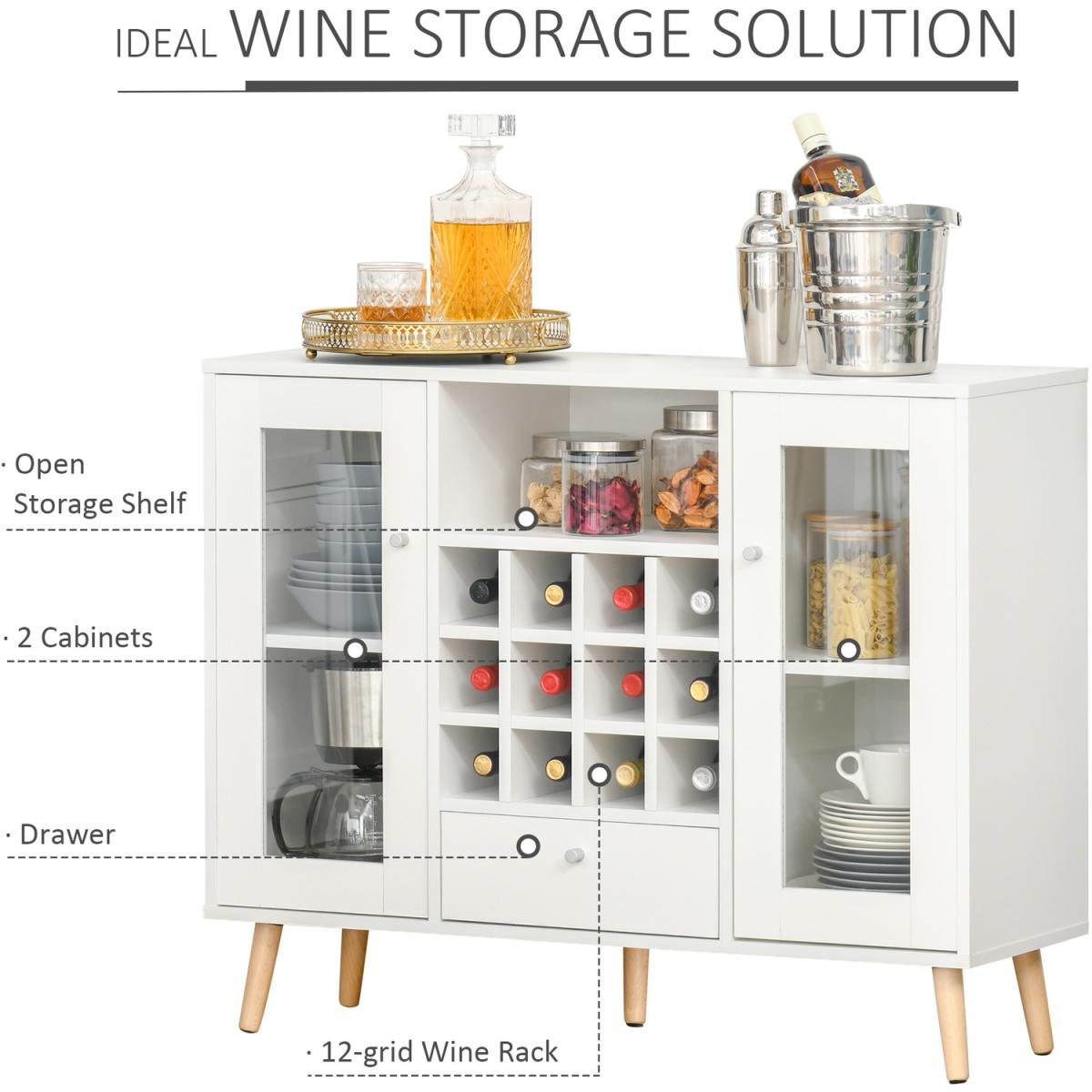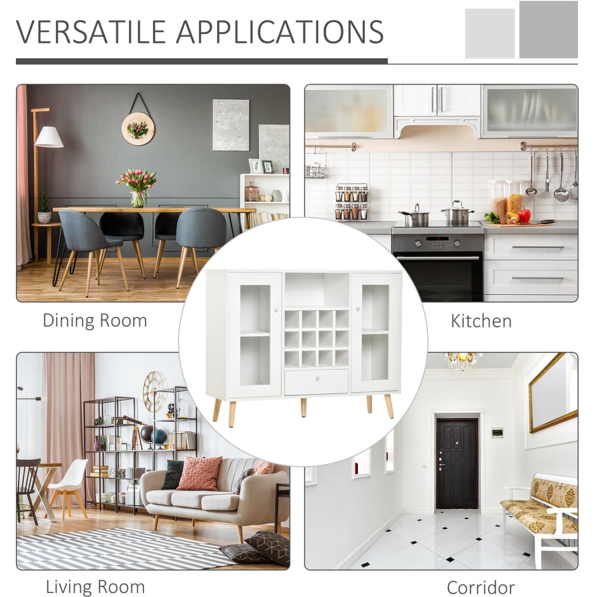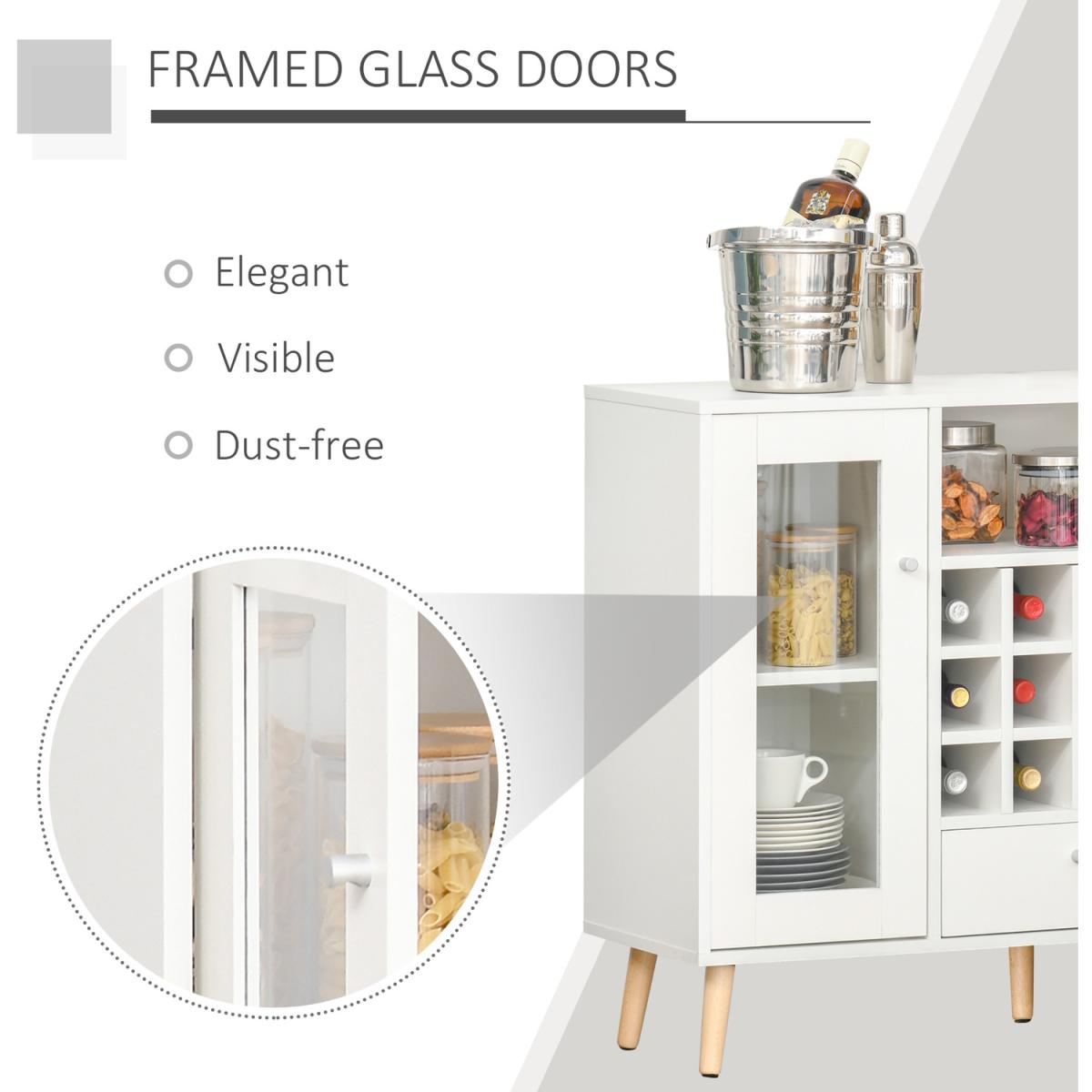 Make home dining storage easy and stylish with this multi-use cabinet from HOMCOM. Generous in features, it combines a 12 bottle wine rack, top shelf, small drawers and a cupboard on both ends -giving you lots to ensure your space is kept tidy and organised. The two cupboards are fitted with a shelf for extra organisation. Made from particleboard, this piece is durable for everyday use, with the five wooden legs keeping it steady on the ground. Finished with glass panels on the door for a sleek look and handles to open and close easily.