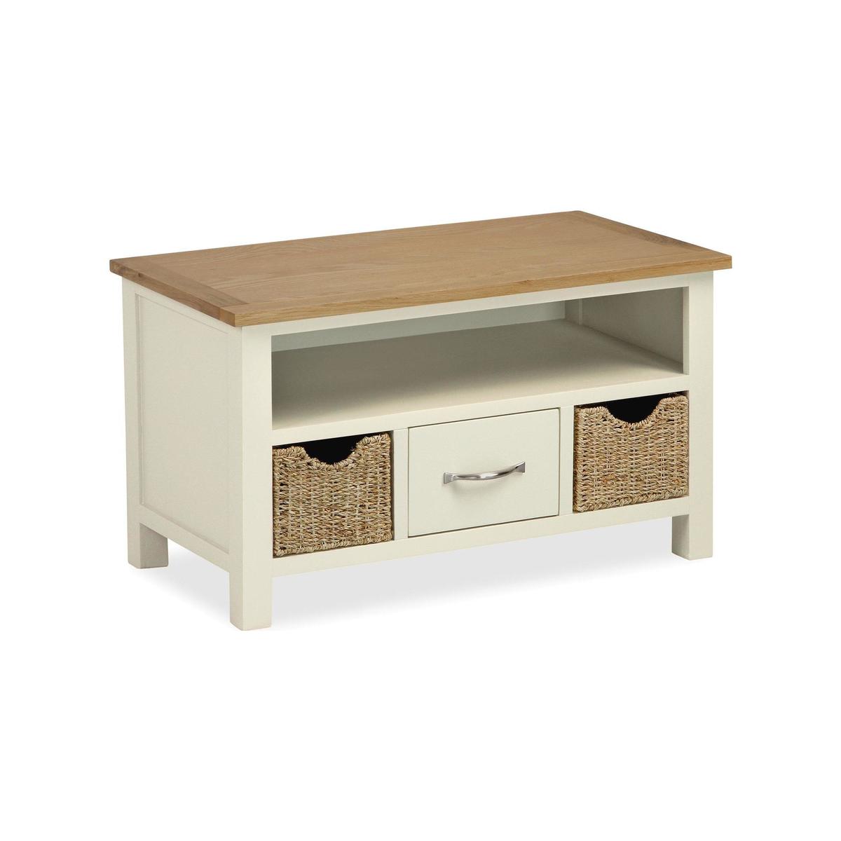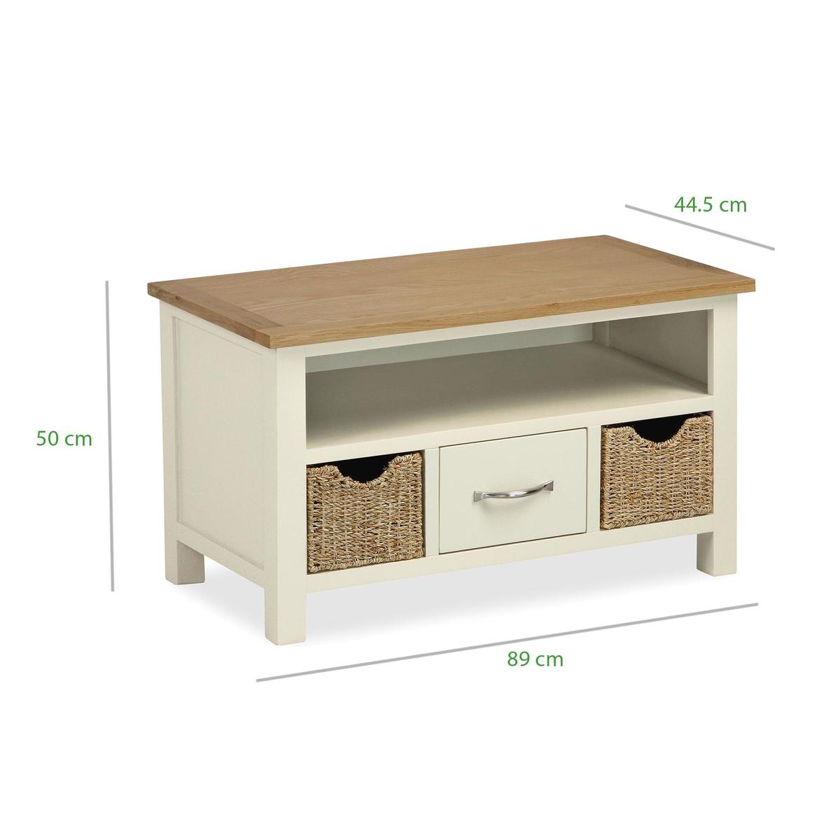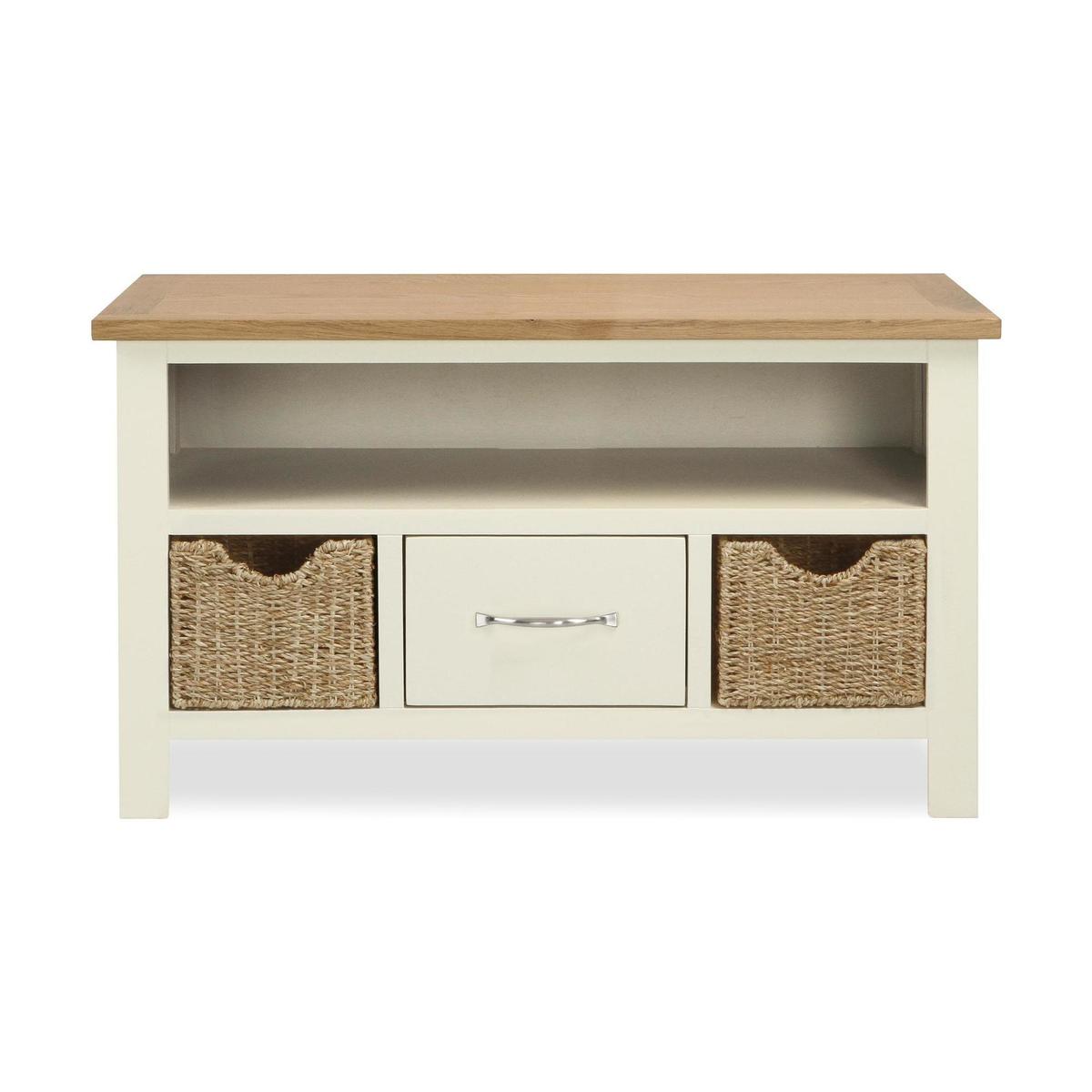 Dunelm Exclusive - Designed and Developed by Dunelm Designed with solid oak and oak veneered tops with a warm lacquered finish, the Sidmouth range is inspired by clean, simplistic styling. Featuring a smooth cream, painted finish, this fully assembled TV stand will make a classic addition to any room. Featuring two stylish woven seagrass baskets, this TV stand is crafted with an abundance of storage. Complete with a fixed shelf, this TV stand is fashioned with one spacious drawer, finished with a curved, cast metal handle, decorated with a chrome finish. This Range is also available in [Oak](https://www.dunelm.com/category/home-and-furniture/furniture/shop-by-collection/sidmouth-furniture-collection?f_attributes.objDunelmsku.colourGroup=Brown) and [Cotton.](https://www.dunelm.com/category/home-and-furniture/furniture/shop-by-collection/sidmouth-furniture-collection?f_attributes.objDunelmsku.colourGroup=Natural&f_attributes.objDunelmsku.colourGroup=Grey)