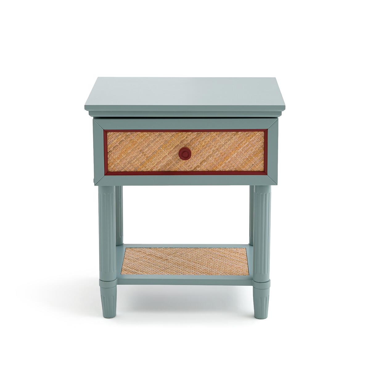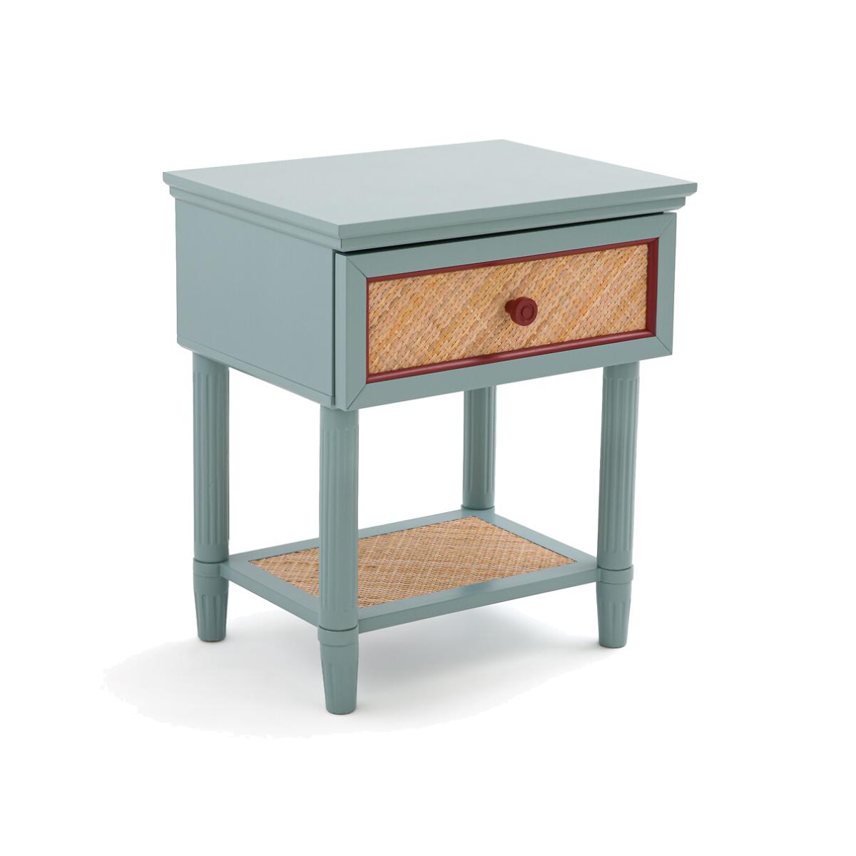 With a 'country house, bric-a-brac' spirit. the Sidore bedside table has the charm of revisited antique furniture: The wood is painted in a soft pastel colour, and the front of the rattan drawer is highlighted with a contrasting frame. Ideal for creating a shabby chic atmosphere in the bedroom. Product Details • 1 drawer and 1 shelf • Lacquered MDF structure • Lacquered solid pine legs • FSC® certified wood • Acrylic finish • Drawer front and shelf covered in woven rattanDimensions. Overall • Width: 45cm • Height: 52.5cm • Depth: 35cm • Weight: 8.3kg. Usable space • Drawer: L35 x H8.5 x D27.2cm • Shelf :L30.5 x H23.5 x D20.5cm • Height of legs: 8.2cmDelivery:. This product required assembly. Available for home delivery. • WOOD FROM SUSTAINABLY MANAGED FORESTS. FSC® certified wood comes from forests that are environmentally, socially and economically well managed. Dimensions and weight of parcel1 parcel • L67 x H14 x D43cm. 9.8kg