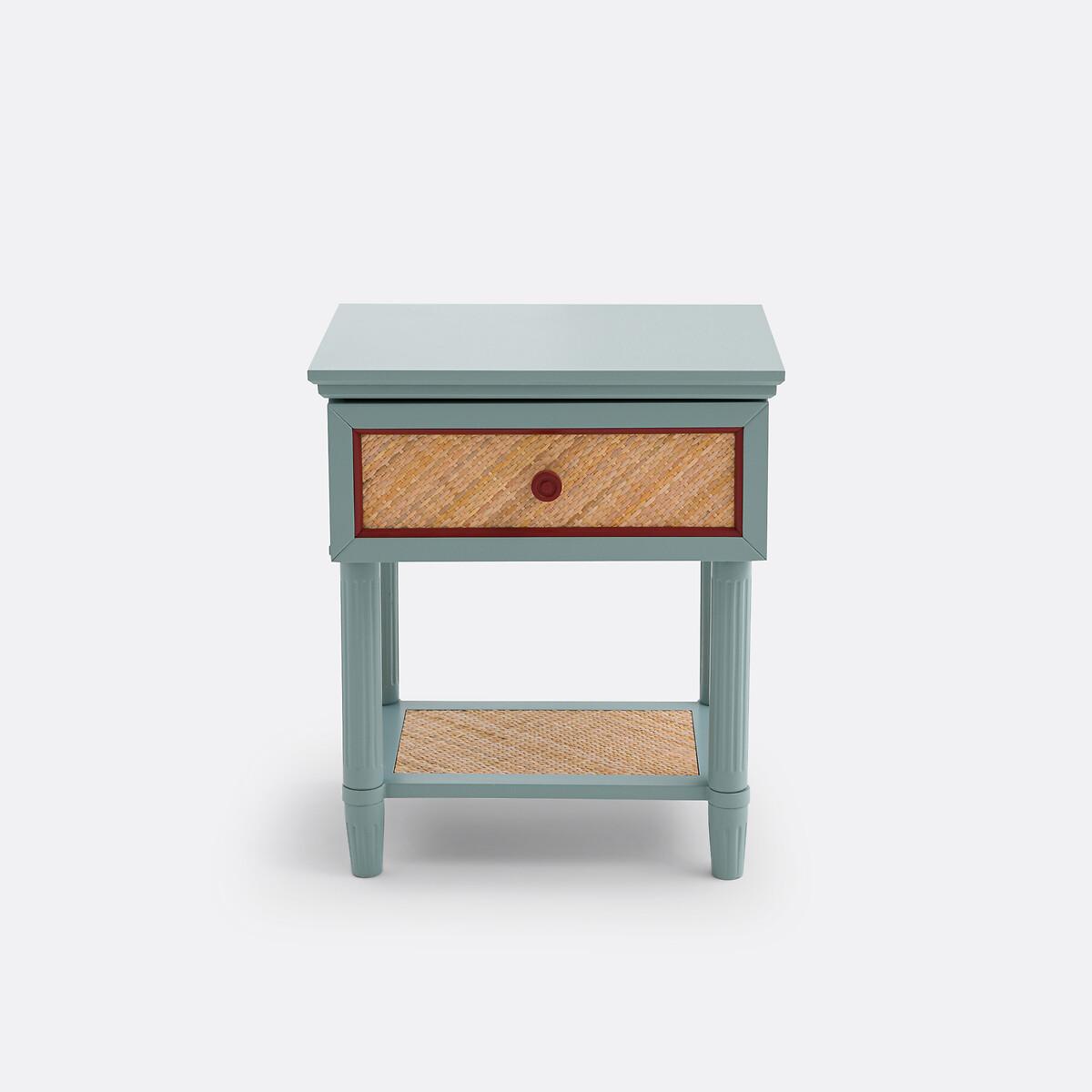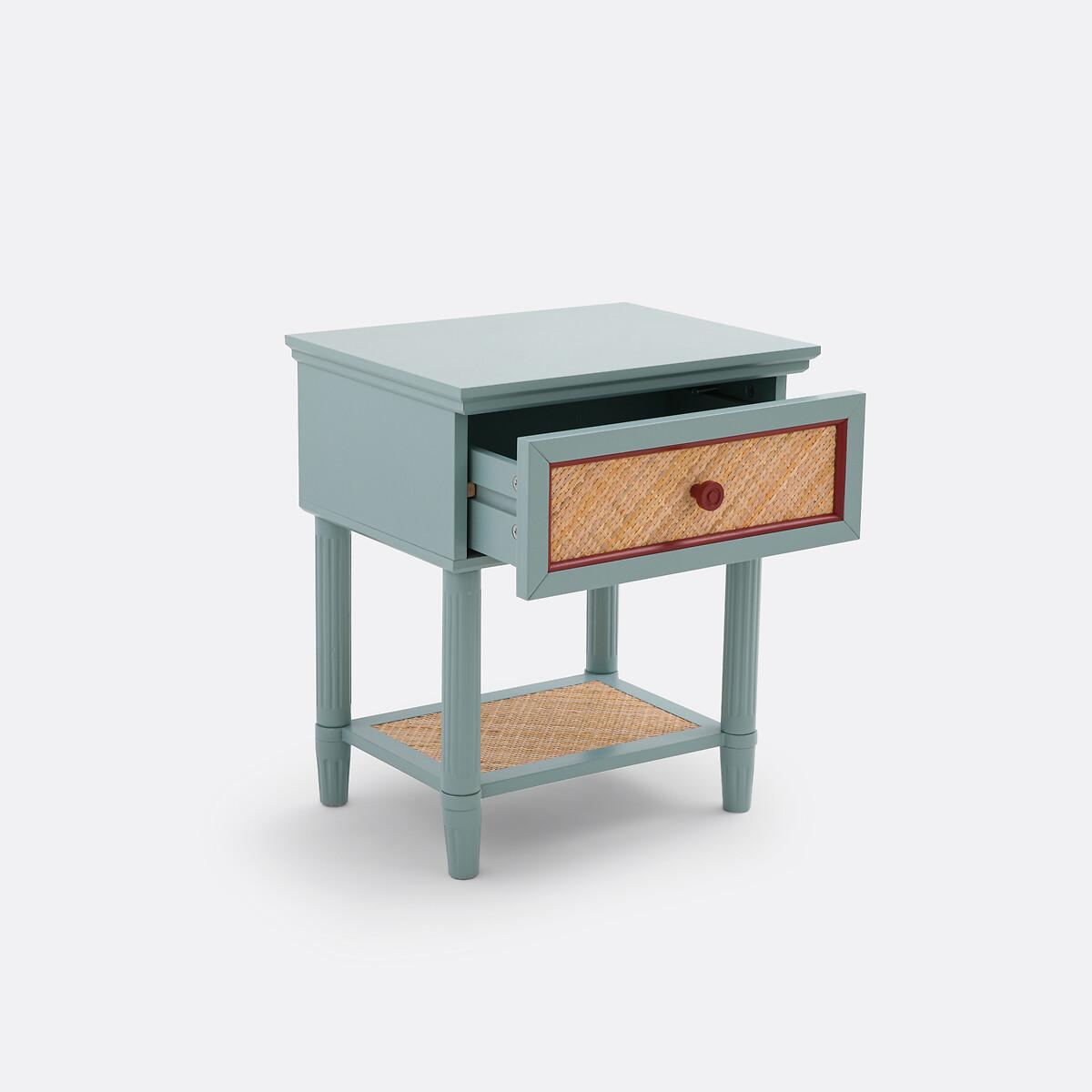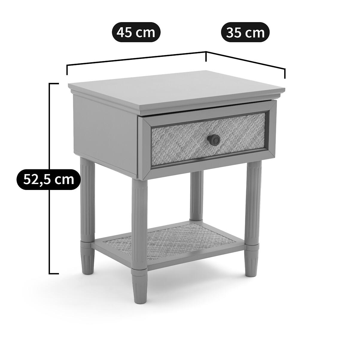 With a 'country house, bric-a-brac' spirit. the Sidore bedside table has the charm of revisited antique furniture: The wood is painted in a soft pastel colour, and the front of the rattan drawer is highlighted with a contrasting frame. Ideal for creating a shabby chic atmosphere in the bedroom. Product Details • 1 drawer and 1 shelf • Lacquered MDF structure • Lacquered solid pine legs • FSC® certified wood • Acrylic finish • Drawer front and shelf covered in woven rattanDimensions. Overall • Width: 45cm • Height: 52.5cm • Depth: 35cm • Weight: 8.3kg. Usable space • Drawer: L35 x H8.5 x D27.2cm • Shelf :L30.5 x H23.5 x D20.5cm • Height of legs: 8.2cmDelivery:. This product required assembly. Available for home delivery. • WOOD FROM SUSTAINABLY MANAGED FORESTS. FSC® certified wood comes from forests that are environmentally, socially and economically well managed. Dimensions and weight of parcel1 parcel • L67 x H14 x D43cm. 9.8kg