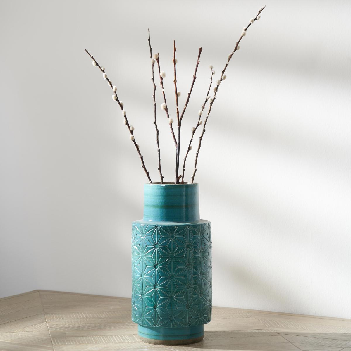I really like this vase for adding a touch of colour and texture to a range of interiors. Its aquamarine hue and etched surface give it a sophisticated yet understated look, making it versatile enough to work well in both contemporary and eclectic spaces. It's ideal for displaying simple arrangements of dried or bare branches, as shown here, or even single blooms for a minimalist feel. Practical styling tips include pairing it with neutral-toned accessories to highlight its colour or using it as a statement piece on a side table or mantel. Its sturdy form also makes it suitable for layered or asymmetric floral arrangements, adding interest and height to your vignette.