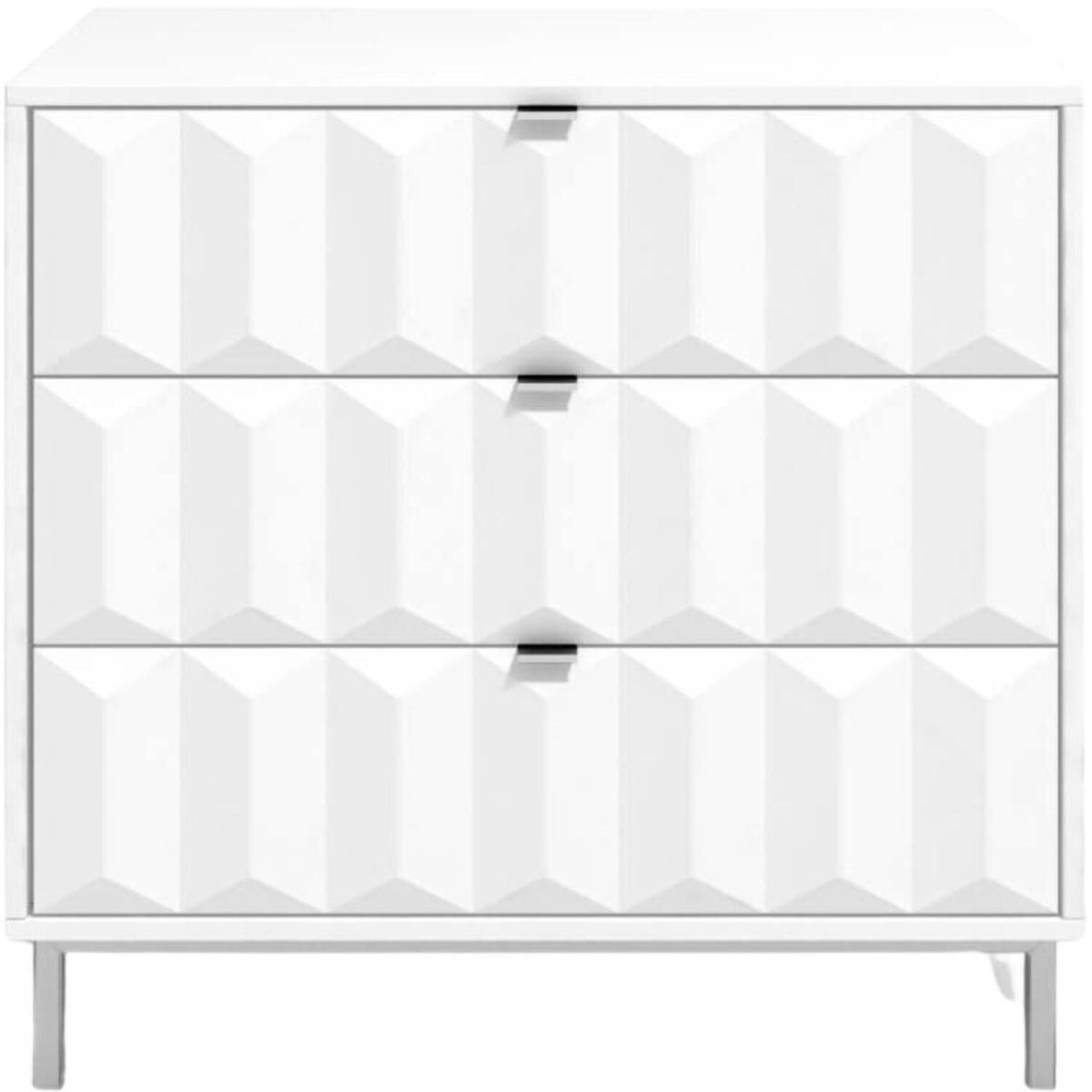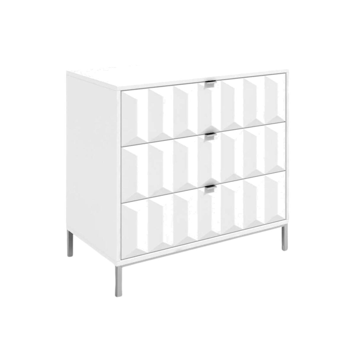 The Siena 3 drawer chest is available in a choice of white or grey with gloss painted geometric contoured drawer fronts. Its an ideal storage piece for your bedroom or anywhere in the home where you want a stylish, eye-catching piece of furniture. Made from manufactured wood board with attractive contoured front detailing and real metal handles. The nickel electroplated metal legs elevate the cabinet making it easy to clean around. The drawers open easily on soft glide roller runners. There are 3 full width drawers to maximise the storage space on offer.