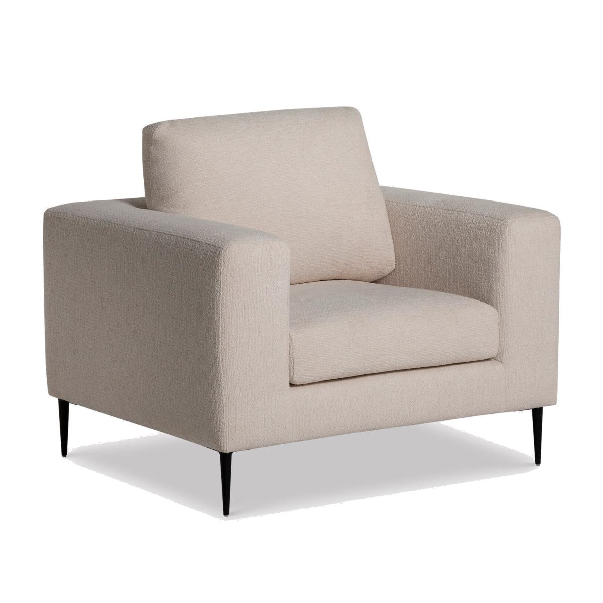 The Sienna Armchair blends modern elegance with exceptional durability, making it a perfect addition to any space. Upholstered in a neutral-toned, 100% polyester fabric, it offers a soft yet resilient texture that is both stylish and easy to maintain. The sturdy frame, crafted from pinewood, plywood, and hardboard, ensures long-lasting strength and stability. Complementing its sophisticated design, the steel feet, finished in sleek black paint, provide robust support and a contemporary touch. Whether for lounging or everyday use, the Sienna Armchair delivers comfort, durability, and timeless appeal.
