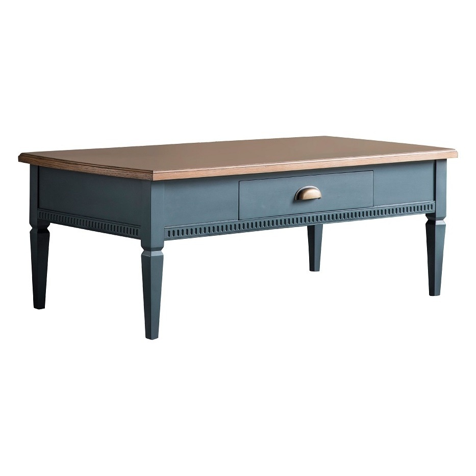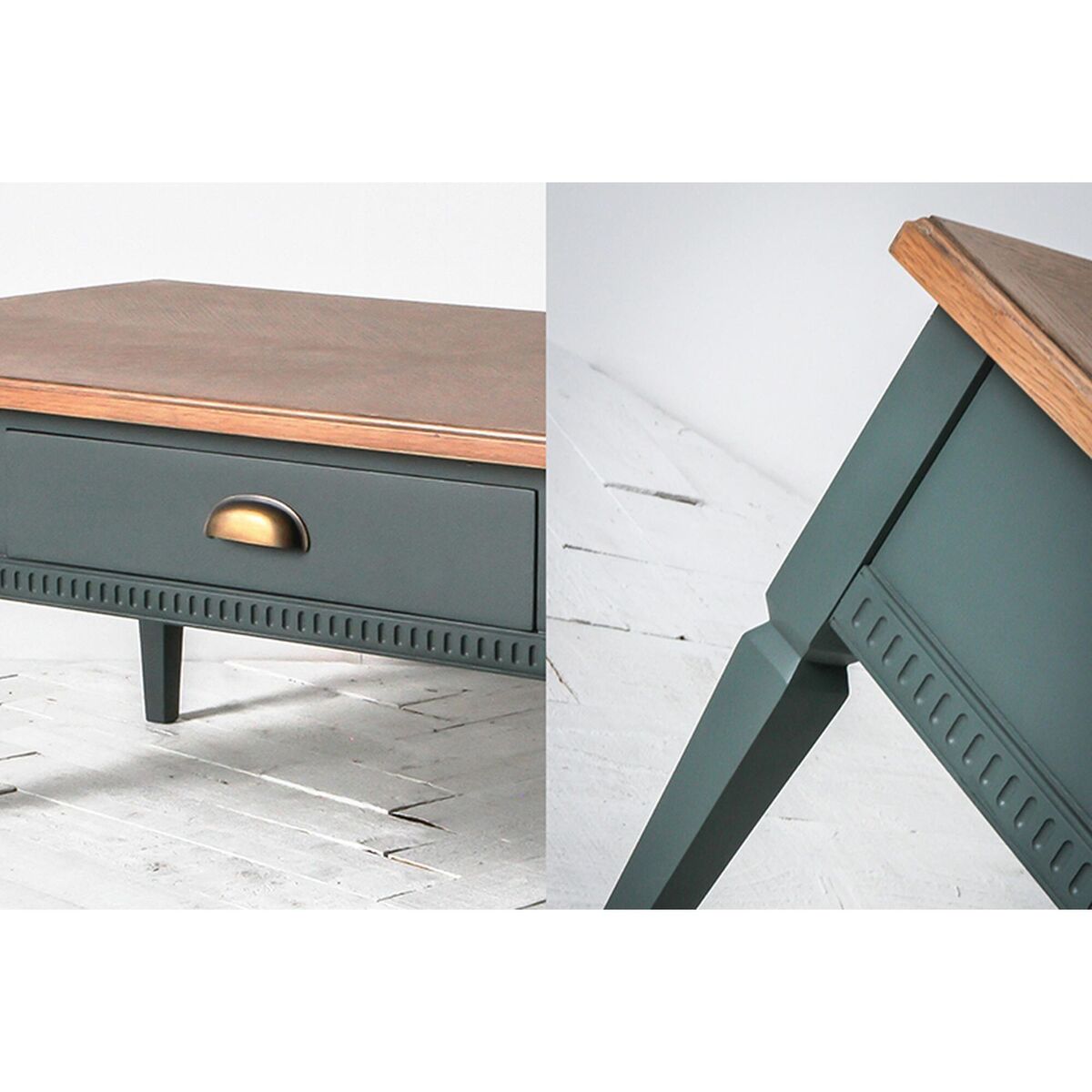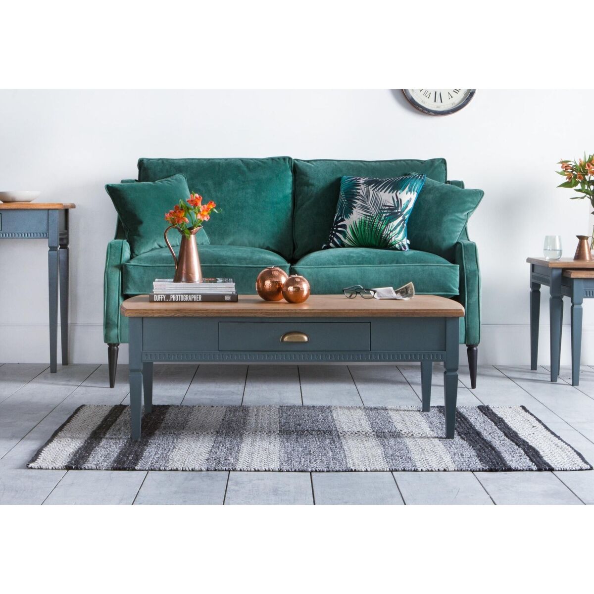 Meet the Sienna, a delightful coffee table of beautiful subtlety. Made from a blend of Oak and Mahogany, the Sienna boasts a delightful Myrtle Green shade that evokes the teal trend while offering a more balanced look that will fit more easily into any setting. Contrasting the main body, the top surface of the Sienna has a natural finish that makes the parquet texture glow beautifully. A single drawer with an antiqued metal handle completes the look and provides handy storage for small items. The Sienna is ideal to spice up a neutral palette and we believe it's perfect for conservatories and living rooms with casual seating.
