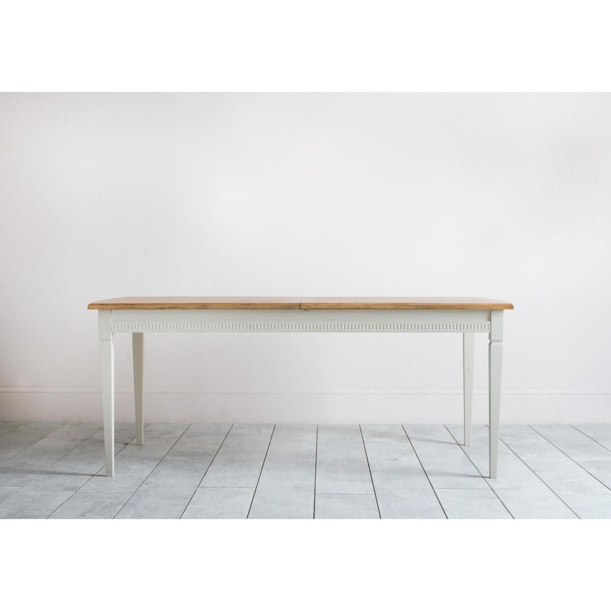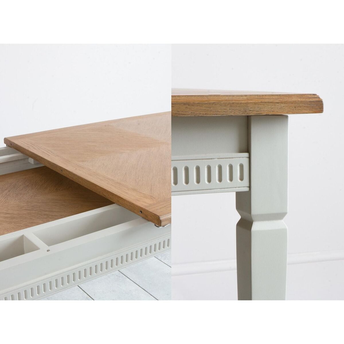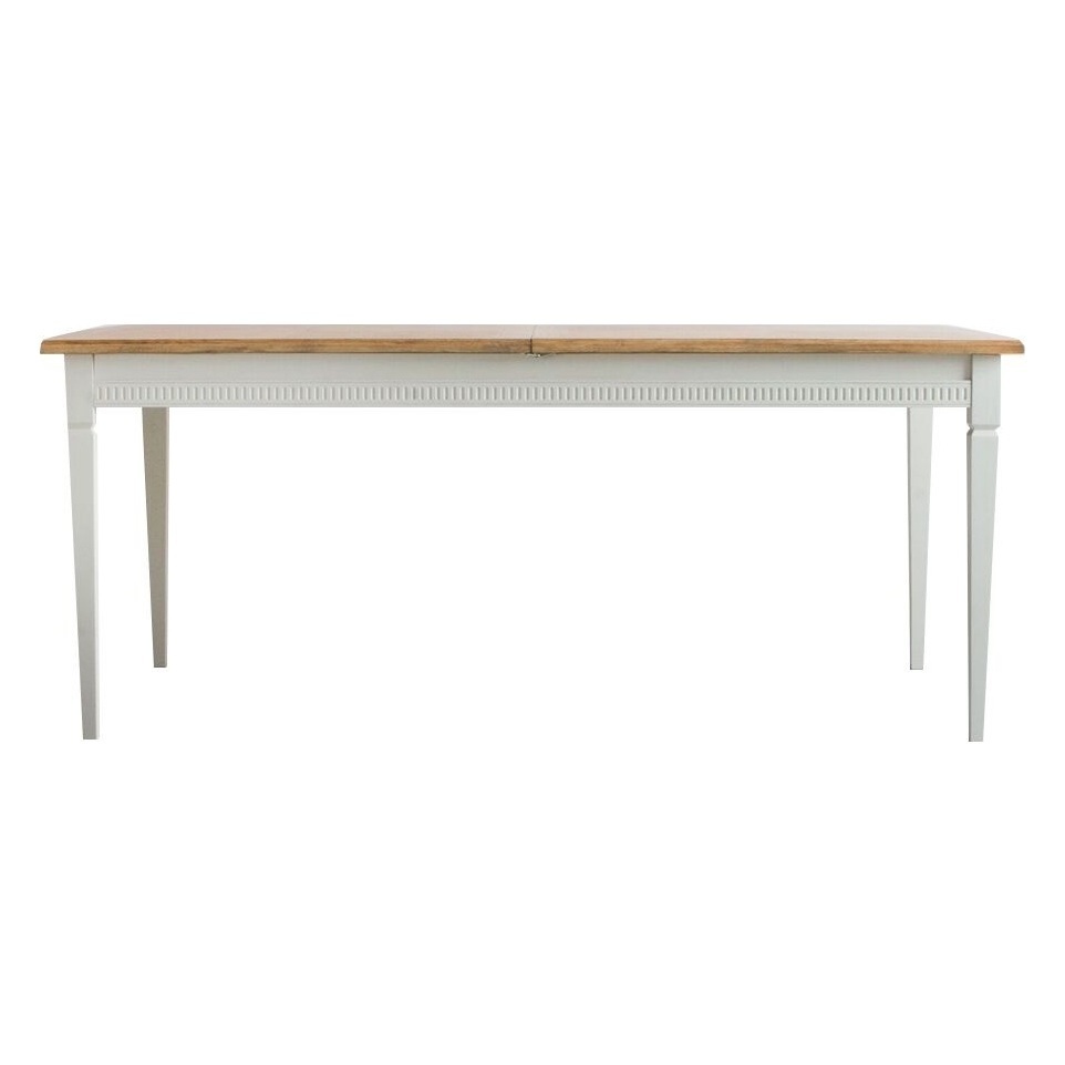 Meet the Sienna dining table, a dining essential to transform your Spring meals into stylish banquets. This extendable dining table combines the strength of an Acacia and MDF wood frame, painted in a bright ice grey hue, with the spectacular wood grain of a light Oak veneer top. Dark paint shades, teamed with natural finishes, are all the rage in the interiors world and the Sienna knows it well, providing a masterclass of contemporary style with added functionality. Simply pull both sides of the tabletop to reveal an additional surface that will extend it in seconds to cater for parties of all sizes. Combine the Sienna dining table with the matching chairs from the range to create a dining centrepiece that will leave your guests in awe.