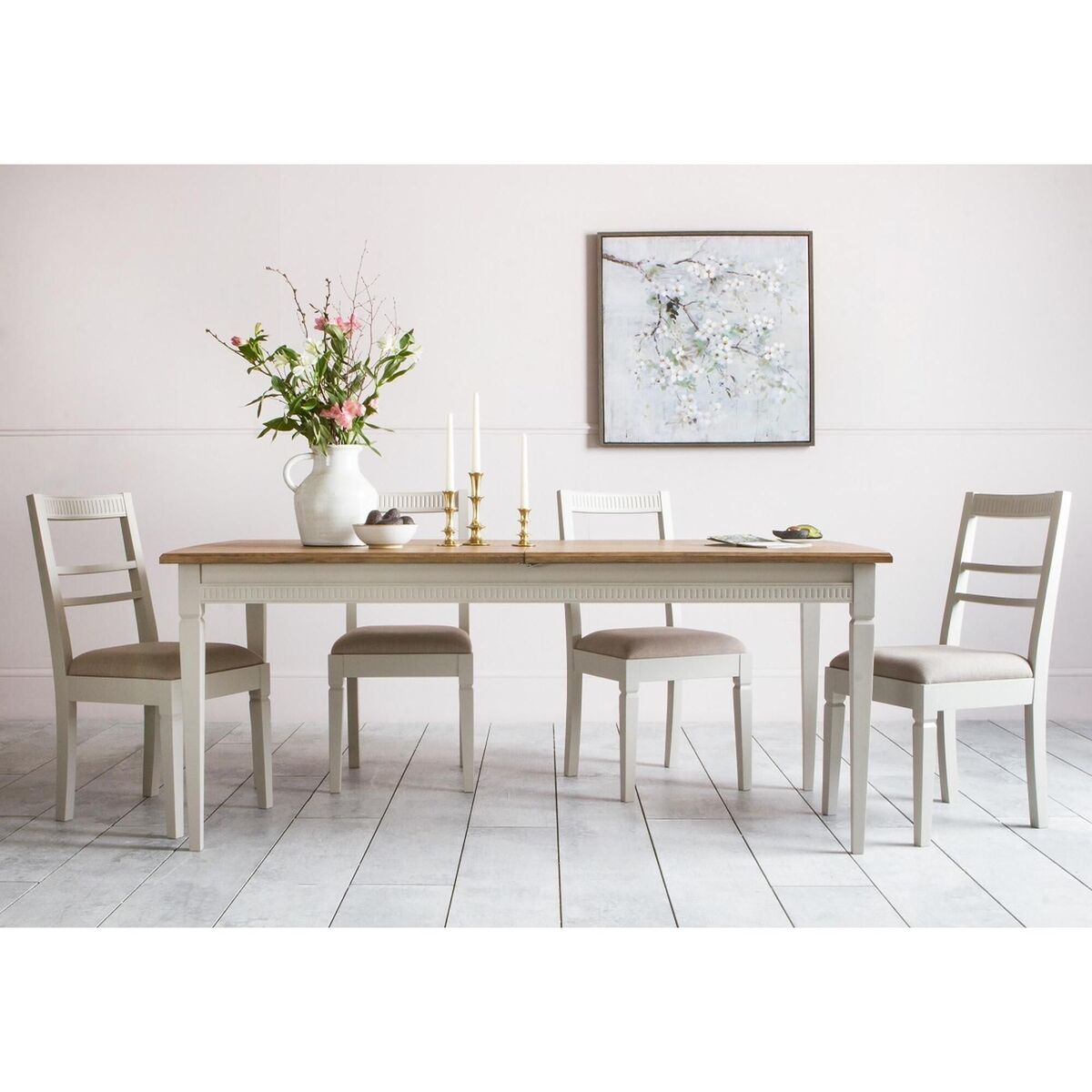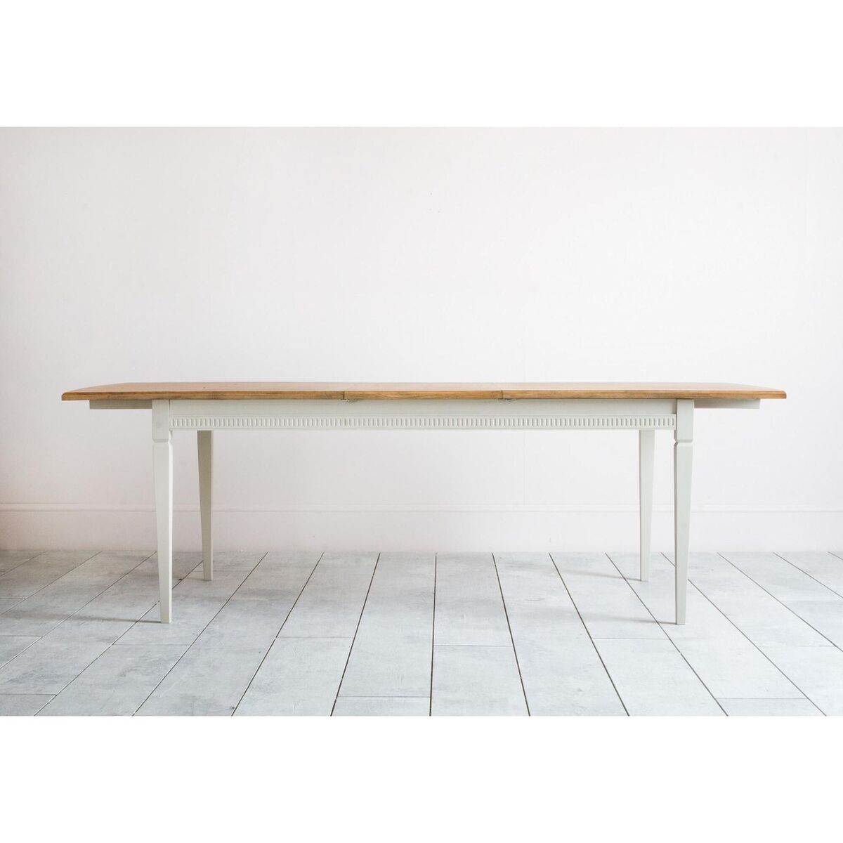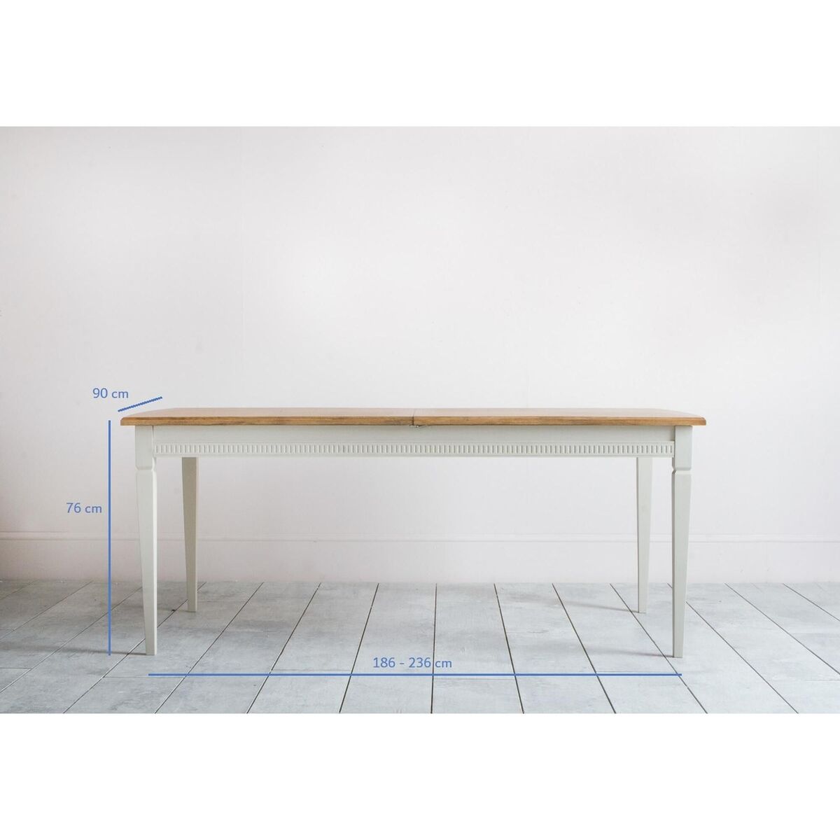 Meet the Sienna dining table, a dining essential to transform your Spring meals into stylish banquets. This extendable dining table combines the strength of an Acacia and MDF wood frame, painted in a bright ice grey hue, with the spectacular wood grain of a light Oak veneer top. Dark paint shades, teamed with natural finishes, are all the rage in the interiors world and the Sienna knows it well, providing a masterclass of contemporary style with added functionality. Simply pull both sides of the tabletop to reveal an additional surface that will extend it in seconds to cater for parties of all sizes. Combine the Sienna dining table with the matching chairs from the range to create a dining centrepiece that will leave your guests in awe.