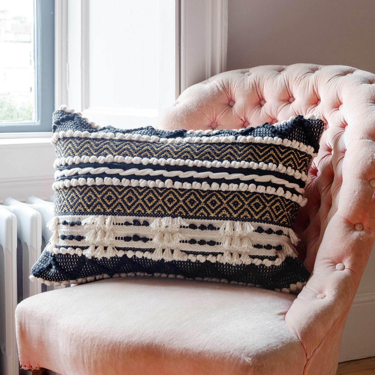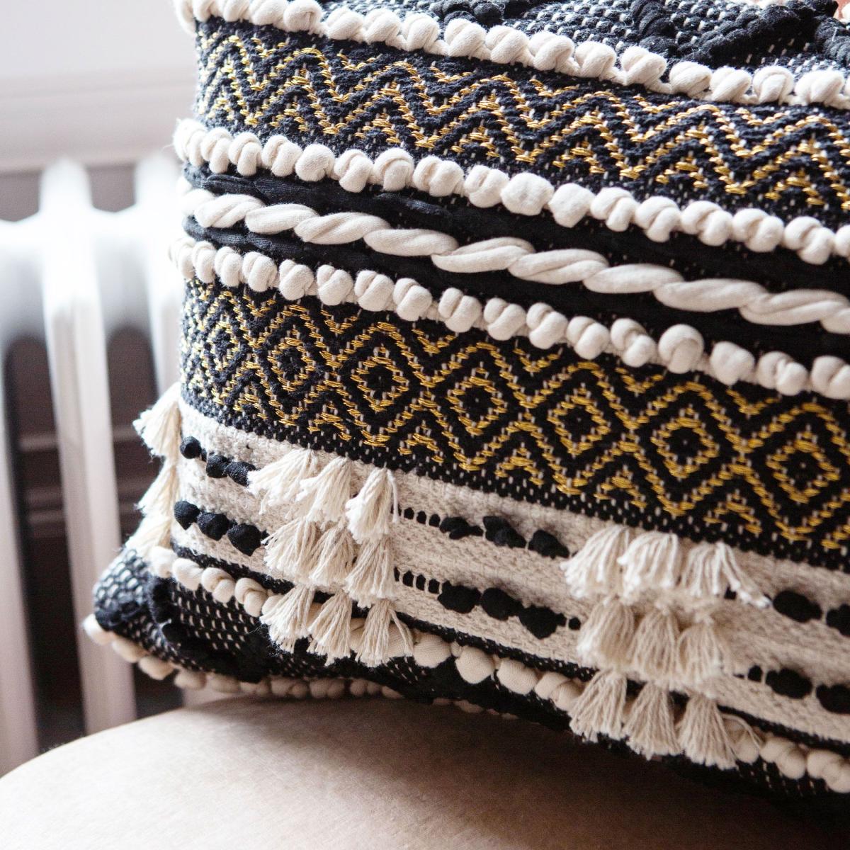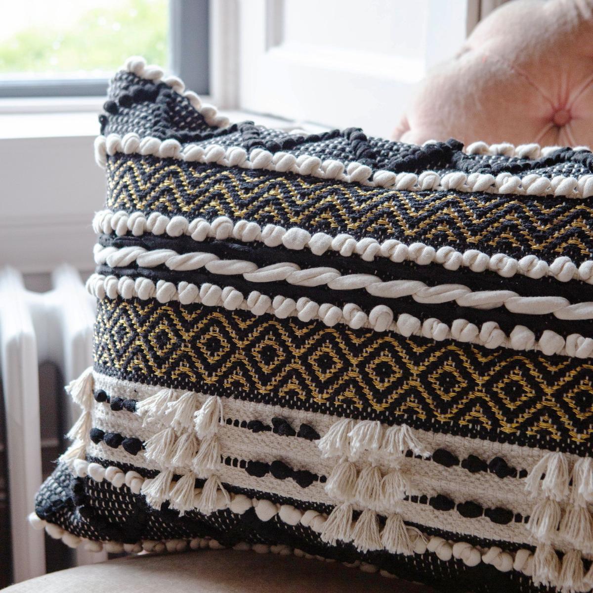 A rectangular monochrome cushion featuring gold thread details and pompom tasselled finishes, handwoven in India by talented artisans.