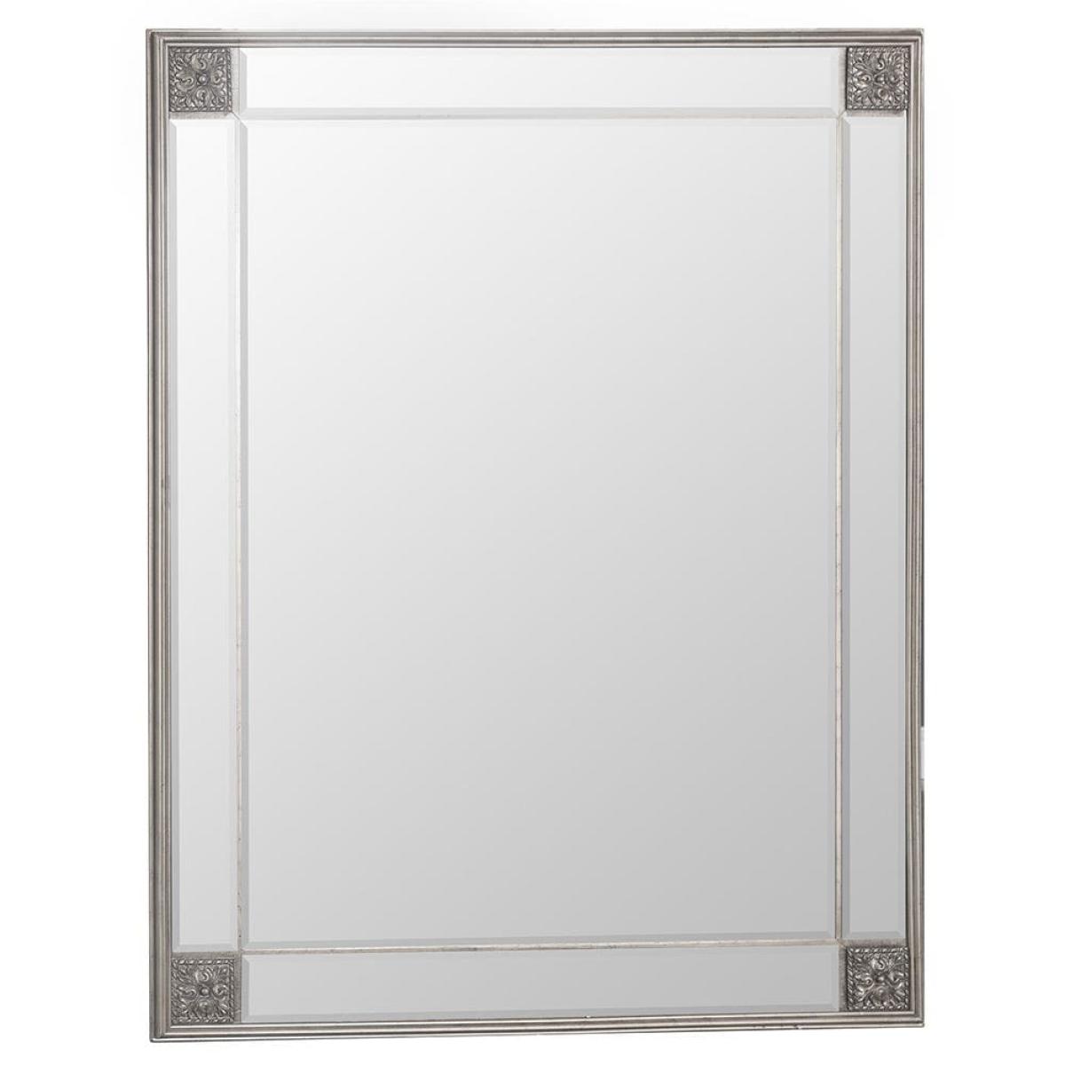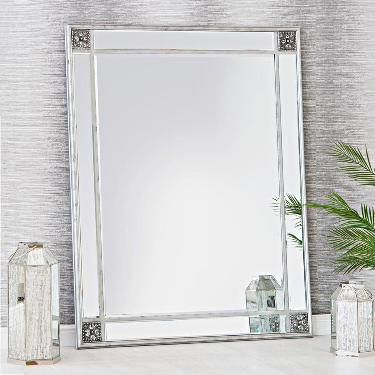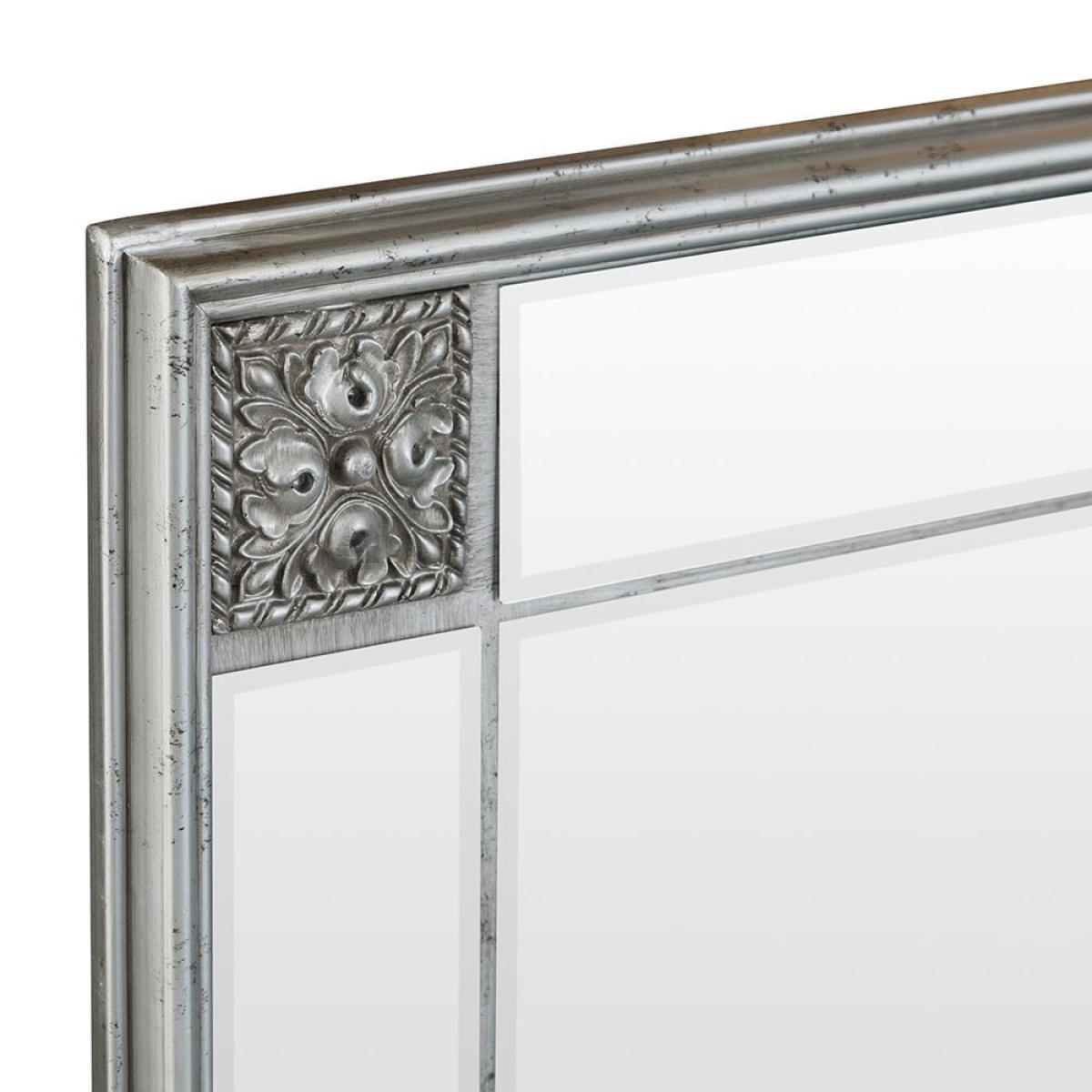Whether you’re dressing for the day or trying on an impulse purchase, our Sienna silver frame leaner mirror (115 x 145cm) will help you nail the perfect look. You can lean this substantial mirror against a wall in your bedroom or hallway for easy access to your reflection. Alternatively, mount it in either landscape or portrait format according to your wall space. The silver wooden frame has resin detailing to give it a distressed appearance, and features a floral embellishment at each corner. This vintage effect complements the bevelled glass to enhance any room in your home.