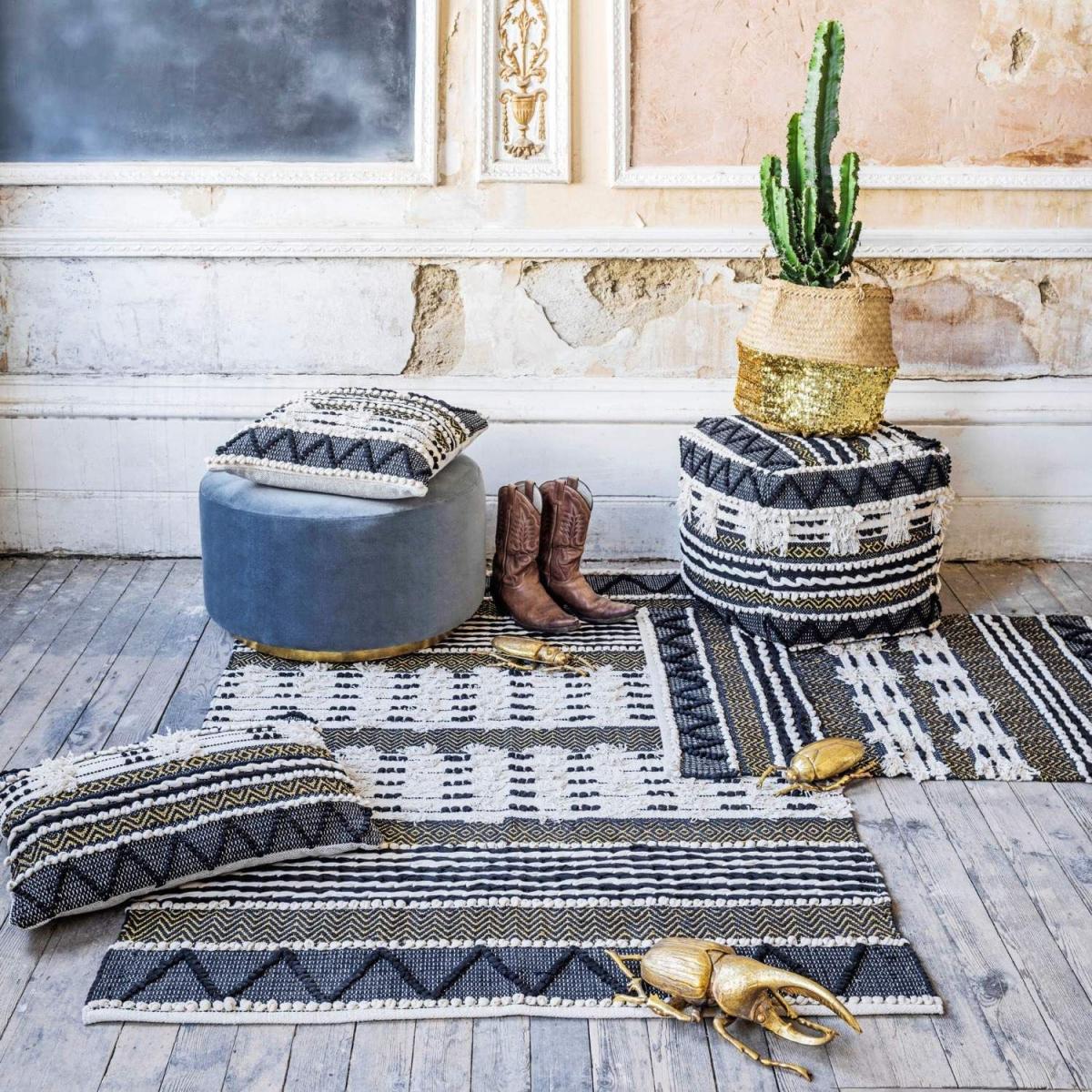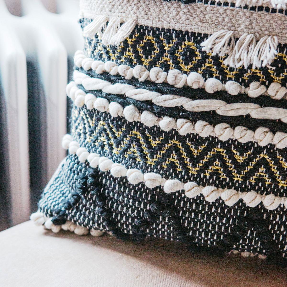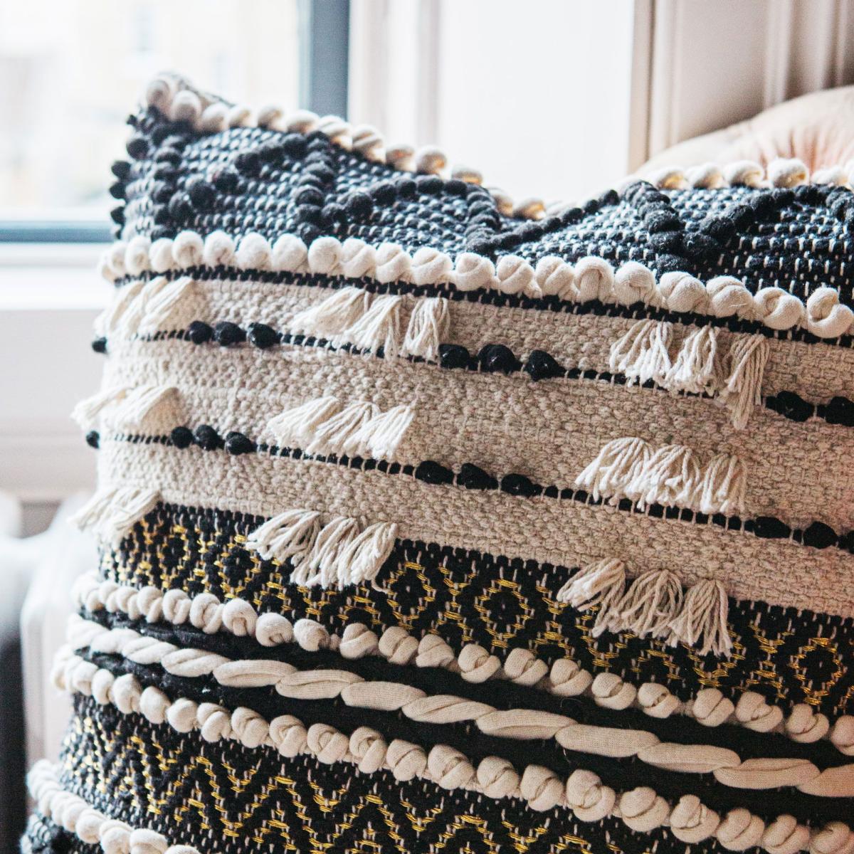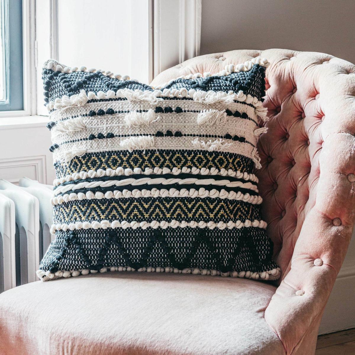 I love the black and white bobble cushion for its graphic pattern and tactile texture, making it a striking yet versatile addition to various interiors. It works particularly well in monochrome schemes or modern, eclectic spaces where it can add contrast and visual interest. To style it effectively, consider pairing it with solid-coloured cushions in complementary tones or mixing it into a collection of other textured throws and pillows for a layered look. It's ideal for adding a playful element to sofas, armchairs, or beds, and its geometric design makes it suitable for both contemporary and bohemian settings.