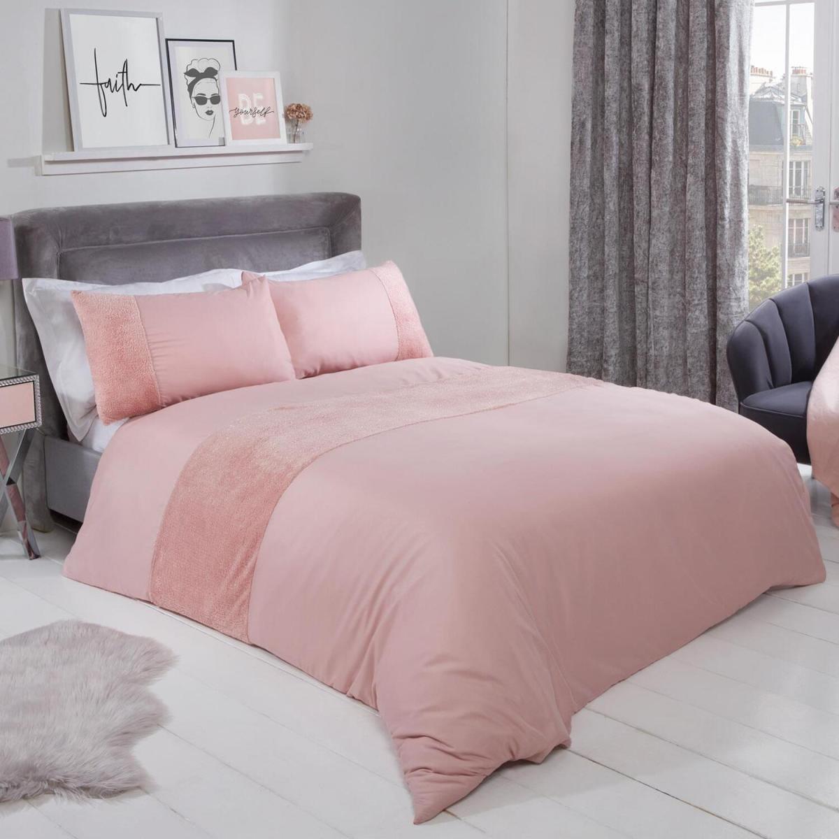 Our Sienna teddy glitter fleece panel duvet will add some sparkle to your home, featuring a super soft fleece panel with shimmer effect entwined in the teddy fabric, which has been expertly placed towards the top of the duvet, and on a panel on the edge of the pillow for added comfort and glamour. This item is a perfect way to give your room a vibrant, warm fresh look. This duvet set is made with super soft touch teddy fleece polyester band and durable polyester face and reverse, making it comfortable and stylish. This easy-care bed linen will give your bedroom that modern feel and once washed it has great resistance to wrinkles, fading and shrinkage. This soft teddy panel set includes a duvet cover and matching pillow case(s), all you need for a good nights sleep.