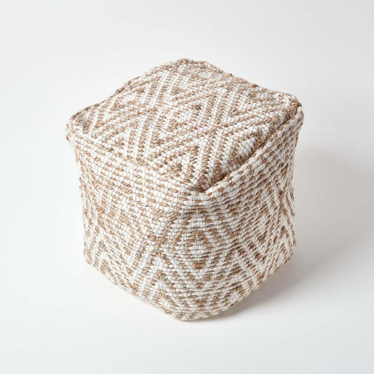 Available in a choice of three sizes the Sierra pouffe from Homescapes has a geometric grey and white pattern and is filled with polystyrene beads for a sturdy and comfortable feel Perfect for your bedroom living room or dining room the Sierra Chindi footstool will brighten up any of your home interiors and as well as foot rests they make a great occasional seat for when you have guests visiting The Sierra pouffe is handmade in India on a traditional handloom from natural jute and cotton which gives it that textured and laid back look Tightly woven the fleece threads make a strong and durable material that is suitable for daily use Generously filled with polystyrene beads for a supportive but comfortable occasional seat or footstool This pouffe is available in two square sizes (40 cm square and 60 cm square) as well as a round size (45 cm round) so you are sure to find the right size for your home The Sierra pattern is also available from Homescapes in four rug sizes Part of Homescapes range of footstools with a wide selection of colours and designs Spot clean only