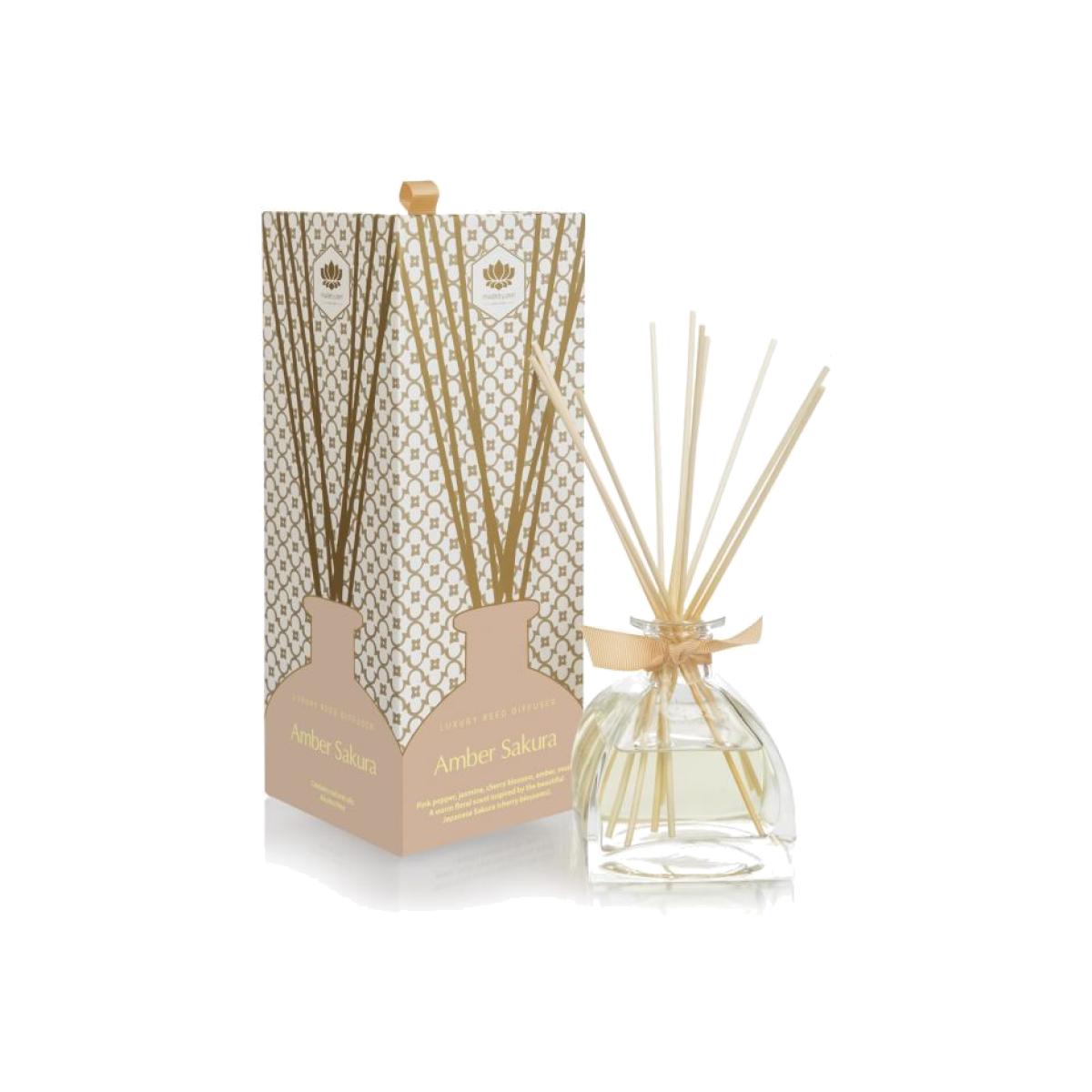 Held in an elegantly shaped bottle with accompanying gold ribbon, each of the Reed Diffusers contains 200ml of fragrance. The Amber Sakura is inspired by Japanese Sakura (cherry blossom) with pink pepper, jasmine Sakura blossom, amber and musk, making the diffuser scent both unique and desirable. Each of the Reed Diffusers in this range are alcohol free, includes natural florals and fruit oils and come in their own opulant gift boxes.