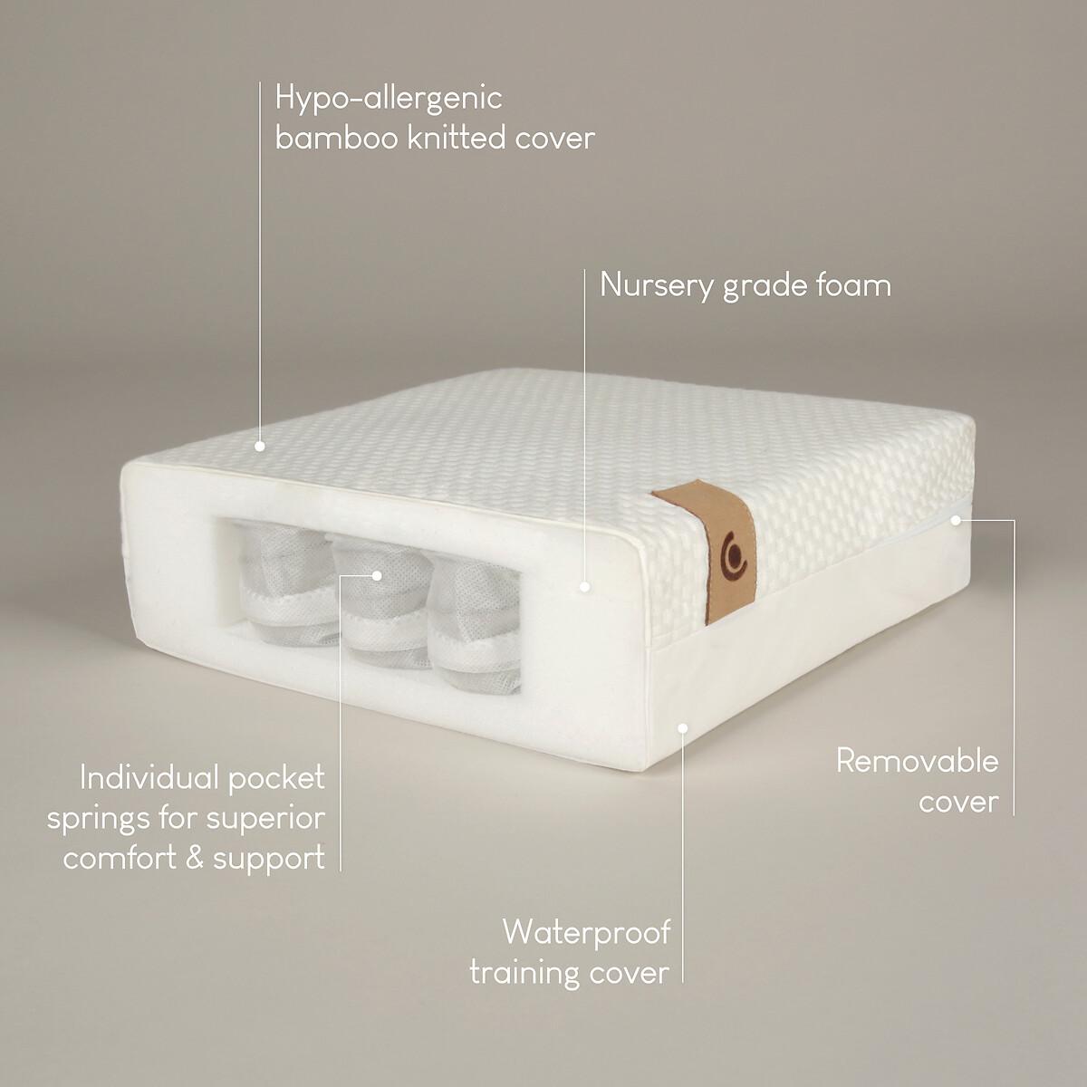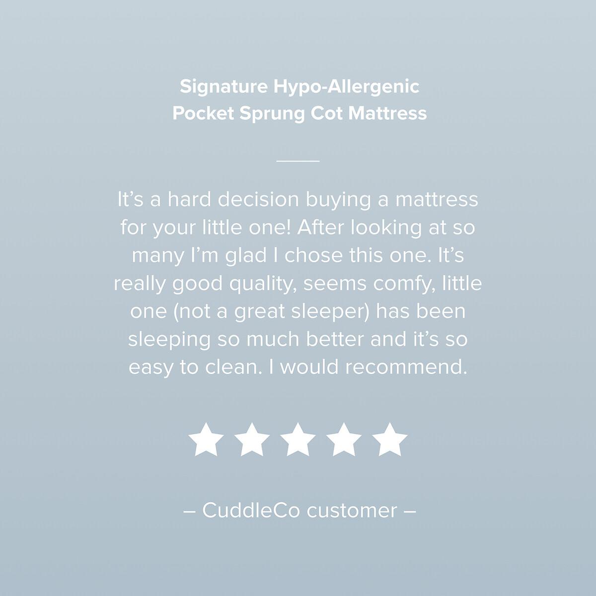 A better night's sleep for your baby & you. The Signature mattress is our most luxurious mattress, the pocket springs gently contour and respond to your child’s position as they sleep and will consistently support their ever changing shape and size. Our Signature mattress features two unique sides and is designed to be the only mattress you need as your baby grows. One side features our signature bamboo fabric that has natural hypoallergenic and anti-microbial properties, helping to maintain a germ free cleaner environment, whilst the reverse side showcases our easy clean waterproof training layer, ideal for those first potty training days. The perfect match for you and your baby! Designed to care, designed to last. Weight:Cot mattress - 3.8kg, Cot bed mattress- 5.3kg. Top 65% Polyester, 35% Bamboo with PU Backing. Base: PVC. Core: Pocket Springs. Sizes Available: - 120x60cm - 140x70cm. Please note for hygiene reasons all mattresses must be unopened in their sealed bags in order to be returned. This product will be dispatched by one of our trusted suppliers. You’ll be contacted by their selected courier about your delivery. CUDDL01