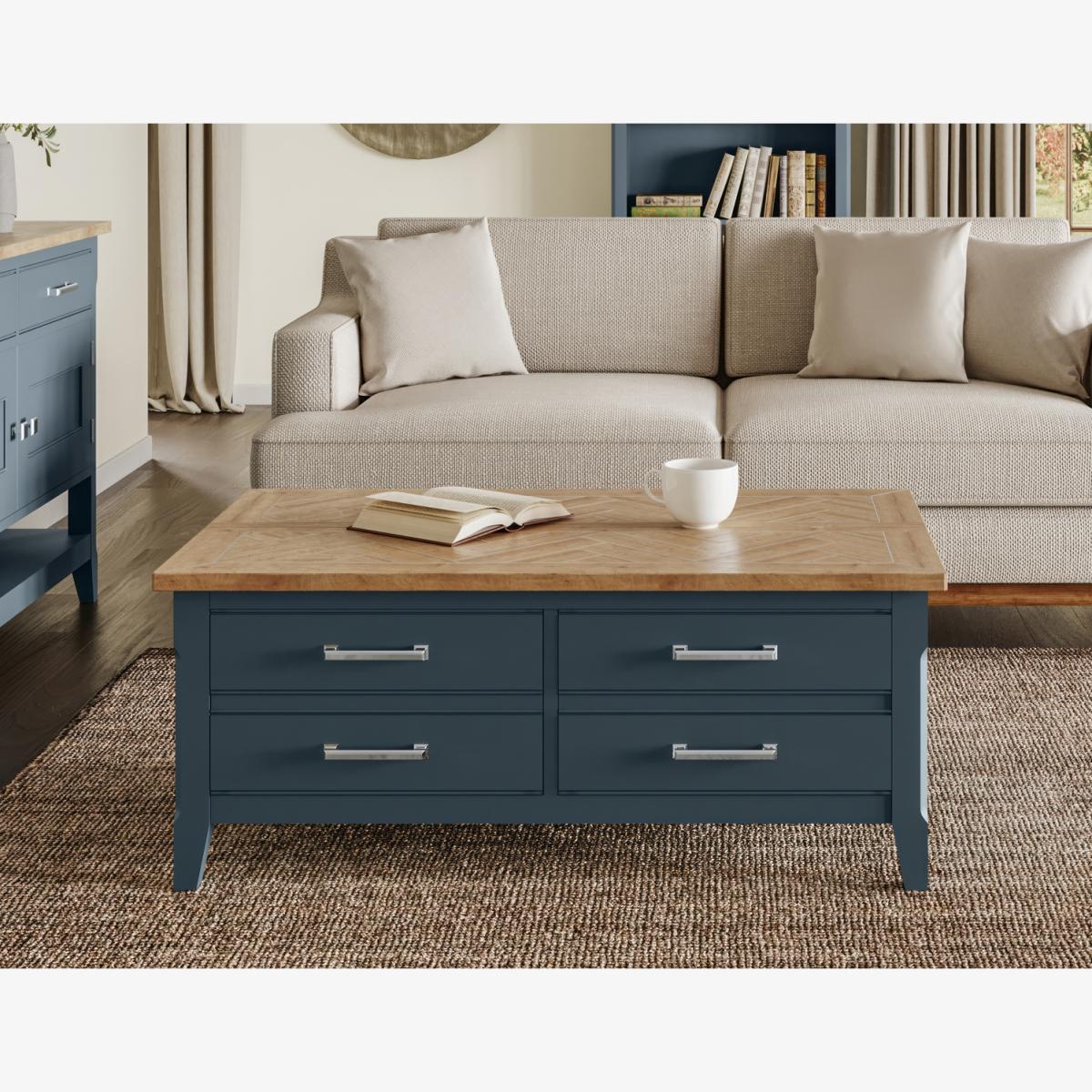 The Signature Blue Coffee Table presents a fusion of functionality and exquisite craftsmanship, evident in its meticulous hand-finishing process. Beginning with the oak parquet top, each stage is executed with precision. Through delicate distressing, the wood's natural character is enhanced before the application of a thin layer of white paint. This layer is then meticulously hand-rubbed back to reveal the intricate details, culminating in the application of a resilient clear lacquer for enduring beauty and durability. This coffee table boasts practical features including four drawers and a hidden storage trunk, seamlessly integrated into its design. Its overall dimensions of H46 x W110 x D66 cm offer a harmonious balance of style and utility, ensuring it complements any living space with grace. The four drawers, measuring H12 x W46 x D25 cm each, provide convenient storage solutions for smaller items, maintaining a clutter-free environment. Meanwhile, the hidden storage trunk, sized at H28 x W100 x D25 cm, offers ample space to stow away larger essentials discreetly. Confidence in the product is assured with a comprehensive FIVE YEAR warranty, safeguarding against any manufacturing-related issues. This warranty reflects our commitment to delivering products of the highest quality and ensuring customer satisfaction. Explore our exclusive Signature Blue collection to discover additional pieces that elevate your living space. Crafted with premium materials and timeless design, each item is meticulously crafted to endure the test of time, exuding elegance and sophistication in every detail. Designed for longevity, this high-end collection may require minor assembly, ensuring a hassle-free experience for our customers. It is a collection crafted to withstand the rigors of daily use while seamlessly blending practicality with timeless elegance.