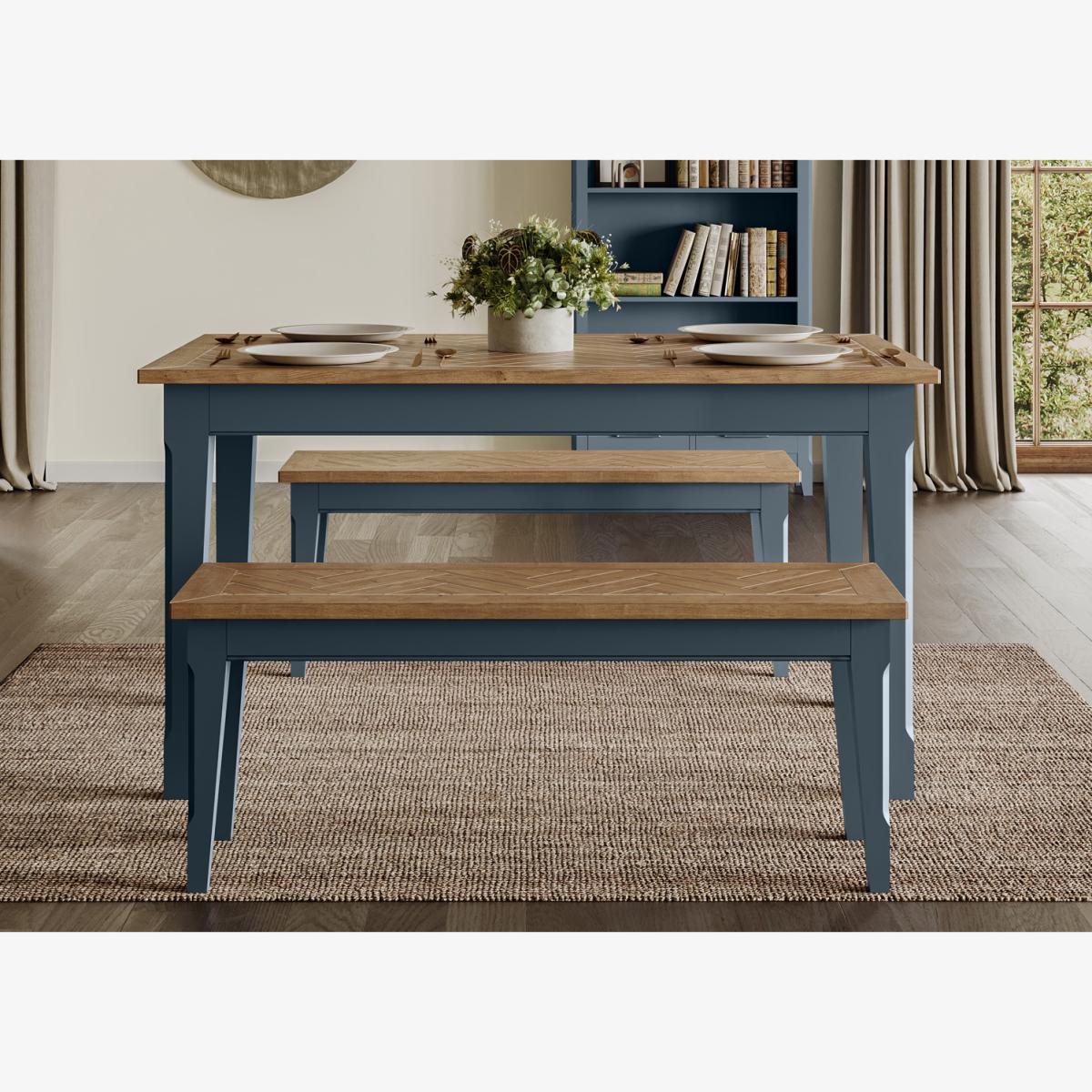 The Signature Blue 140cm x 80cm Dining Table exemplifies meticulous craftsmanship in its hand-finishing process. Each step is carefully executed, beginning with the delicate distressing of the oak parquet top. Subsequently, a thin layer of white paint is meticulously applied and hand-rubbed back, revealing the natural beauty of the wood. The final touch involves the application of a resilient clear lacquer, resulting in a stunning and durable appearance. With overall dimensions of H76 x W140 x D80 cm, this dining table offers ample space for dining and entertaining, accommodating gatherings with ease. The sleek and modern design adds an elegant touch to any dining space, enhancing its aesthetic appeal. For added assurance, the table is backed by a comprehensive FIVE YEAR warranty, providing coverage for any manufacturing-related issues. Customers can trust in the quality and reliability of our products, ensuring satisfaction and peace of mind. Explore the entirety of our exclusive Signature Blue collection to discover complementary pieces that elevate your living space. Crafted with premium materials and timeless design, this collection is meticulously crafted to withstand the test of time, exuding elegance and sophistication in every detail. Designed with convenience in mind, this high-end collection may require minor assembly, ensuring straightforward setup without compromising on quality. Experience the luxury and functionality of the Signature Blue collection in your home today, and elevate your dining area with timeless elegance and impeccable craftsmanship.