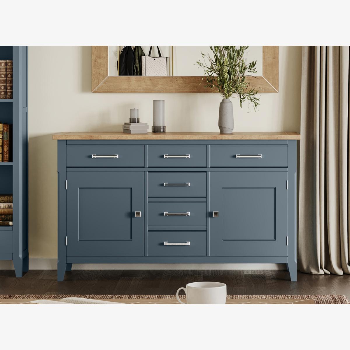 The Large Sideboard from the Signature Blue collection showcases meticulous craftsmanship in its hand-finishing process. The oak parquet top undergoes delicate distressing, followed by the application of a thin layer of white paint meticulously hand-rubbed back. Finally, a resilient clear lacquer is applied, resulting in a breathtaking and durable appearance. Featuring six drawers and two cupboards, this sideboard offers ample storage space. The overall dimensions are H82 x W140 x D48 cm, providing generous room for organizing belongings. The two cupboards, sized H52 x W42 x D32 cm, include a shelf in the middle for added storage versatility. The top outer drawers, measuring H13 x W44 x D32 cm, offer convenient access to frequently used items. Additionally, four smaller drawers, sized H13 x W33 x D32 cm, provide further storage options. Backed by a FIVE YEAR warranty against all manufacturing defects, this sideboard ensures lasting quality and peace of mind. Explore the complete Signature Blue collection to discover complementary pieces that enhance your living space. Designed to stand the test of time, this high-end collection requires no assembly, offering convenience and ease of use. Experience the timeless elegance and functionality of the Signature Blue collection in your home.
