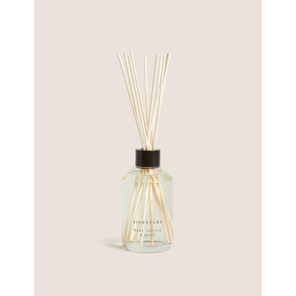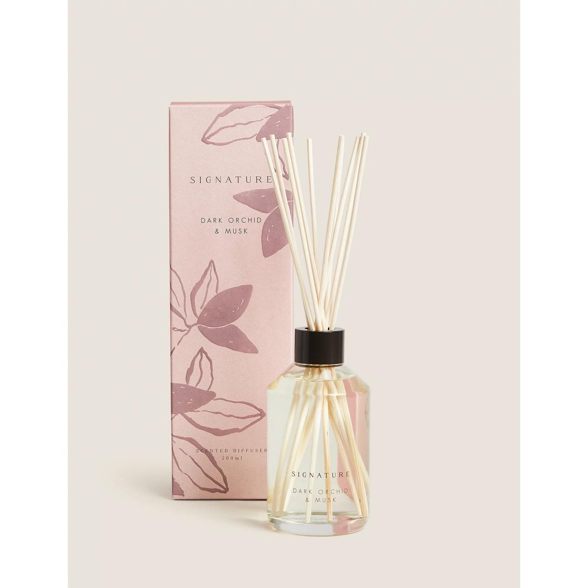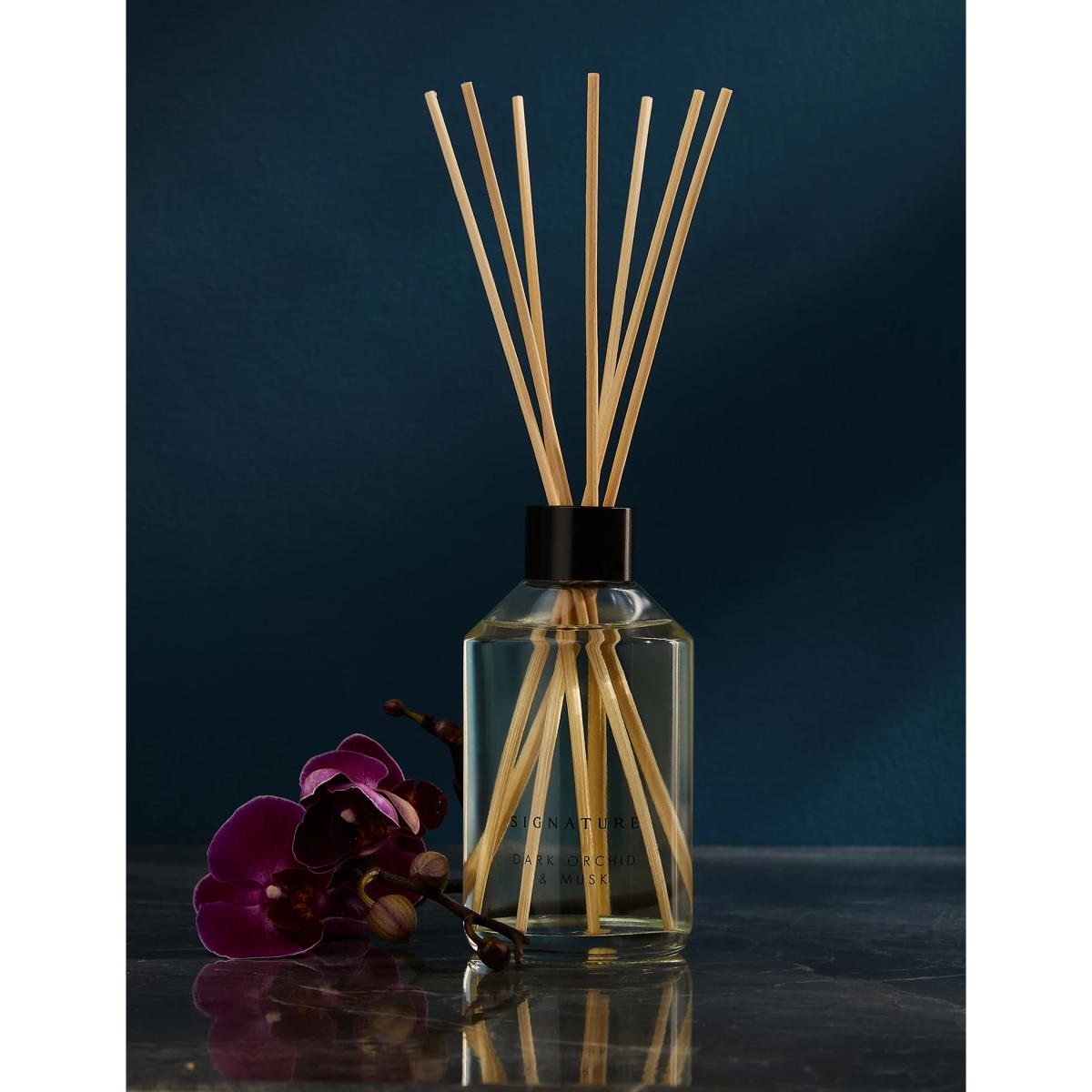This diffuser will add a warm, natural scent to your home. Balancing floral notes of dark orchid with earthy musk and patchouli, it's finished with sweet undertones of amber. Displayed in an elegant glass bottle.