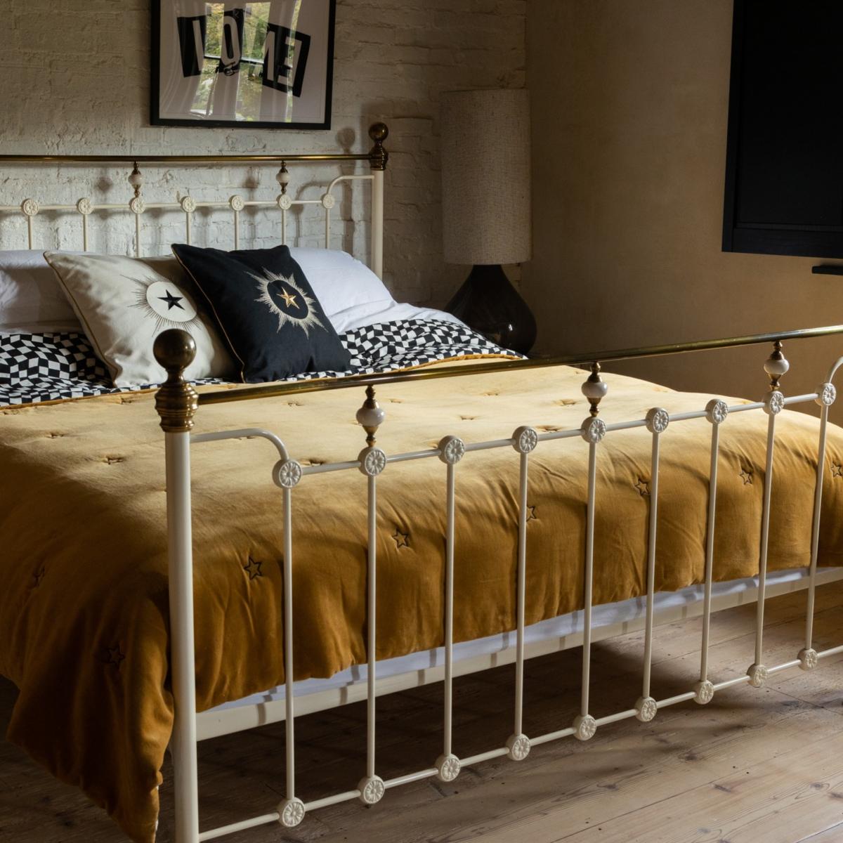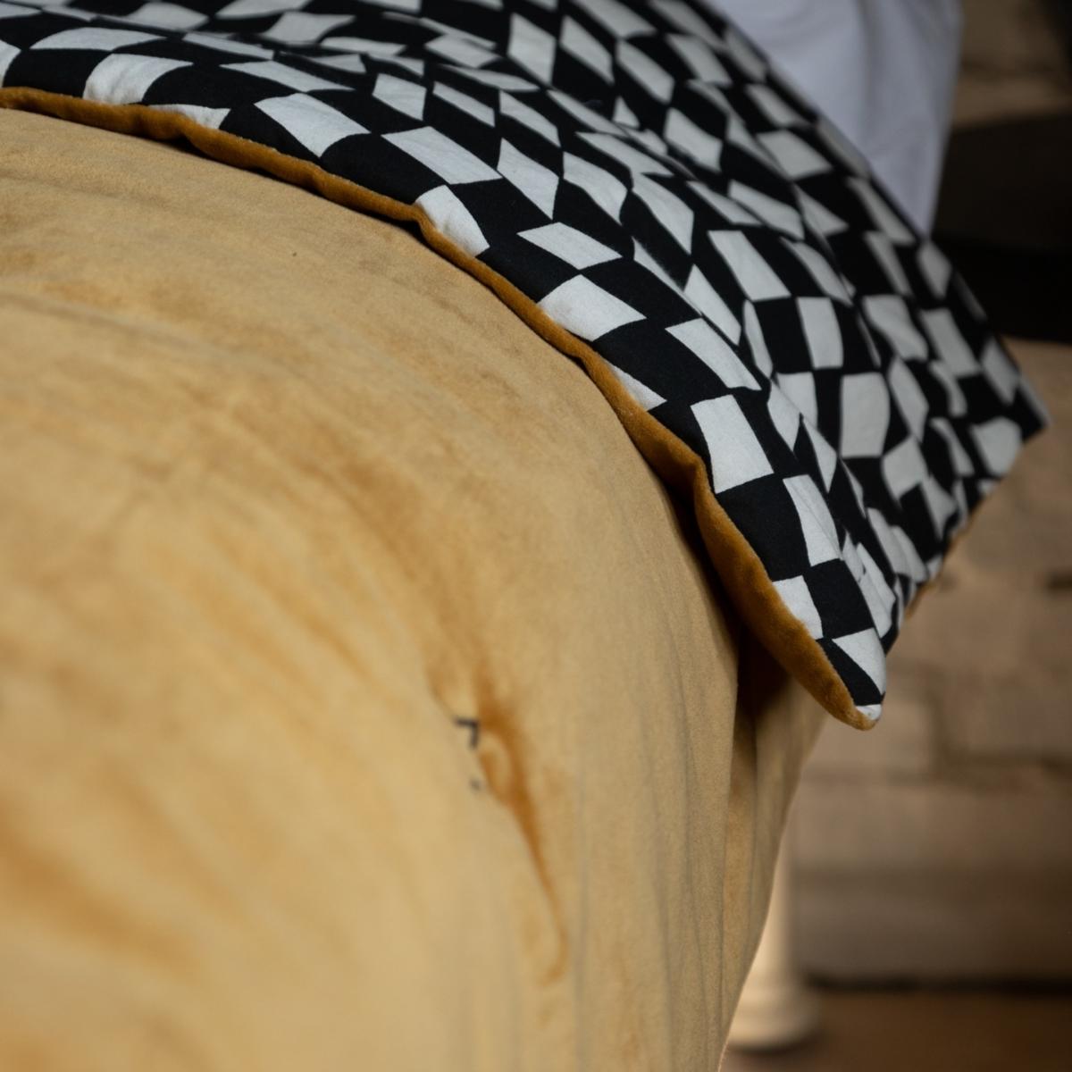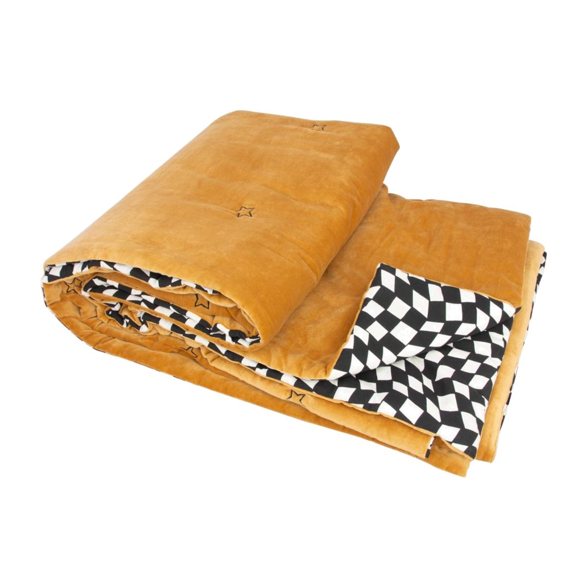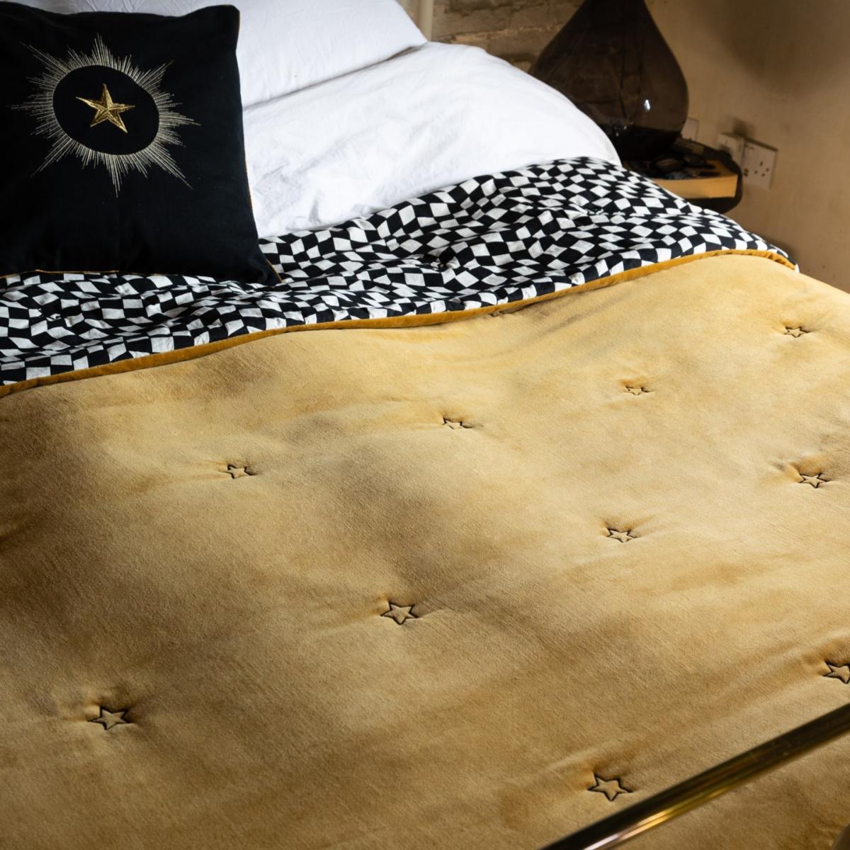 The Signature Gold Velvet Star Quilt is a modern must-have for any cosy bedroom sanctuary. Designed as part of the Rockett St George 15-year Anniversary Collection, the reversible pattern perfectly captures the essence and signature edge of RSG style. Measuring 250cm x 220cm, the fabulous king size quilt is made from cotton with gold velvet on the outside and features an abstract monochrome checkerboard pattern on the inside. As with the rest of the designs in the 15-Year collection, star embroidery is celebrated. Please note that this quilt blanket is spot clean only.