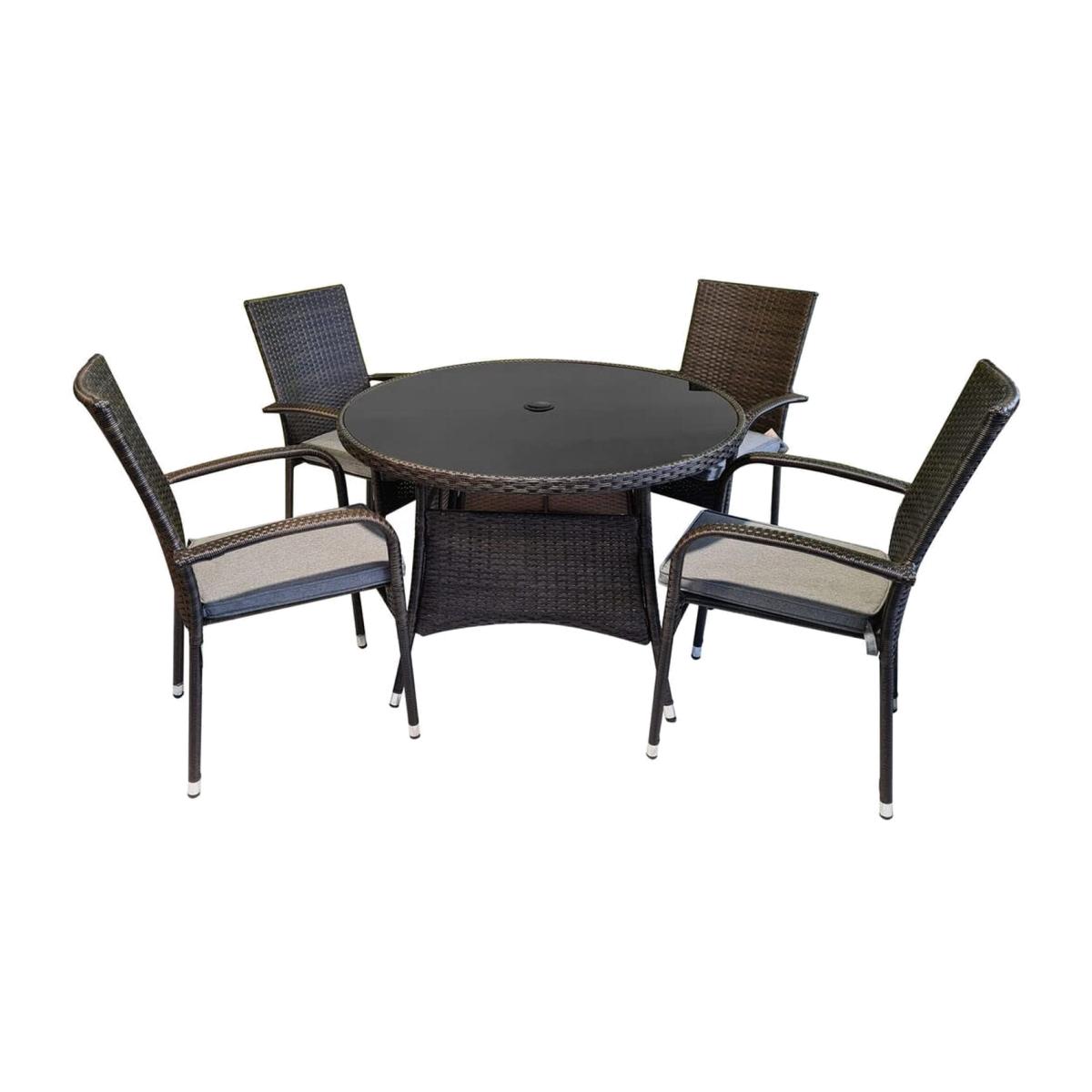 Part of the Heaton range by Signature Homes Gardens, these brown rattan dining sets are the perfect addition to your garden or conservatory this summer. The set comes seat pads and a glass topped table with a parasol hole.