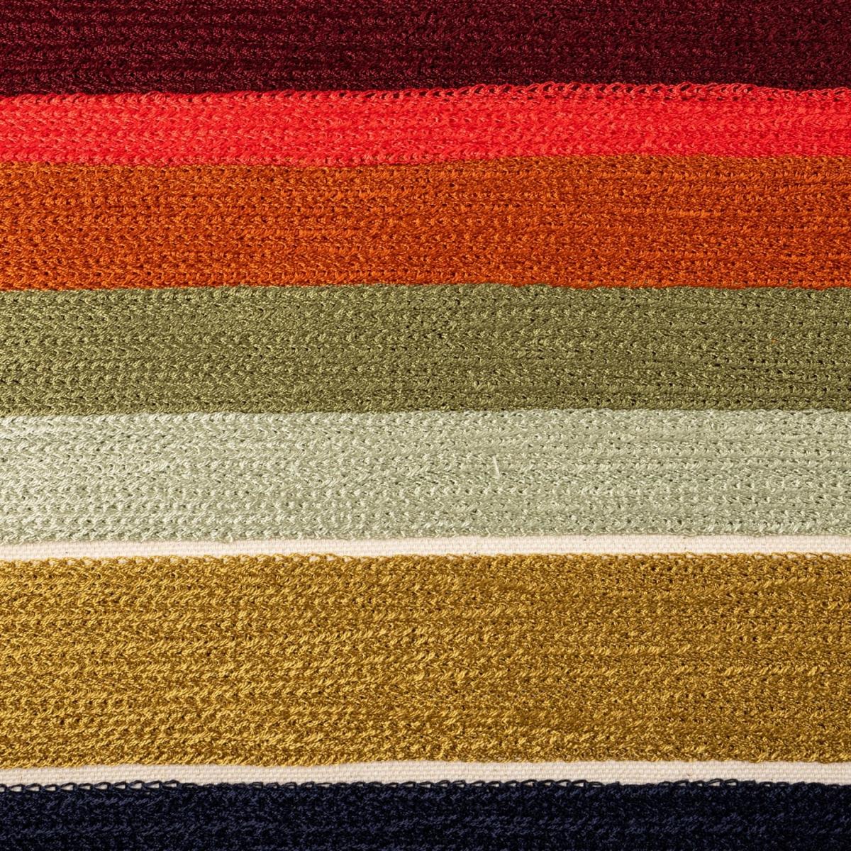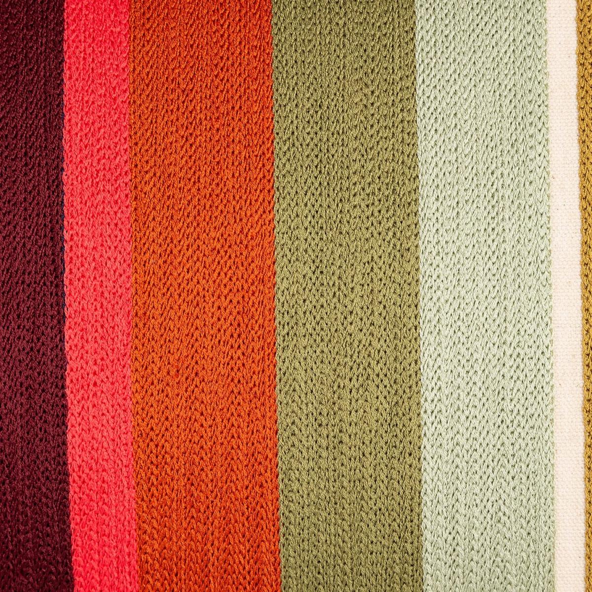 I love this stripe cushion for its vibrant, modern feel, making it a versatile addition to both contemporary and eclectic interiors. Its bold stripes and rich colour palette offer a lively accent, perfect for adding visual interest to neutral sofas or armchairs. It works well paired with textured throws or other patterned textiles to create a layered, inviting look. For practical styling, consider using it to brighten up a monochrome scheme or to introduce a pop of colour to subdued tones. Its rectangular shape is ideal for placing on a sofa, window seat, or even a bed, providing both comfort and style with minimal effort.