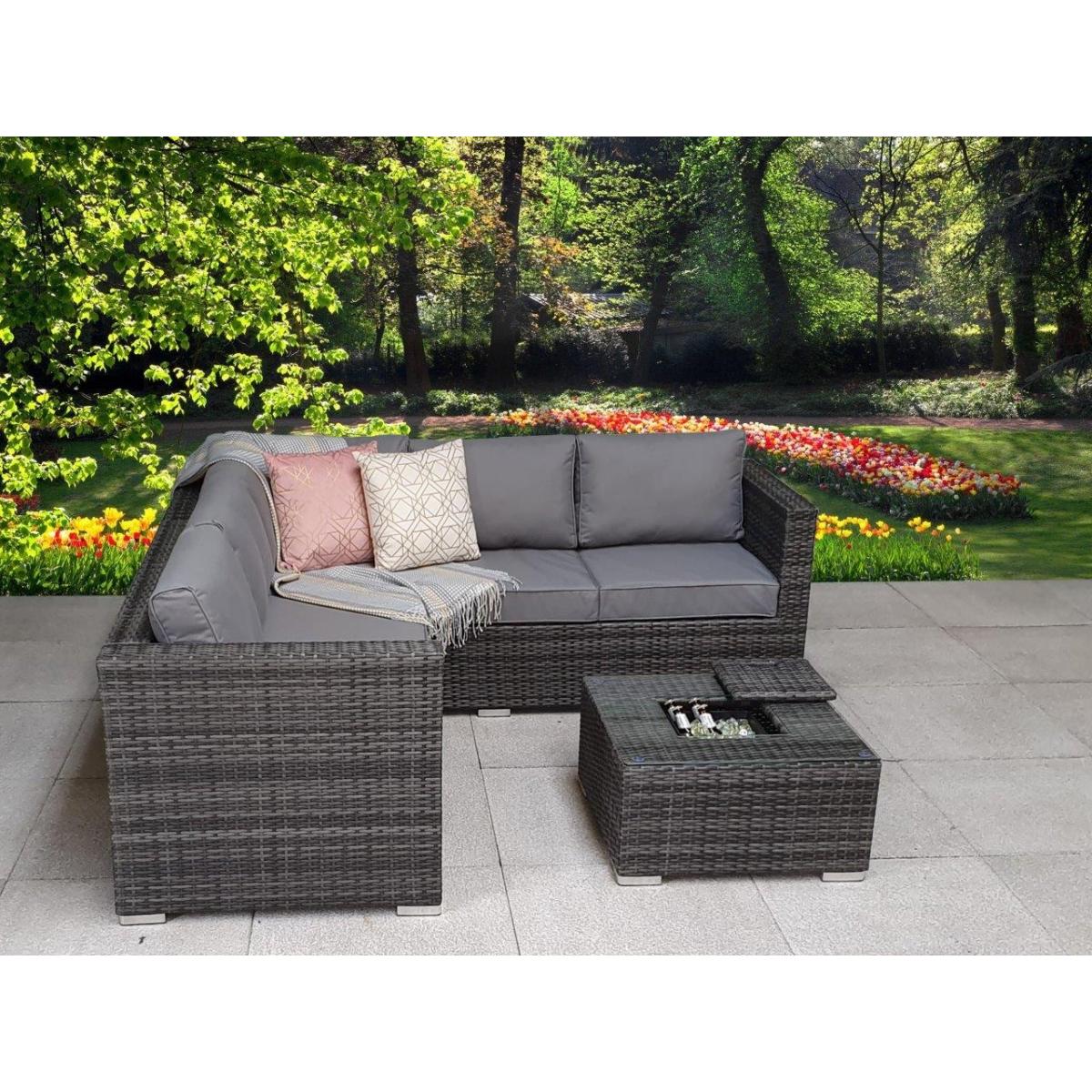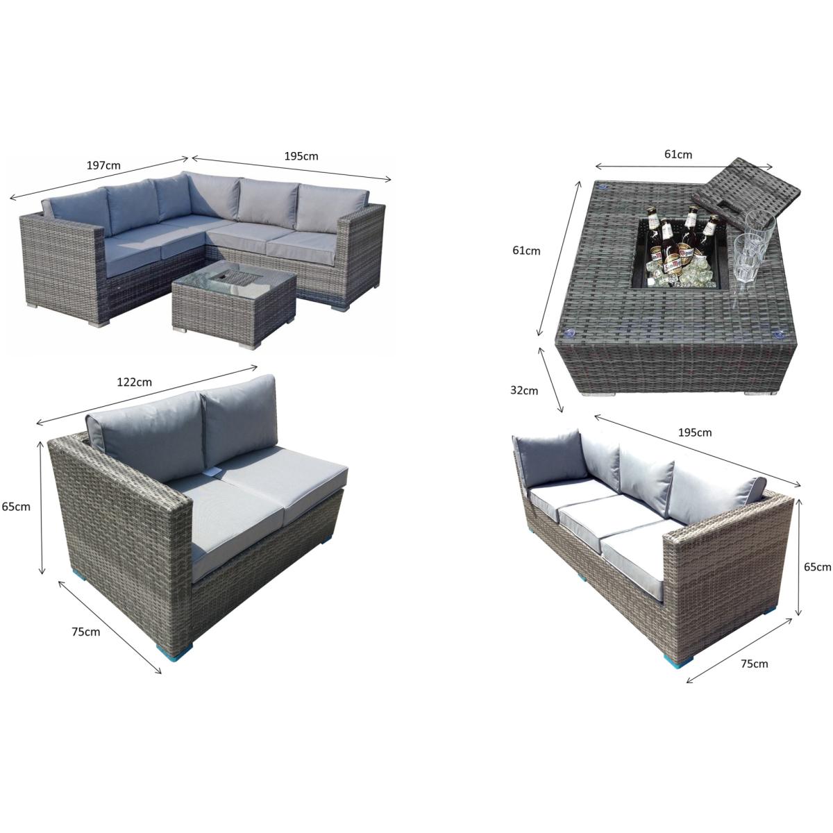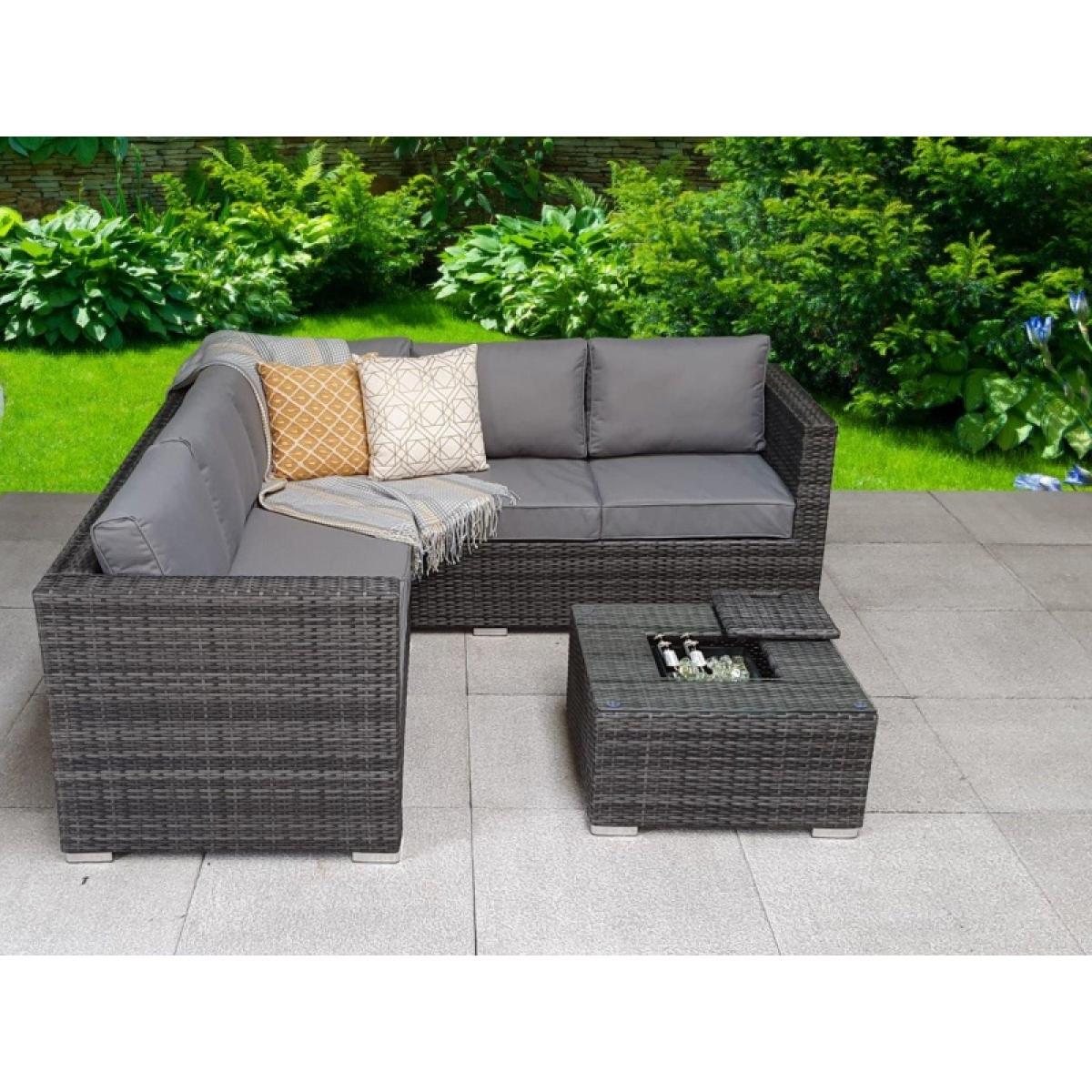 Add a touch of luxury to your outdoor space with the Signature Weave Georgia Corner Sofa with Ice Bucket. Designed for both style and practicality, this elegant set features sturdy aluminium frames wrapped in a grey rattan weave, which is UV treated and weatherproof - ensuring durability and a sophisticated aesthetic. The spacious corner sofa offers ample seating for family and guests, with deep-filled grey/silver shower-proof cushions providing superior comfort for relaxed lounging. A standout feature of this set is the integrated ice bucket, seamlessly built into the table, keeping drinks chilled and within easy reach—perfect for entertaining on warm days. With its weather-resistant materials and contemporary neutral tones, the Georgia Corner Sofa is both stylish and functional, making it an ideal centrepiece for any patio or garden. Whether hosting a summer gathering or enjoying a quiet evening outdoors, this set delivers both elegance and convenience for outdoor living. Partial assembly is required. KEY FEATURES: Set includes: 1 x Corner sofa, 1 x Square Coffee Table with integrated Ice Bucket Tray Solid aluminium frame handcrafted in a beautiful grey rattan weave Complete with luxurious upholstered grey seat and back cushions The cushions are shower proof and come with removable & hand washable covers Rattan weave is UV Treated and is weatherproof Features a unique design coffee table with a central integrated ice bucket Lft of lid on coffee table to reveal the hidden ice bucket and the outer square of the table has a toughened glass top Perfect for up to 5 people DIMENSIONS: Corner Sofa: Height: 65cm Width: 197cm Depth: 195cm Table: Height: 32cm Width: 61cm Depth: 61cm Please note, all screens vary in colour reproduction and whilst every effort has been made to display the colour as accurately as possible it is for guidance only. Scatter cushions and accessories pictured are for demonstration purposes only and are not included. It is not recommended to leave the cushions out exposed to prolonged rain.