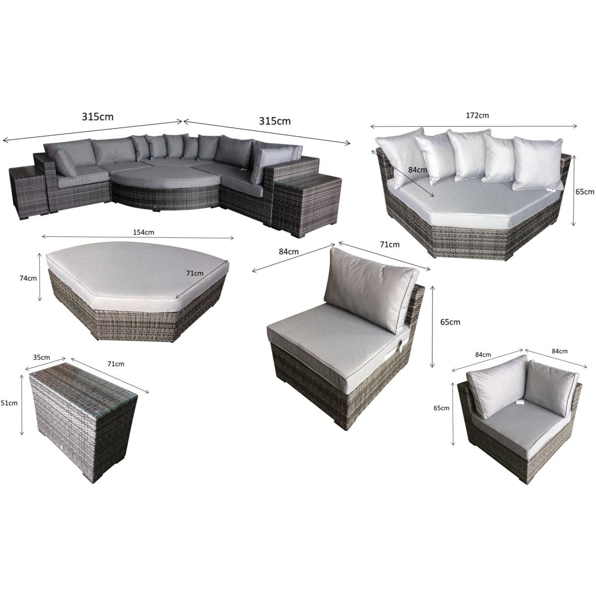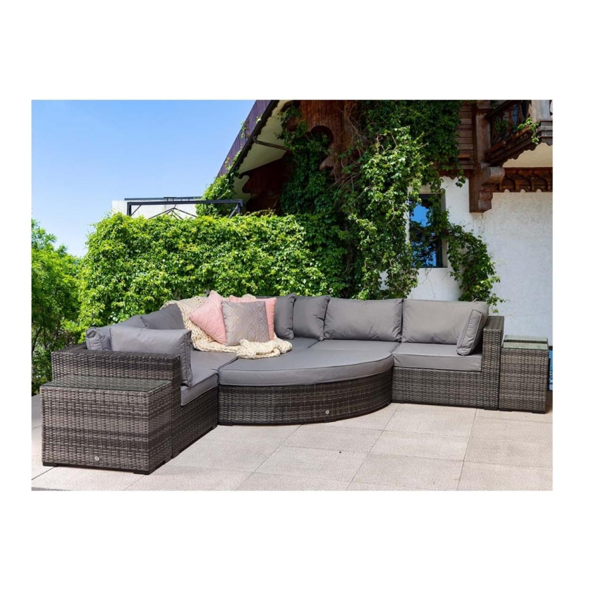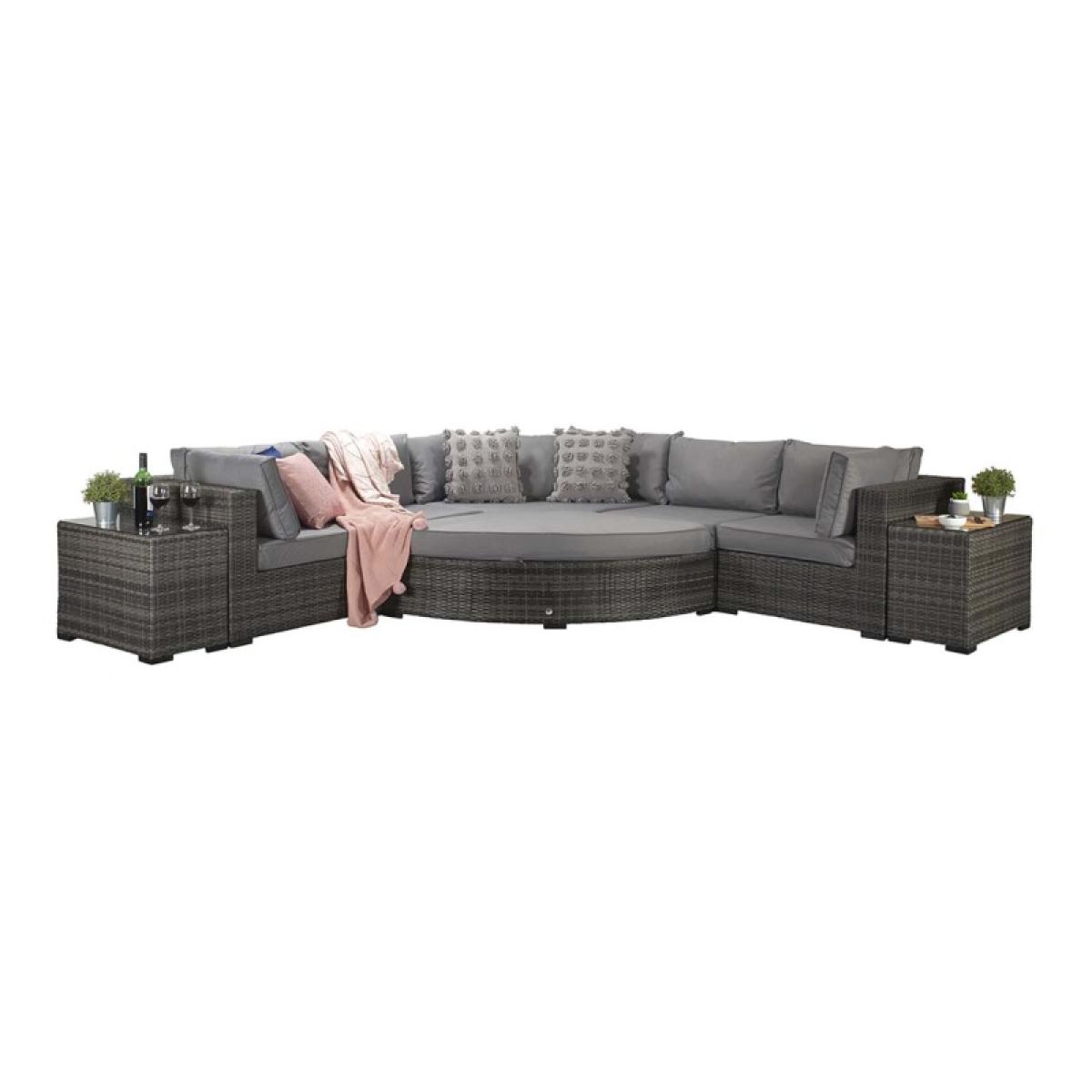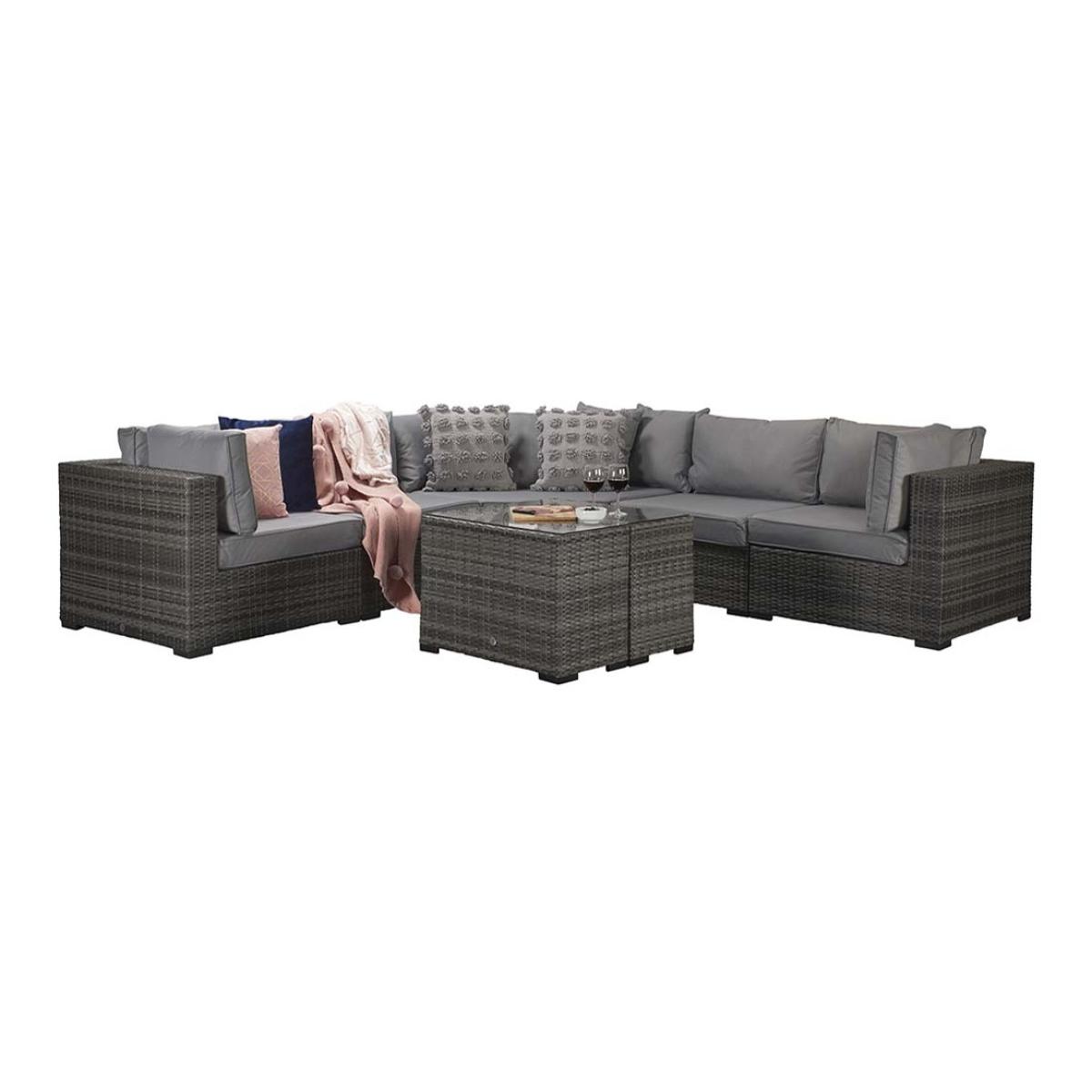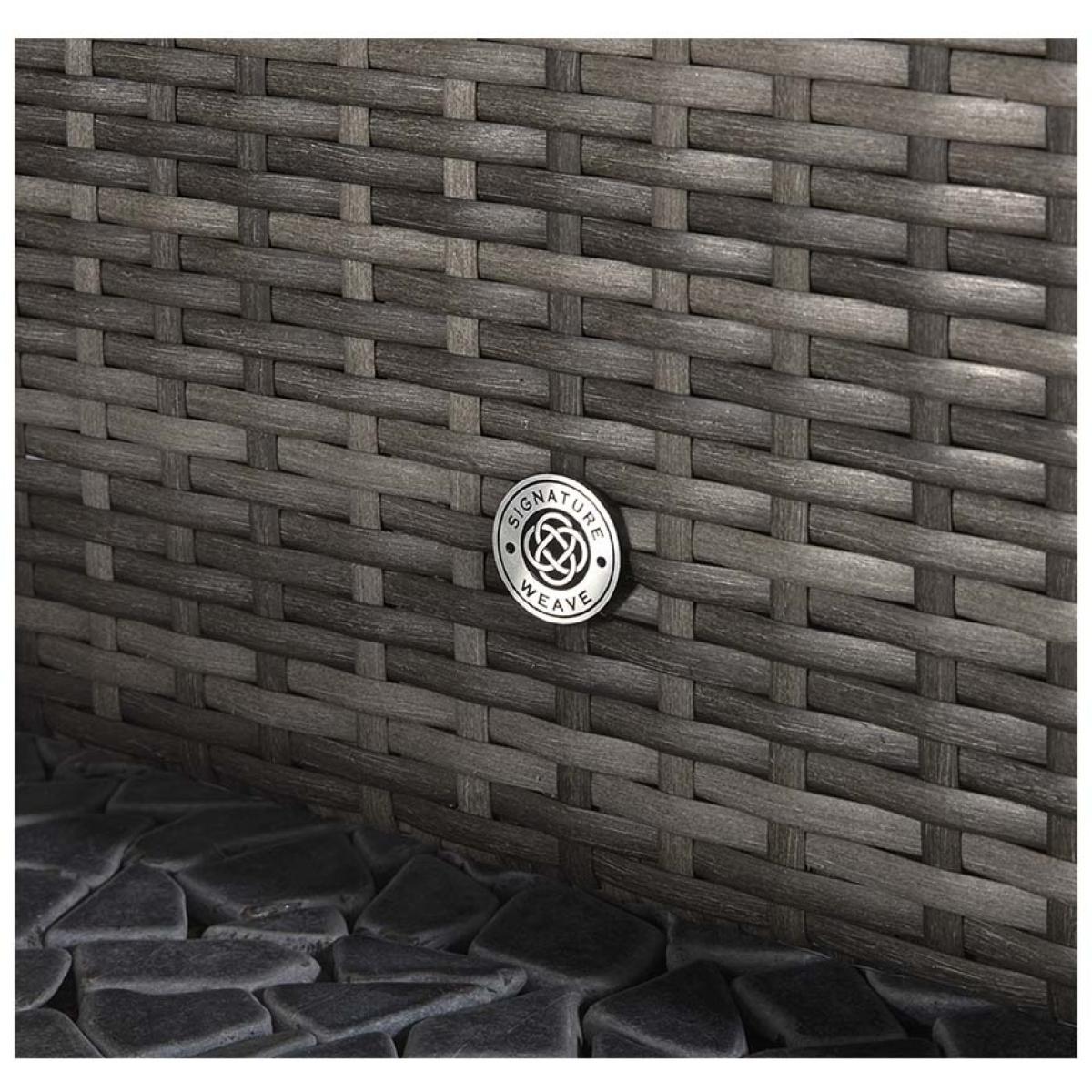 Elevate your outdoor lounging with the Signature Weave Jessica Corner Set, a sleek and versatile garden furniture arrangement designed for modern outdoor living. Finished in a contemporary grey tone, this set combines style, comfort, and practicality to suit a variety of outdoor spaces. Built on durable aluminium frames and finished with a chunky mixed grey weave, the Jessica set is designed to withstand the elements while offering a sophisticated look. The generous corner sofa provides ample seating, complemented by deep grey cushions for maximum comfort. Included in the set are two matching end tables, perfect for holding drinks or decorative touches, and a versatile pouffe that can be used as a footrest or additional seating. Whether enjoying a quiet afternoon in the sun or entertaining friends on a summer evening, the Jessica Corner Set with Pouffe & End Tables is the perfect blend of functionality and contemporary design for any garden or patio setting. Partial assembly is required. KEY FEATURES: Set includes: 4 x sofa sections, 1 x corner sofa section, 1 x chaise with cushion, 2 x side tables with glass, 6 x back cushions, 6 x scatter cushions, 5 x seat cushions Solid aluminium frame handcrafted in a beautiful natural rattan weave Complete with luxurious upholstered seat & back cushions Shower proof cushions that come with removable & hand washable covers UV treated waterproof wicker High strength powder-coated aluminium frame Perfect for up to 6 people DIMENSIONS: Corner Sofa: Height: 65cm Width: 315cm Depth: 315cm Poof: Height: 74cm Width: 154cm Depth: 71cm Table: Height: 51cm Width: 35cm Depth: 71cm Please note, all screens vary in colour reproduction and whilst every effort has been made to display the colour as accurately as possible it is for guidance only. Scatter cushions and accessories pictured are for demonstration purposes only and are not included. It is not recommended to leave the cushions out exposed to prolonged rain.