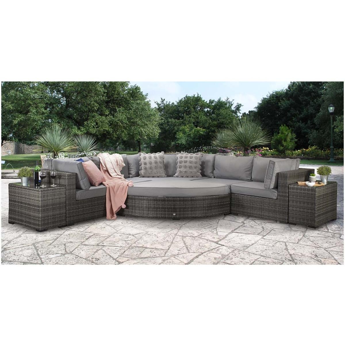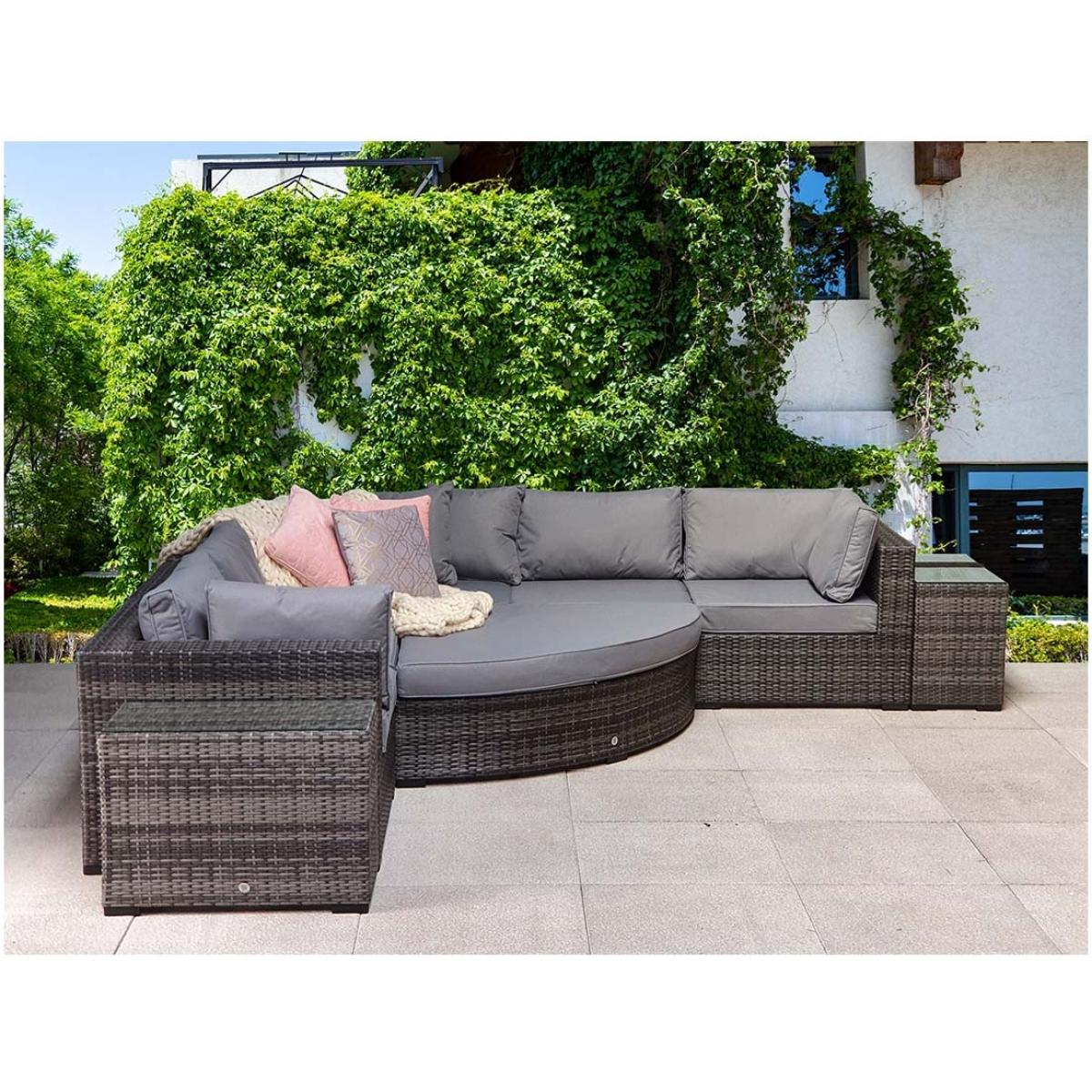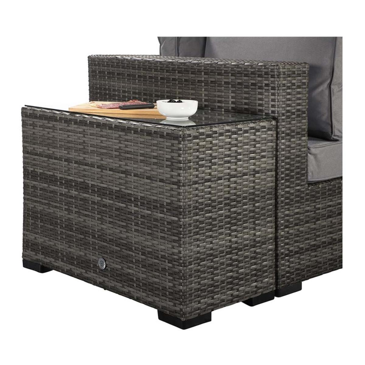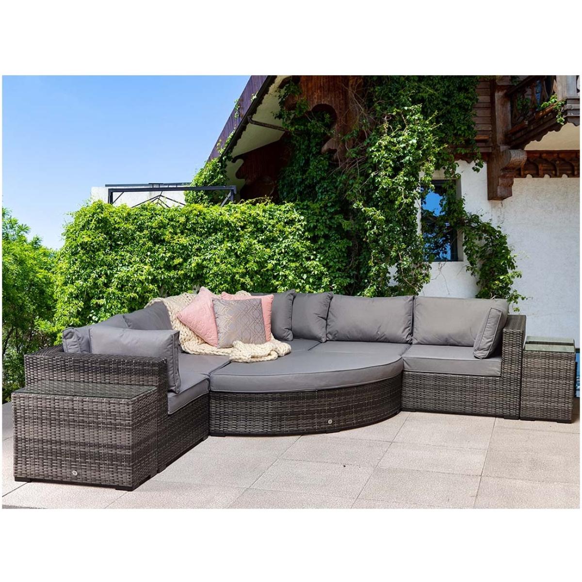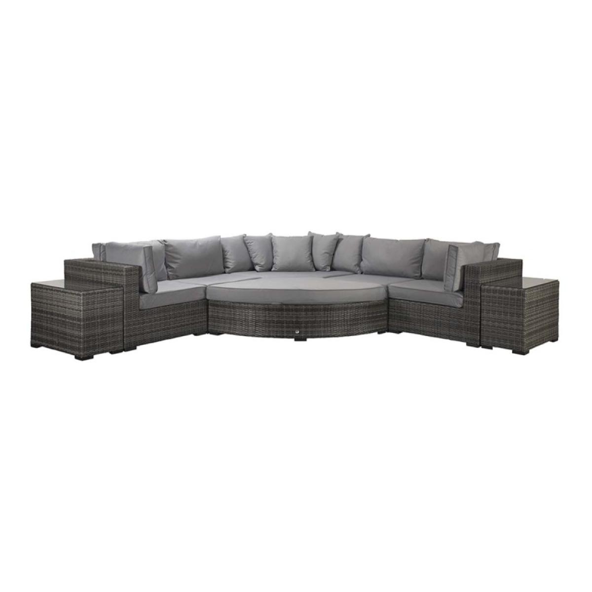 Elevate your outdoor lounging with the Signature Weave Jessica Corner Set, a sleek and versatile garden furniture arrangement designed for modern outdoor living. Finished in a contemporary grey tone, this set combines style, comfort, and practicality to suit a variety of outdoor spaces. Built on durable aluminium frames and finished with a chunky mixed grey weave, the Jessica set is designed to withstand the elements while offering a sophisticated look. The generous corner sofa provides ample seating, complemented by deep grey cushions for maximum comfort. Included in the set are two matching end tables, perfect for holding drinks or decorative touches, and a versatile pouffe that can be used as a footrest or additional seating. Whether enjoying a quiet afternoon in the sun or entertaining friends on a summer evening, the Jessica Corner Set with Pouffe & End Tables is the perfect blend of functionality and contemporary design for any garden or patio setting. Partial assembly is required. KEY FEATURES: Set includes: 4 x sofa sections, 1 x corner sofa section, 1 x chaise with cushion, 2 x side tables with glass, 6 x back cushions, 6 x scatter cushions, 5 x seat cushions Solid aluminium frame handcrafted in a beautiful natural rattan weave Complete with luxurious upholstered seat & back cushions Shower proof cushions that come with removable & hand washable covers UV treated waterproof wicker High strength powder-coated aluminium frame Perfect for up to 6 people DIMENSIONS: Corner Sofa: Height: 65cm Width: 315cm Depth: 315cm Poof: Height: 74cm Width: 154cm Depth: 71cm Table: Height: 51cm Width: 35cm Depth: 71cm Please note, all screens vary in colour reproduction and whilst every effort has been made to display the colour as accurately as possible it is for guidance only. Scatter cushions and accessories pictured are for demonstration purposes only and are not included. It is not recommended to leave the cushions out exposed to prolonged rain.