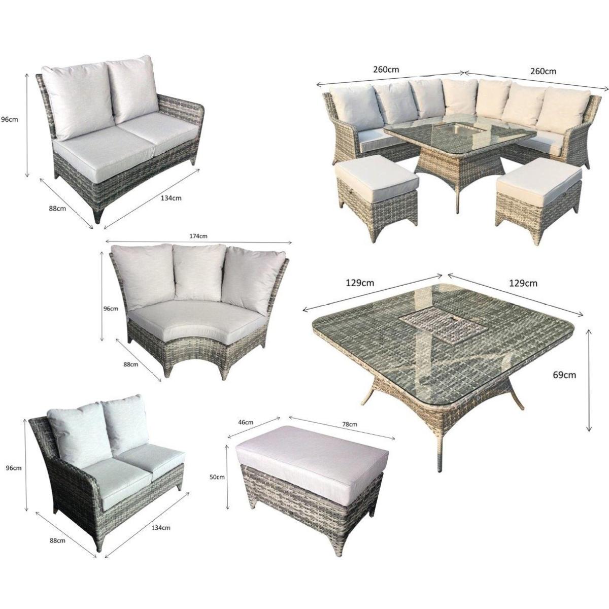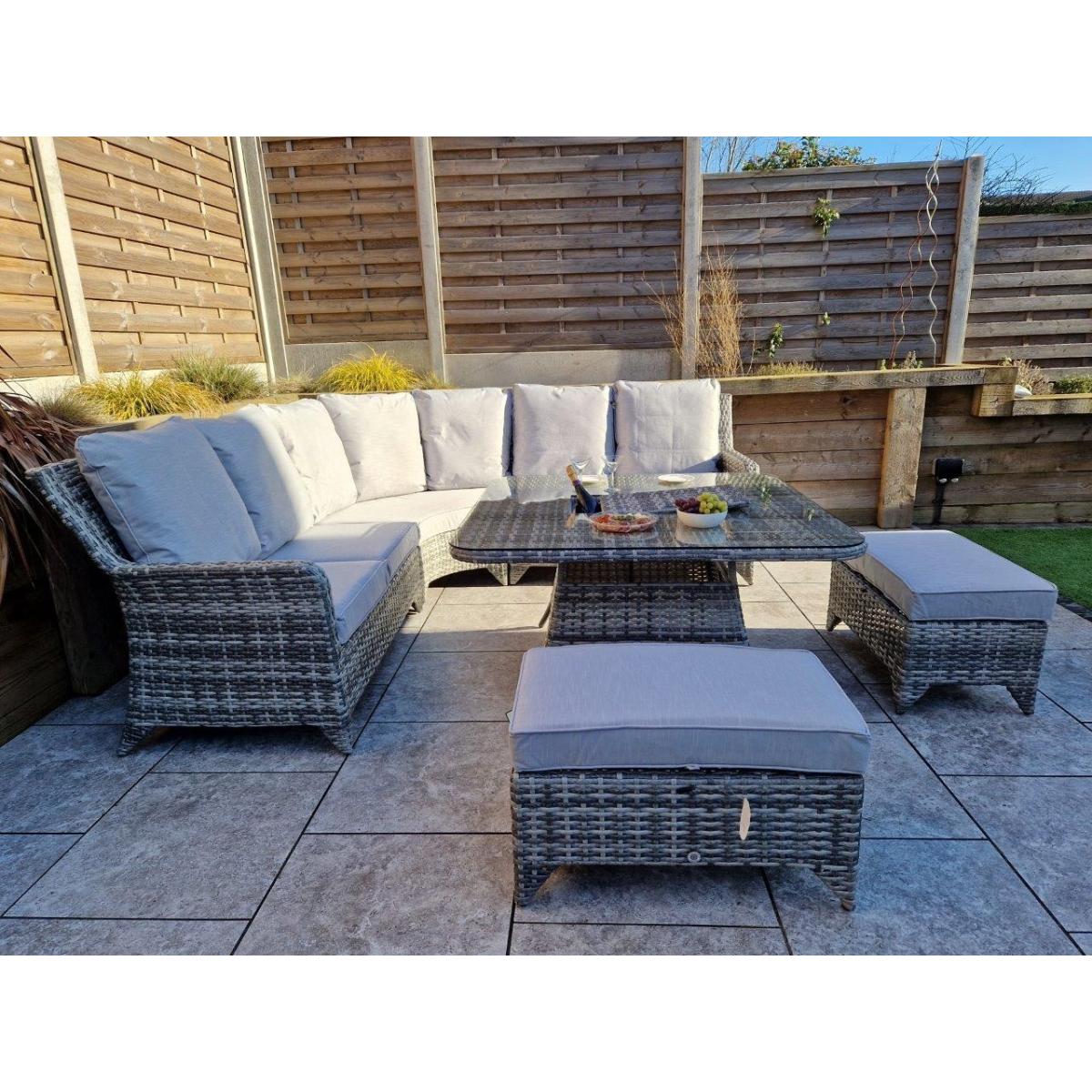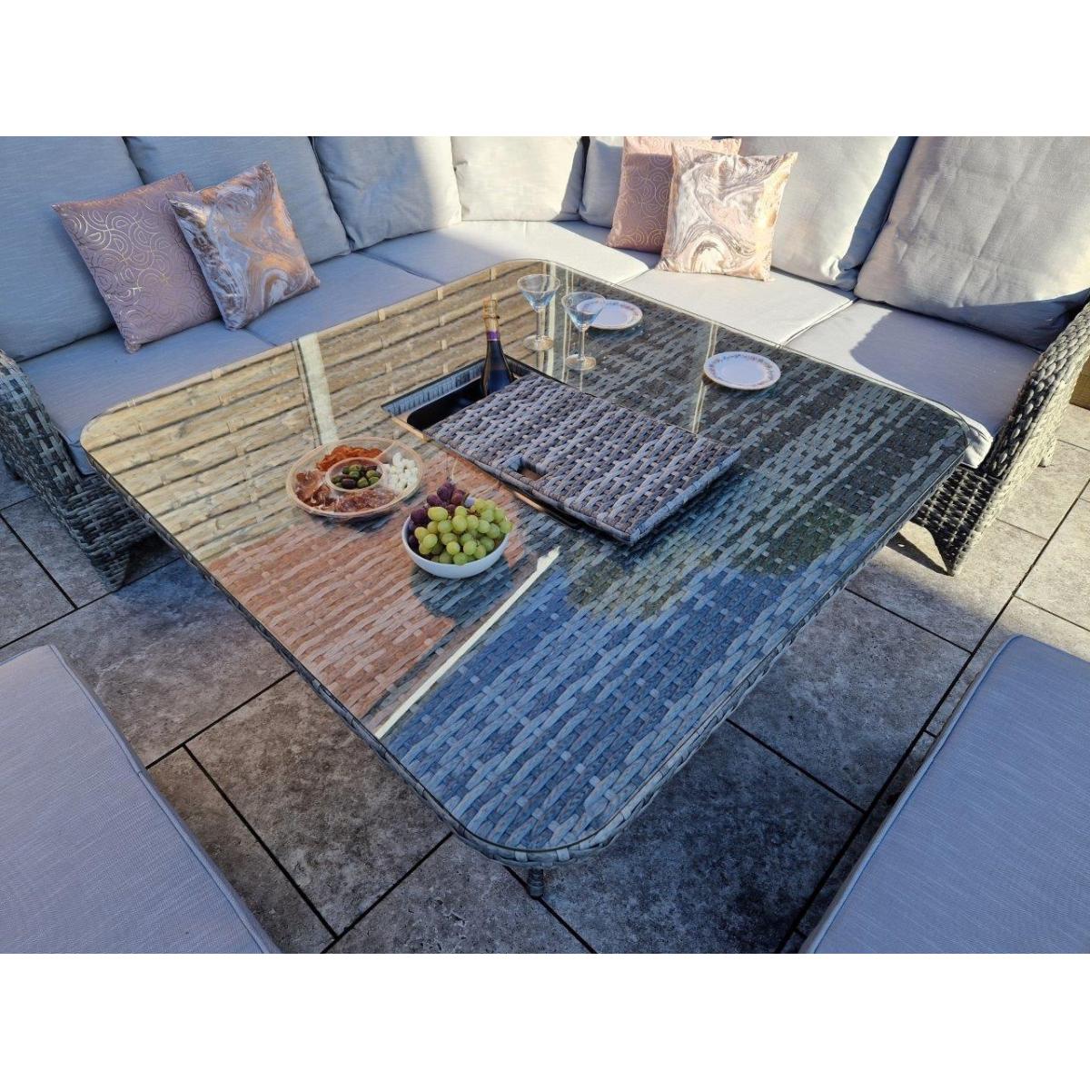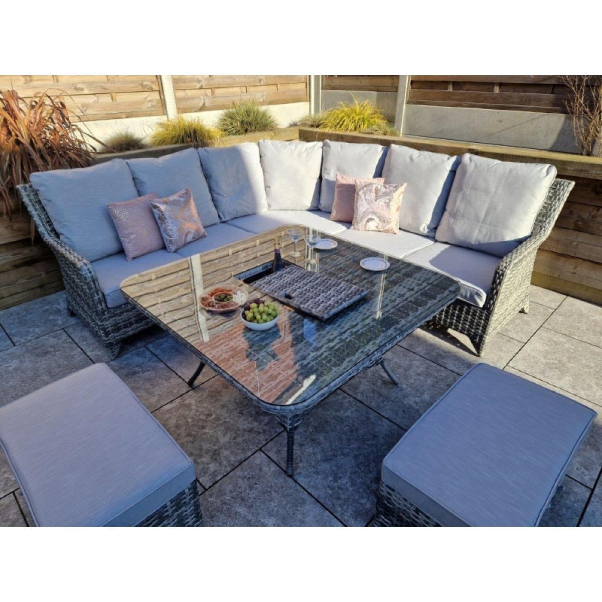 Create a stylish and comfortable outdoor space with the Signature Weave Sarah Corner Set, a stunning and functional addition to any garden or patio. Designed for comfort and durability, this contemporary rattan furniture set features a spacious corner sofa with plush, deep-filled cushions for ultimate relaxation. Crafted from high-quality, weather-resistant rattan in an elegant grey finish, this set is built to withstand the elements while maintaining its sophisticated look. The sturdy tempered glass-topped table provides ample space for drinks and snacks, making it perfect for social gatherings or peaceful outdoor lounging. The built-in ice bucket adds a touch of luxury, keeping your drinks chilled while you entertain guests. Partial assembly is required: simply bolt the legs onto the table on arrival. KEY FEATURES: Set Includes: 1 x Corner Section, 2 x Sofa Sections, 1 x Dining Table with Ice Bucket, 2 x Ottomans Unique High Backed Rattan Corner Sofa Hand crafted in a beautiful chunky grey weave - UV treated and weatherproof Toughened Glass Top Rectangular Table with built-in Ice Bucket Deep Filled Seat, Back & Stool Cushions High quality, soft touch, removable, hand washable light grey/silver cushion covers Perfect for up to 6/7 people to seat comfortably. DIMENSIONS: Corner Sofa: Height: 96cm Width: 260cm Depth: 260cm Seat Depth: 88cm Table: Height: 69cm Width: 129cm Depth: 129cm Stools: Height: 50cm Width: 78cm Depth: 46cm Please note, all screens vary in colour reproduction and whilst every effort has been made to display the colour as accurately as possible it is for guidance only. Scatter cushions and accessories pictured are for demonstration purposes only and are not included.