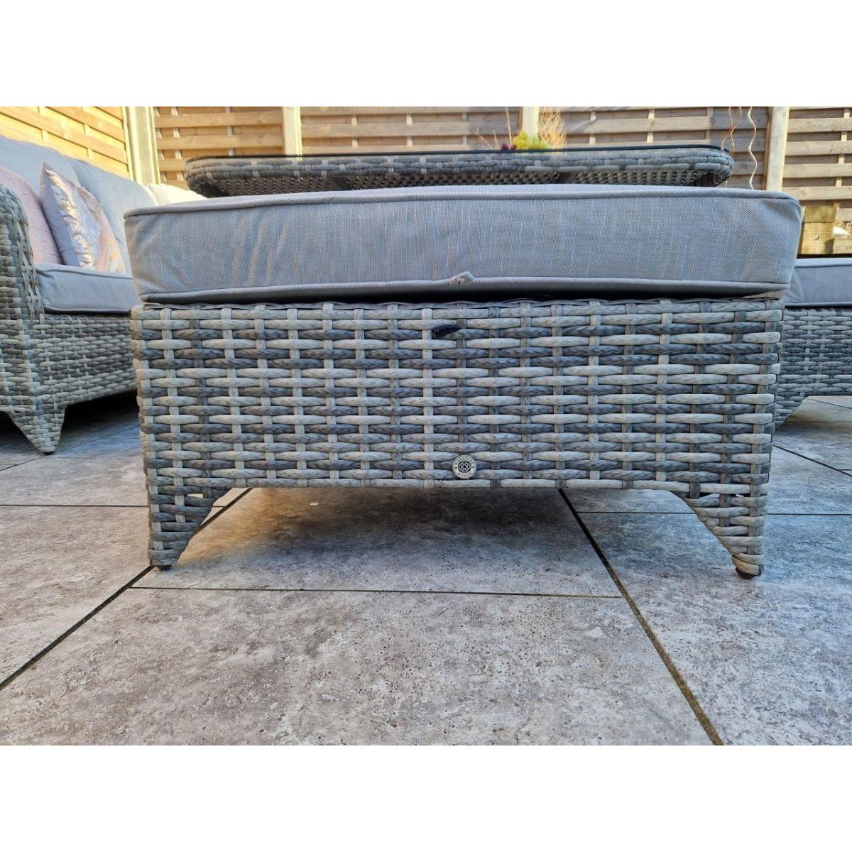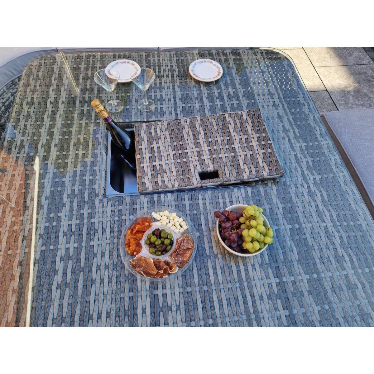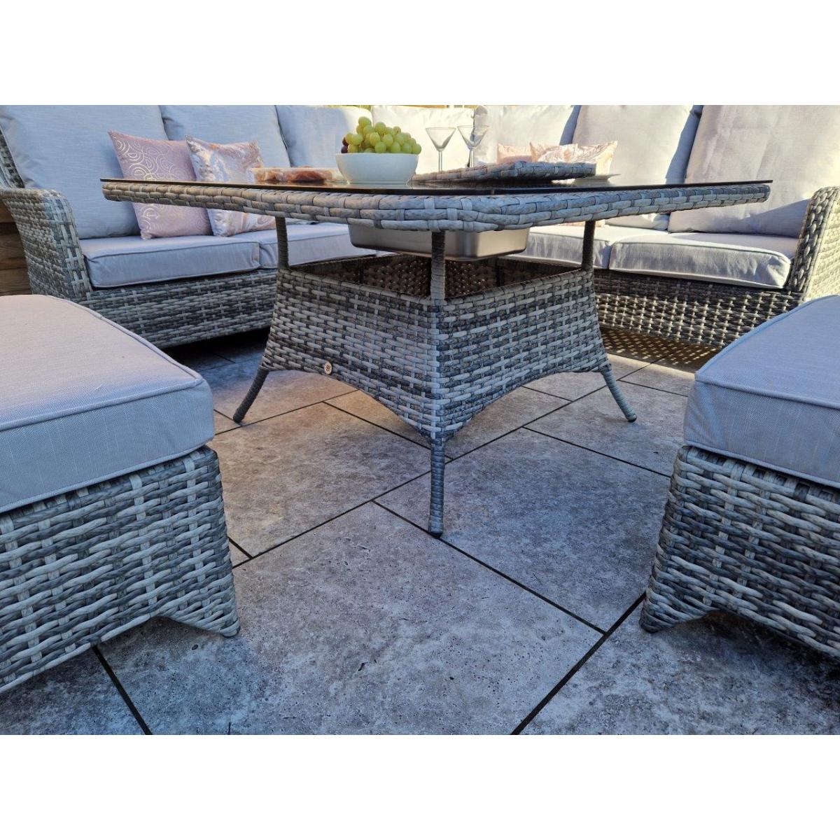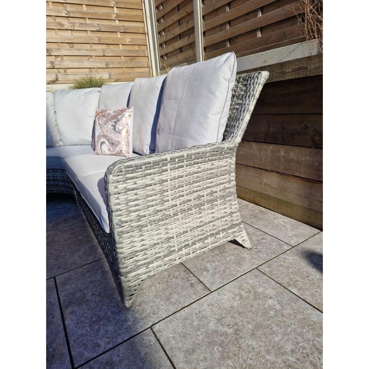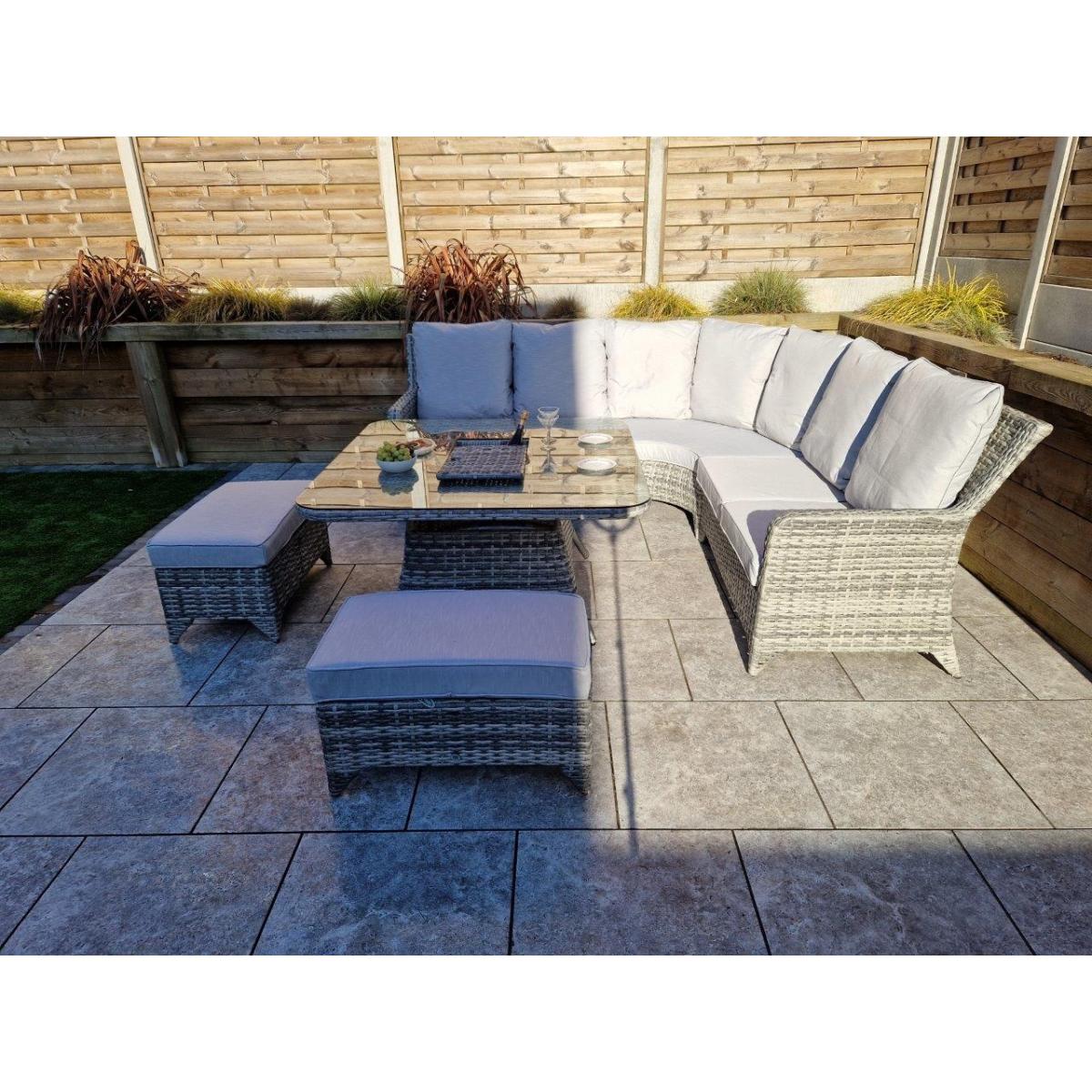 Create a stylish and comfortable outdoor space with the Signature Weave Sarah Corner Set, a stunning and functional addition to any garden or patio. Designed for comfort and durability, this contemporary rattan furniture set features a spacious corner sofa with plush, deep-filled cushions for ultimate relaxation. Crafted from high-quality, weather-resistant rattan in an elegant grey finish, this set is built to withstand the elements while maintaining its sophisticated look. The sturdy tempered glass-topped table provides ample space for drinks and snacks, making it perfect for social gatherings or peaceful outdoor lounging. The built-in ice bucket adds a touch of luxury, keeping your drinks chilled while you entertain guests. Partial assembly is required: simply bolt the legs onto the table on arrival. KEY FEATURES: Set Includes: 1 x Corner Section, 2 x Sofa Sections, 1 x Dining Table with Ice Bucket, 2 x Ottomans Unique High Backed Rattan Corner Sofa Hand crafted in a beautiful chunky grey weave - UV treated and weatherproof Toughened Glass Top Rectangular Table with built-in Ice Bucket Deep Filled Seat, Back & Stool Cushions High quality, soft touch, removable, hand washable light grey/silver cushion covers Perfect for up to 6/7 people to seat comfortably. DIMENSIONS: Corner Sofa: Height: 96cm Width: 260cm Depth: 260cm Seat Depth: 88cm Table: Height: 69cm Width: 129cm Depth: 129cm Stools: Height: 50cm Width: 78cm Depth: 46cm Please note, all screens vary in colour reproduction and whilst every effort has been made to display the colour as accurately as possible it is for guidance only. Scatter cushions and accessories pictured are for demonstration purposes only and are not included.